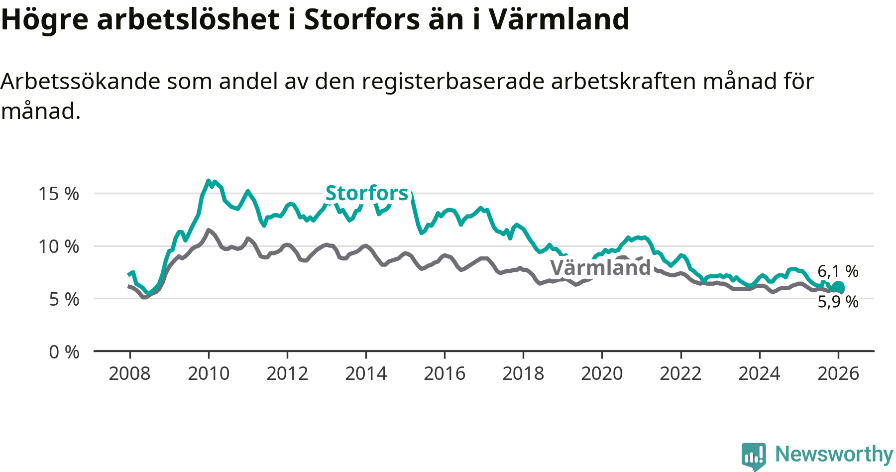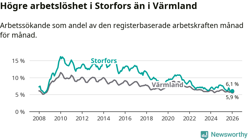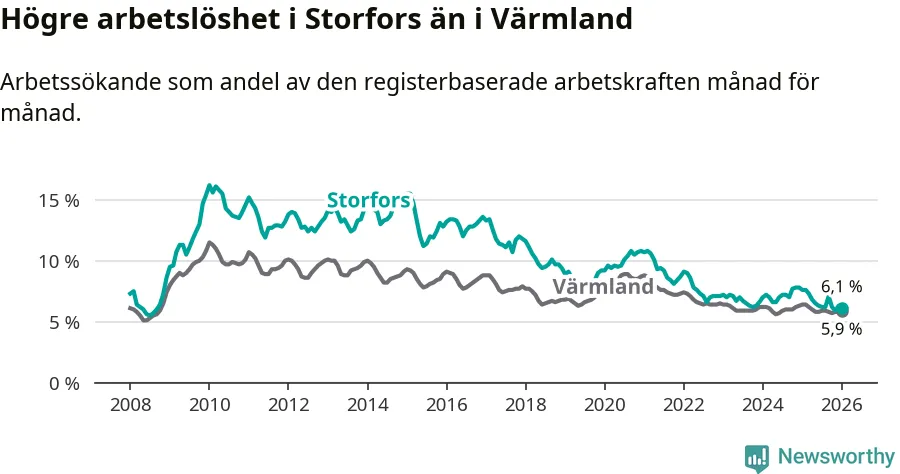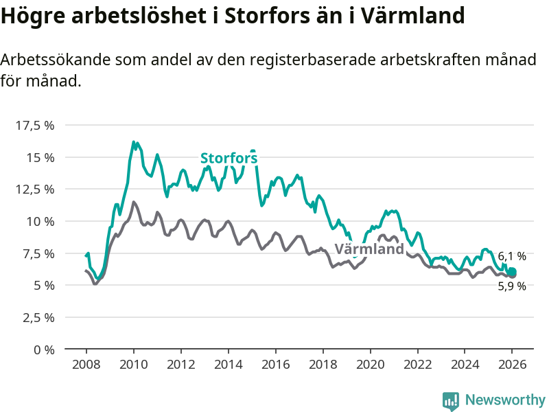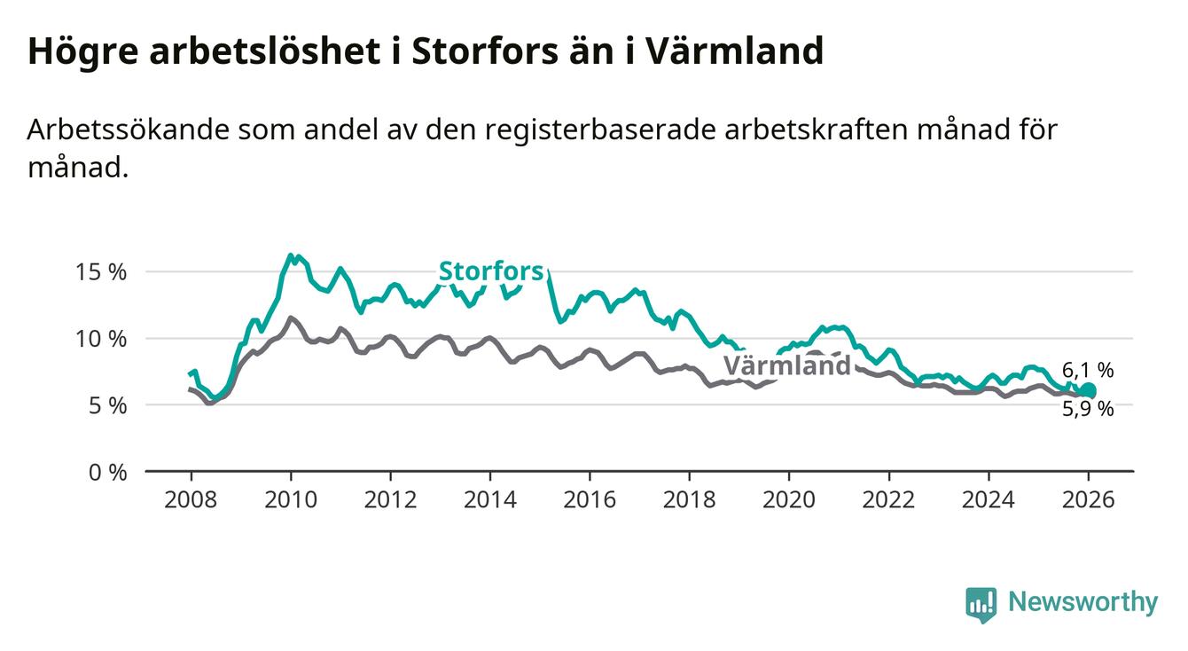 Under januari månad rapporterade Storfors kommun en total arbetslöshet på 6,1 procent. Det är en minskning jämfört med samma tidpunkt i fjol (−1,5 procentenheter). Även i Värmlands län sjunker arbetslösheten .