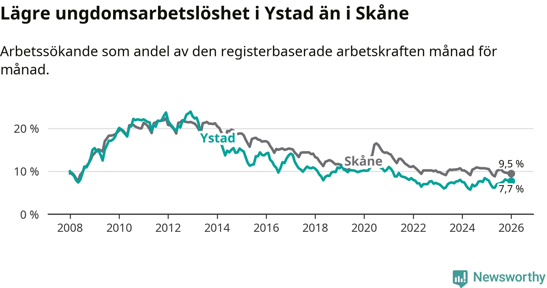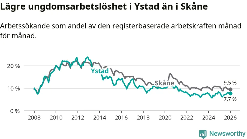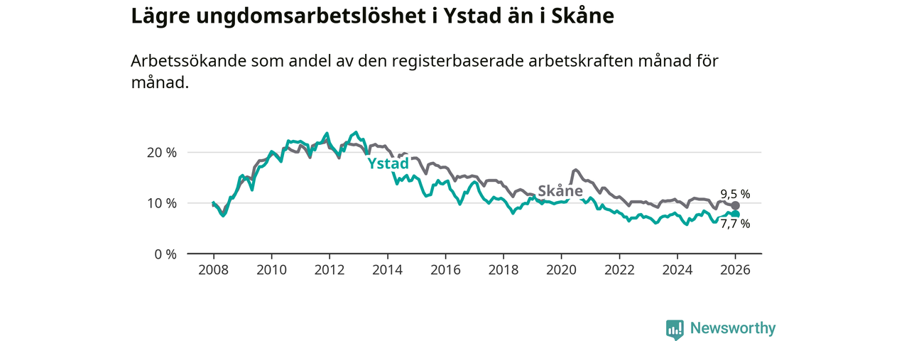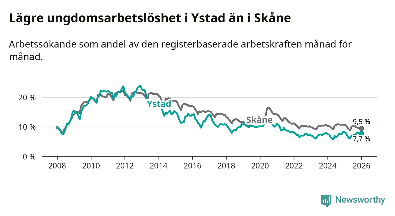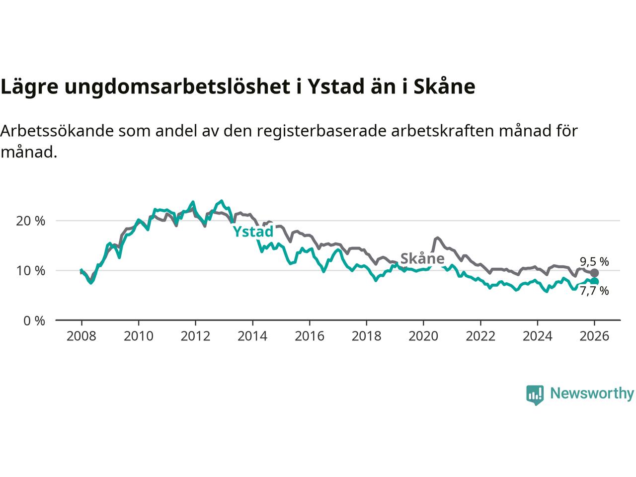 Precis som den totala arbetslösheten ligger ungdomsarbetslösheten i Ystad lägre än i Skåne som helhet. Skillnaden mellan kommunen och länet är 1,8 procentenheter.