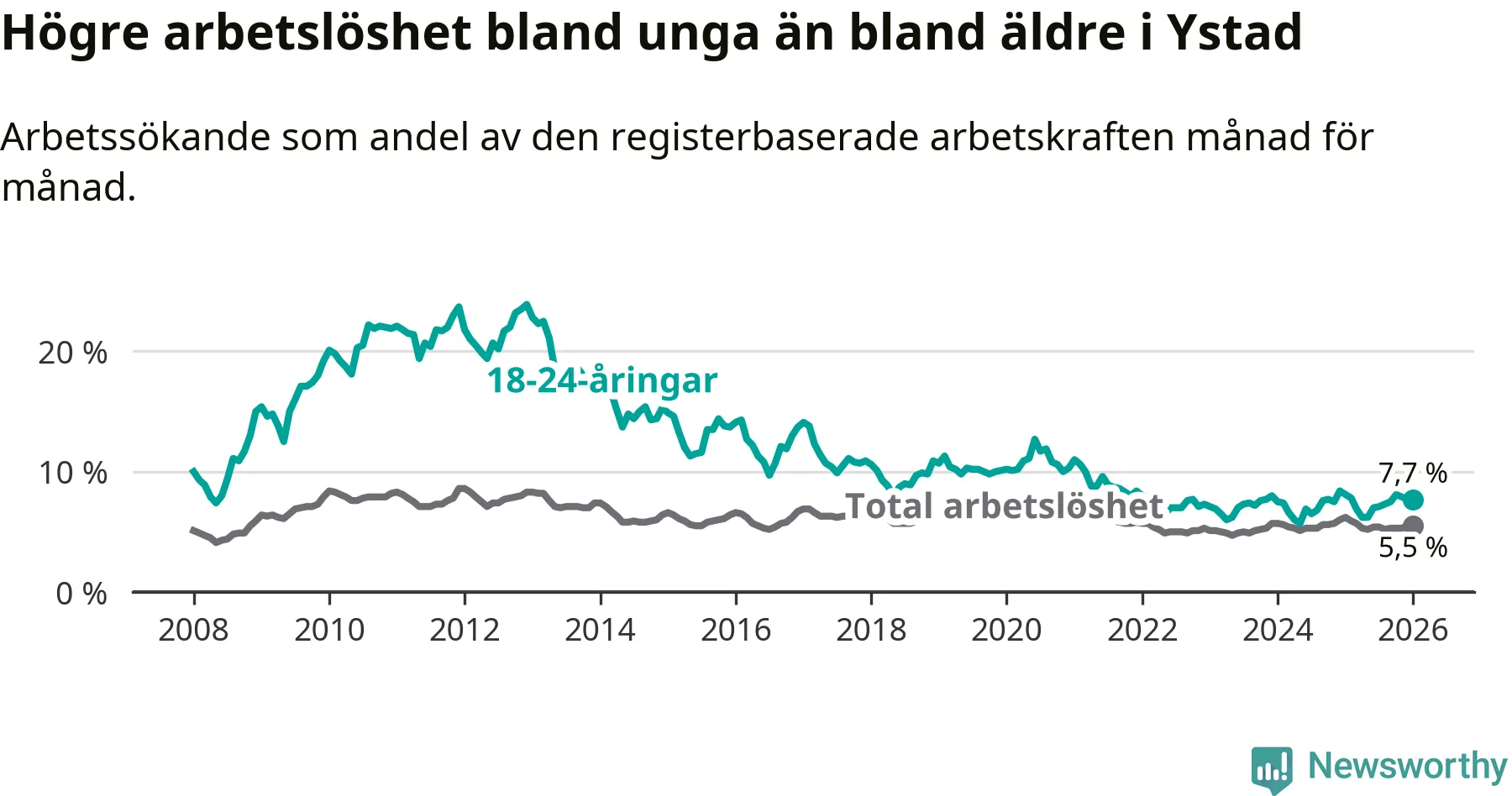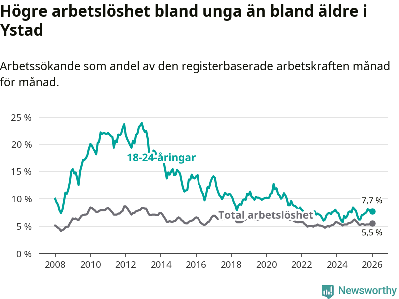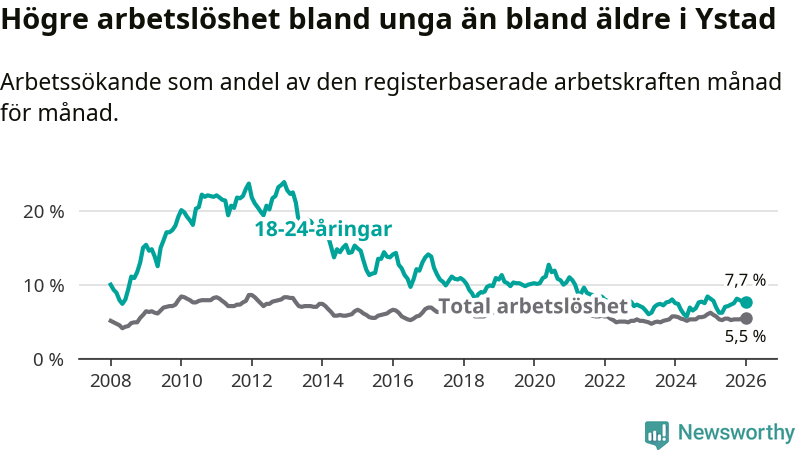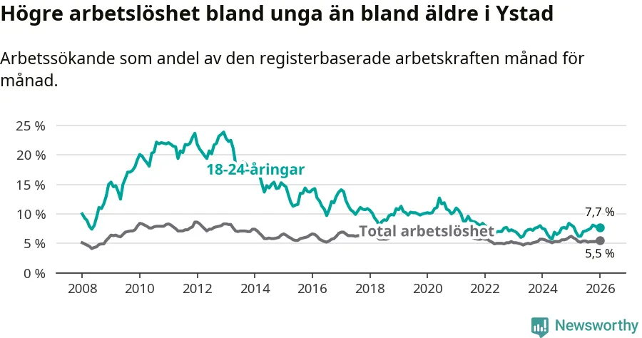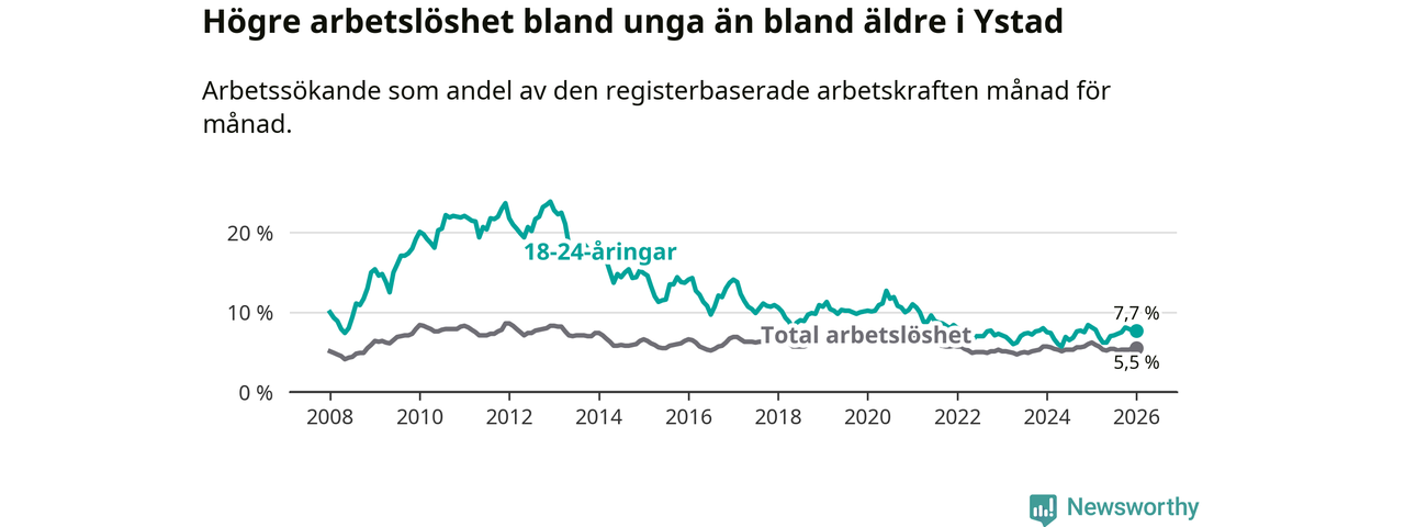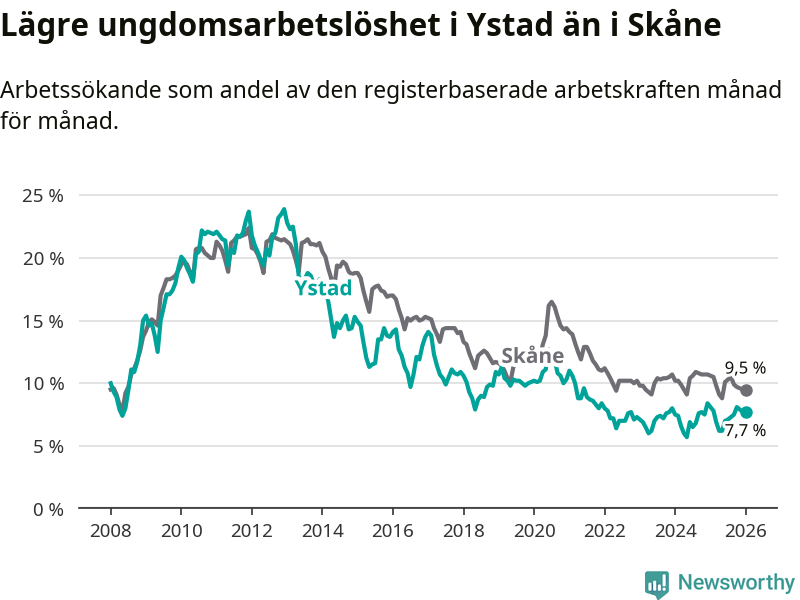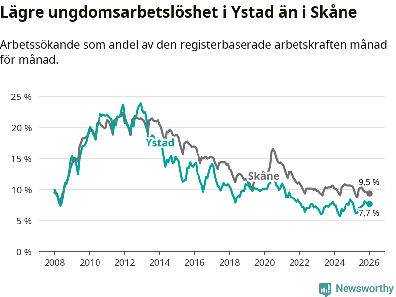 Precis som den totala arbetslösheten ligger ungdomsarbetslösheten i Ystad lägre än i Skåne som helhet. Skillnaden mellan kommunen och länet är 1,8 procentenheter.
