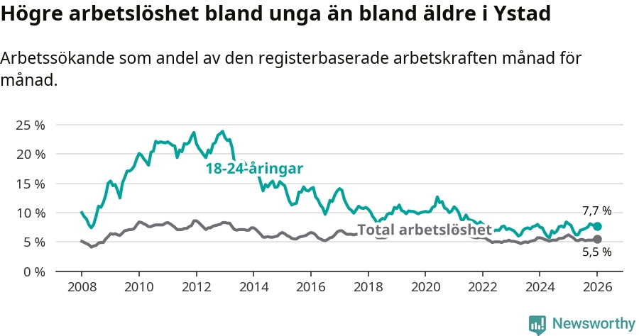 Precis som den totala arbetslösheten sjunker arbetslösheten bland unga (−0,4 procentenheter). I januari var 7,7 procent av 18–24-åringarna inskrivna som arbetssökande (motsvarande 114 personer). Mäter vi antalet inskrivna ser vi en minskning med tio personer på ett års sikt.
