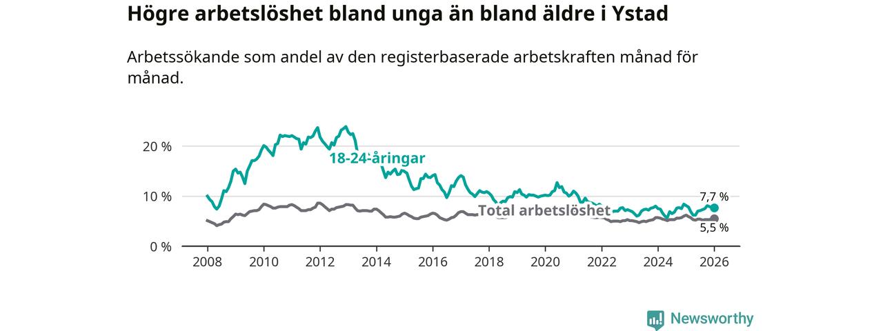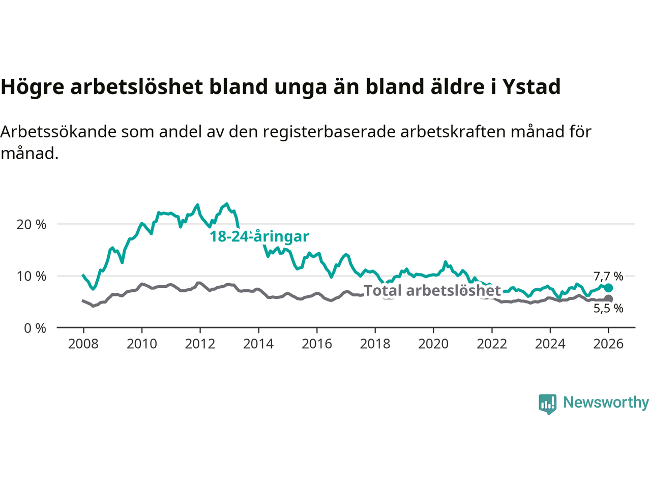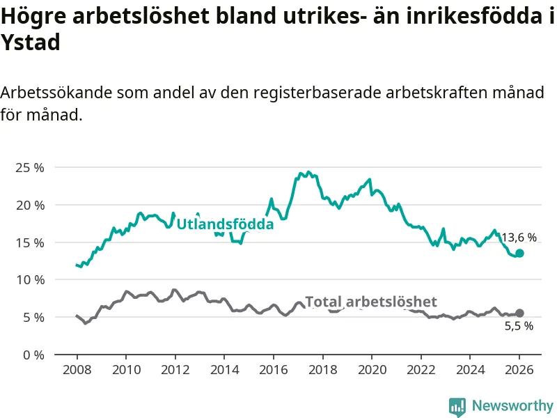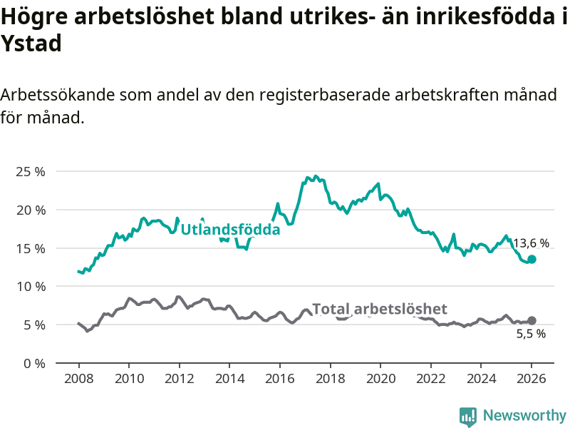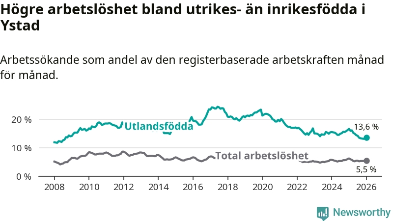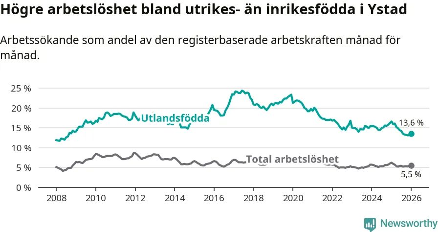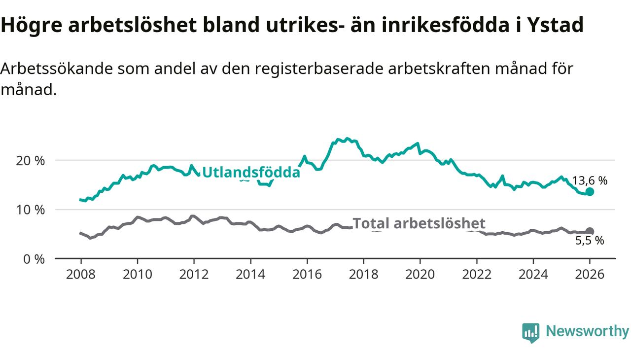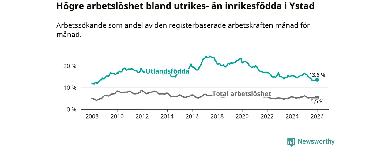 Arbetslösheten bland utlandsfödda var 13,6 procent i Ystad under januari månad, motsvarande 279 av 2 051 personer. Det är 3,0 procentenheter färre än vid samma tidpunkt i fjol (−55 om man räknar personer). Därmed är de utlandsföddas arbetslöshet lägre än vid samma tidpunkt i fjol för åttonde månaden i följd. Sedan maj 2025 har arbetslösheten bland utlandsfödda minskat från 14,9 till 13,6 procent.