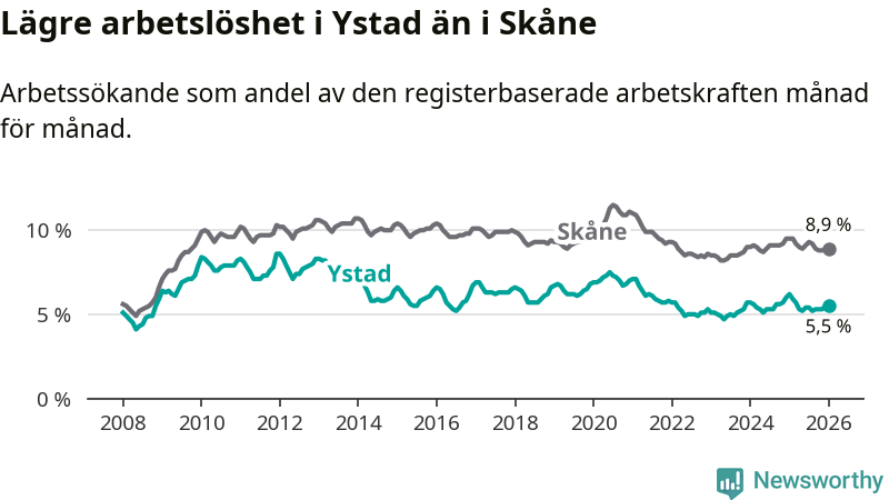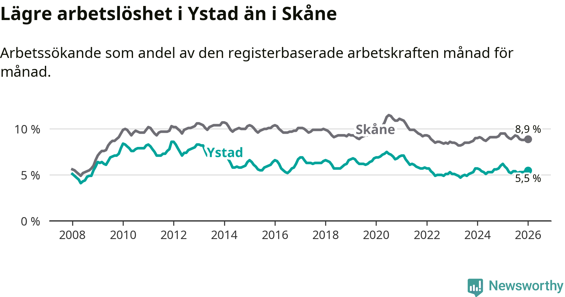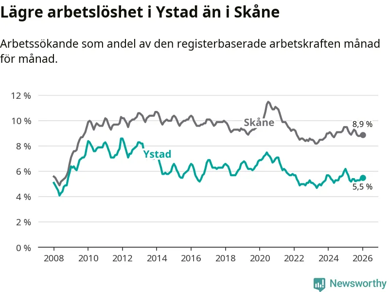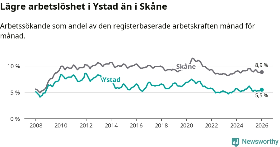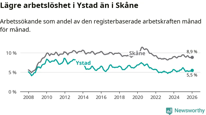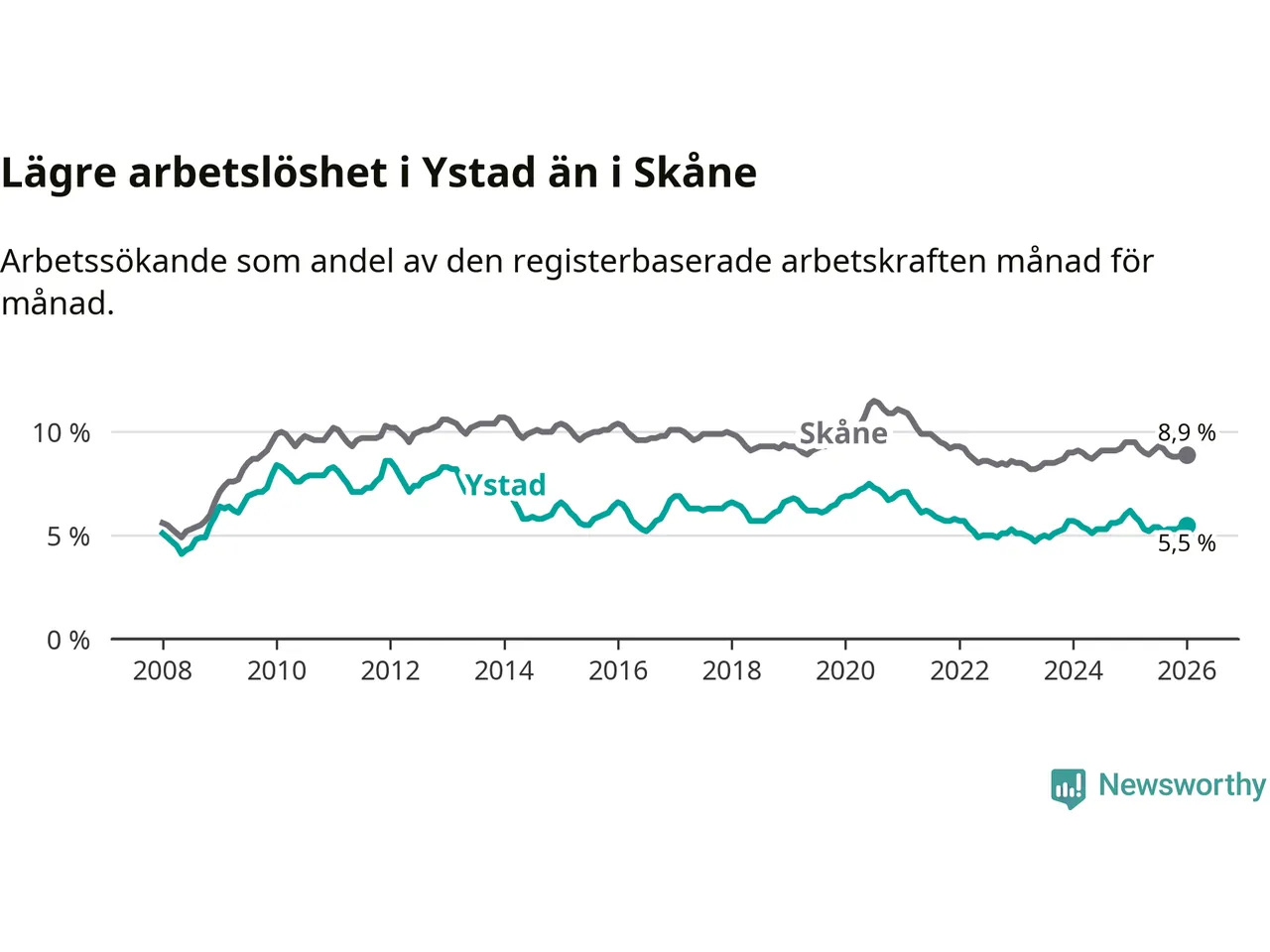 Under januari månad rapporterade Ystads kommun en total arbetslöshet på 5,5 procent. Det är en minskning jämfört med samma tidpunkt i fjol (−0,7 procentenheter). Även i Skåne län sjunker arbetslösheten .