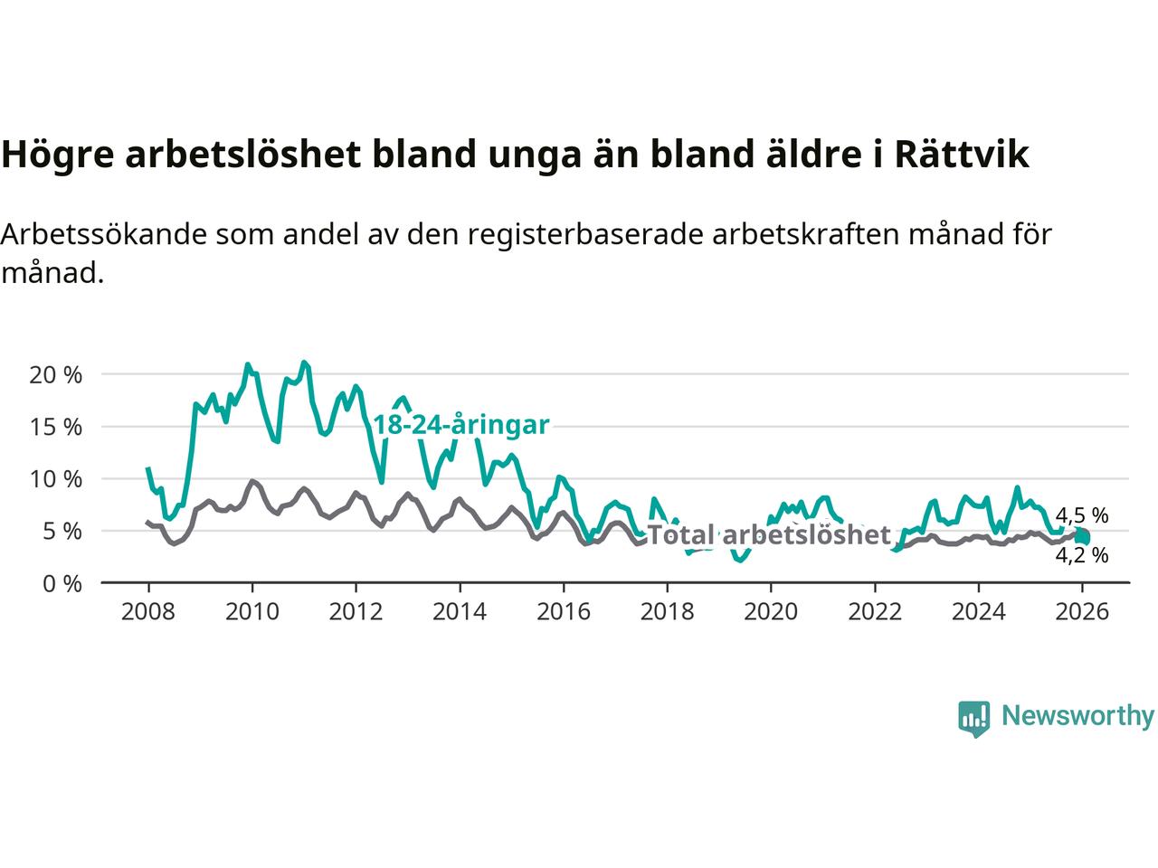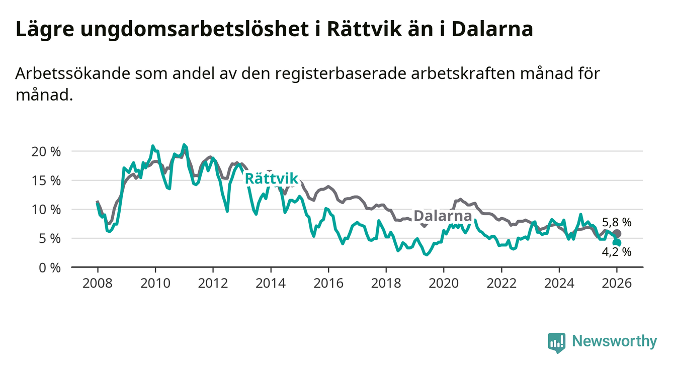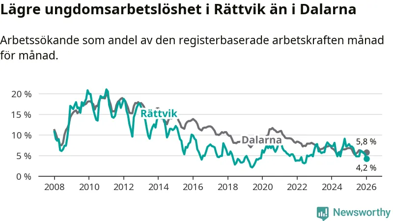 Den senaste månadsstatistiken från Arbetsförmedlingen visar på en nedgång i ungdomsarbetslöshet i Rättviks kommun med 3,6 procentenheter. Arbetslösheten bland personer i åldern 18–24 år låg i januari på 4,2 procent.