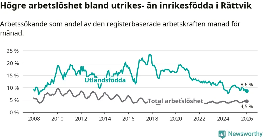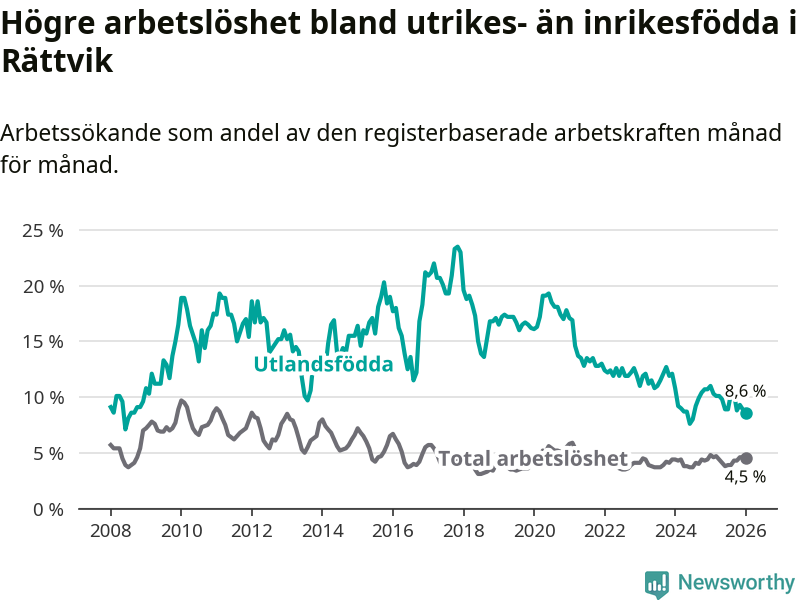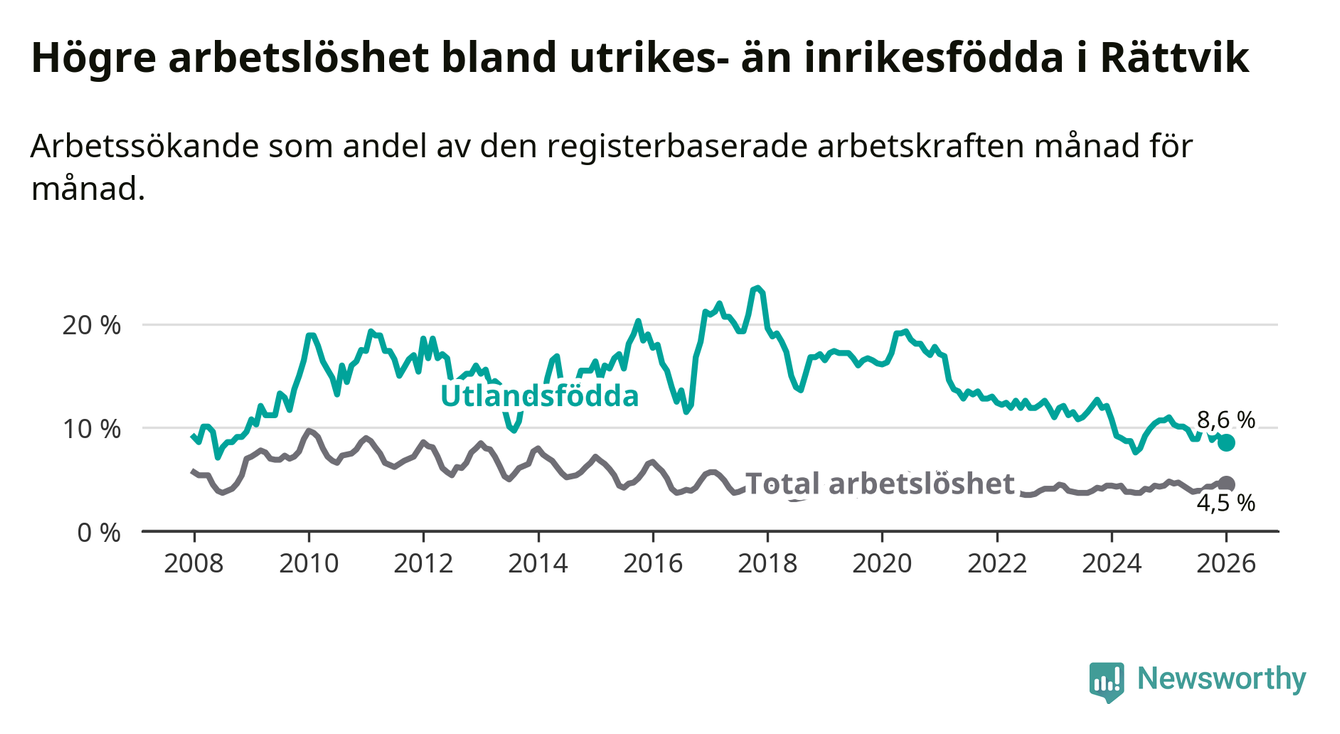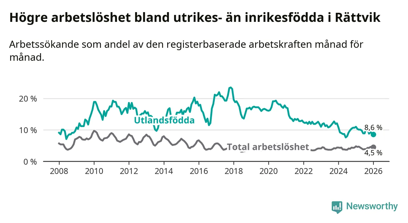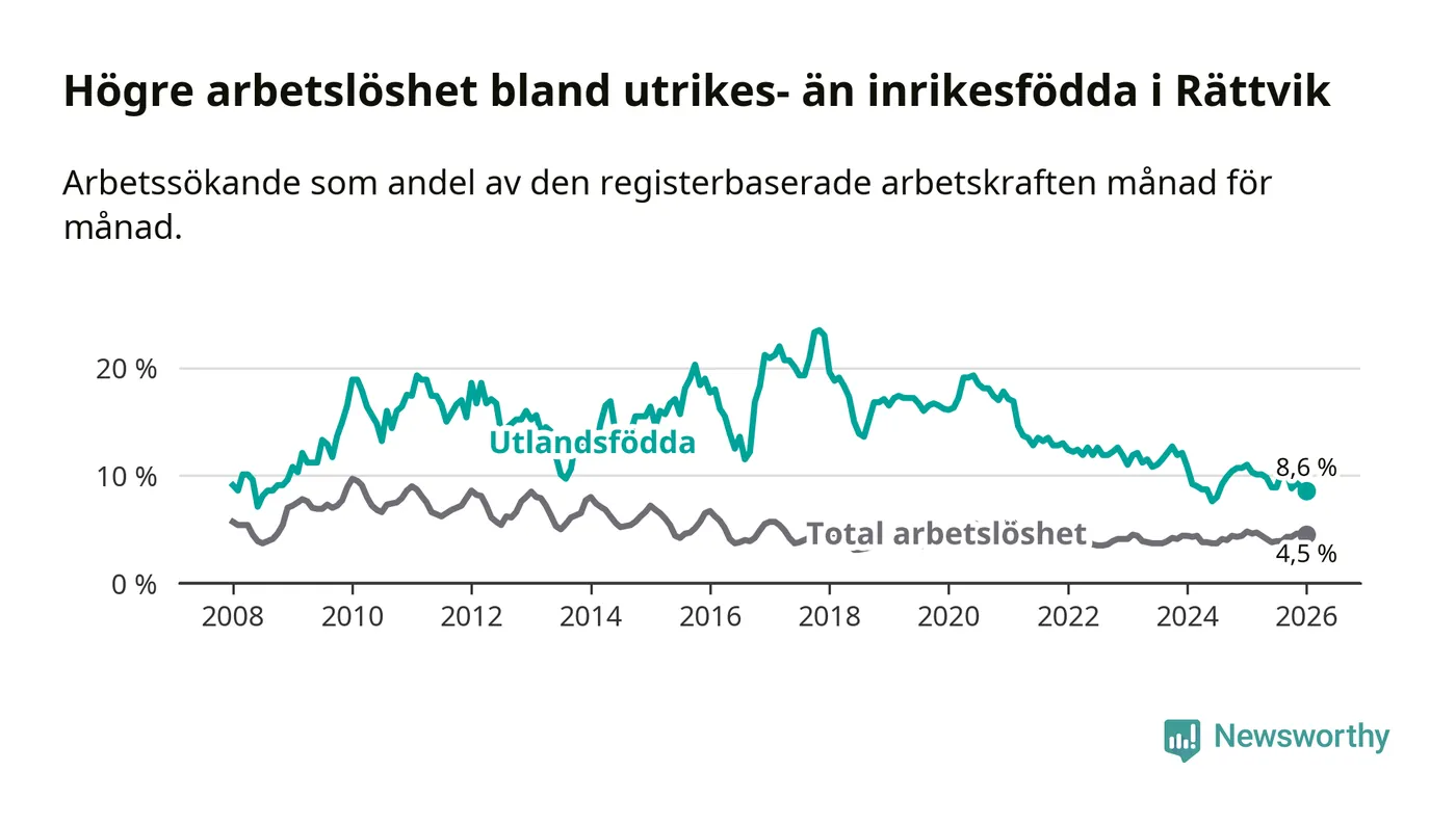 | Bland utlandsfödda | 8,6 % | −2,4 % ▼ | 13,7 % | −2,4 % ▼ | 14,3 % | −1,5 % ▼ |
