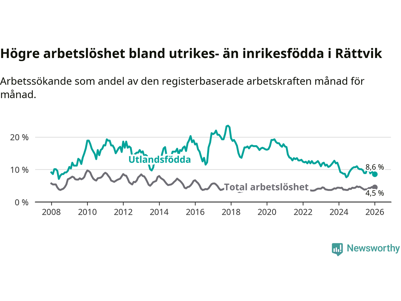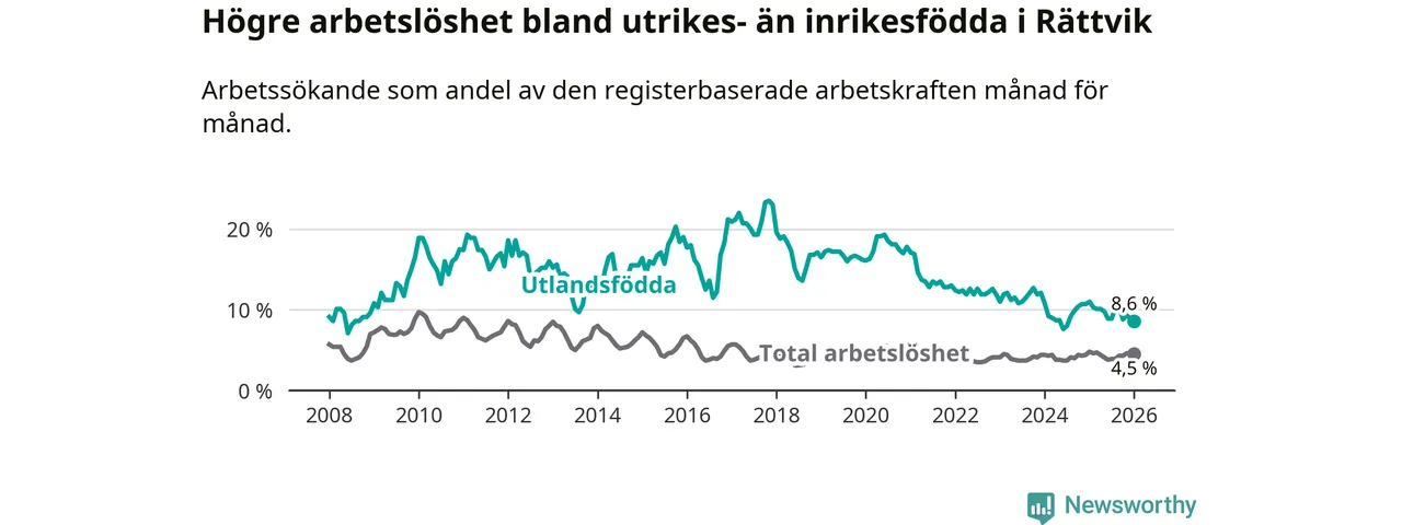 Skillnaden i arbetslöshet mellan utrikesfödda och hela befolkningen är 4,1 procentenheter i Rättvik. Det är en betydligt mindre skillnad än för ett år sedan (−2,1 procentenheter).