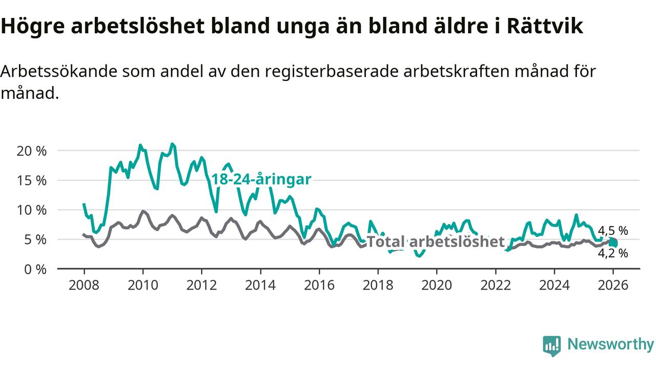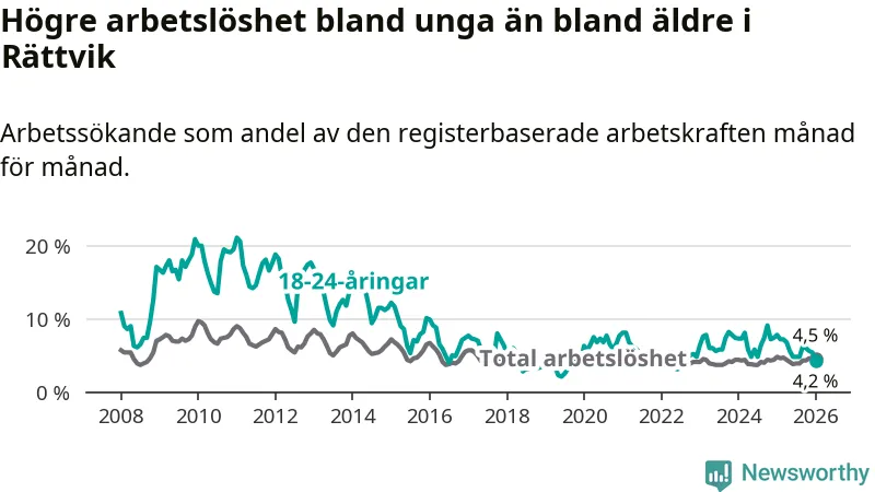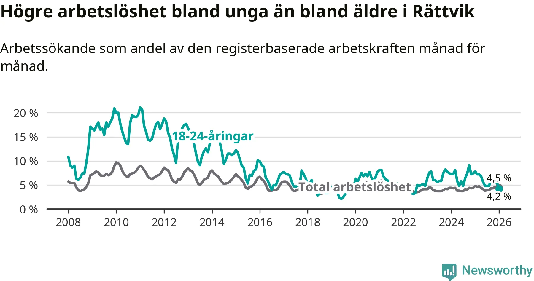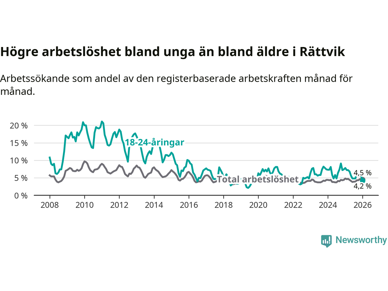 Precis som den totala arbetslösheten sjunker arbetslösheten bland unga (−3,6 procentenheter). I januari var 4,2 procent av 18–24-åringarna inskrivna som arbetssökande (motsvarande 21 personer). Mäter vi antalet inskrivna ser vi en minskning med 18 personer på ett års sikt.