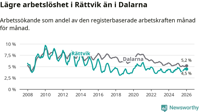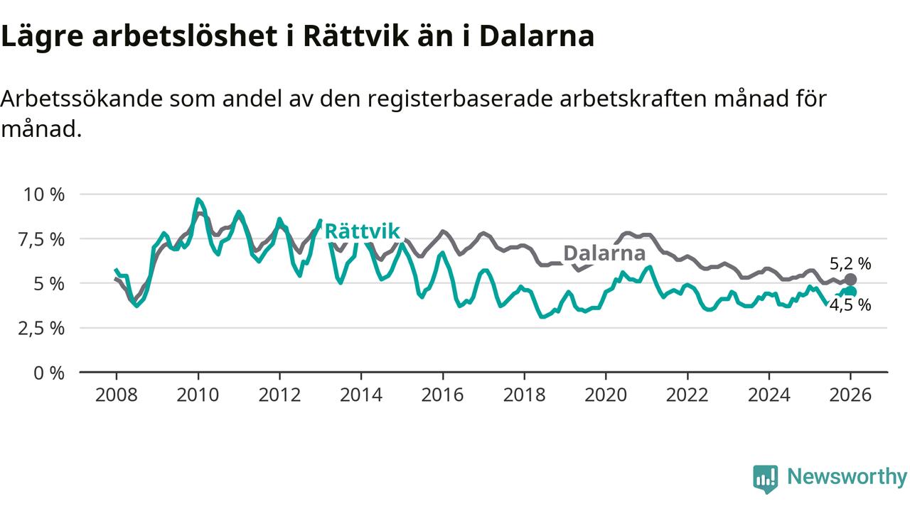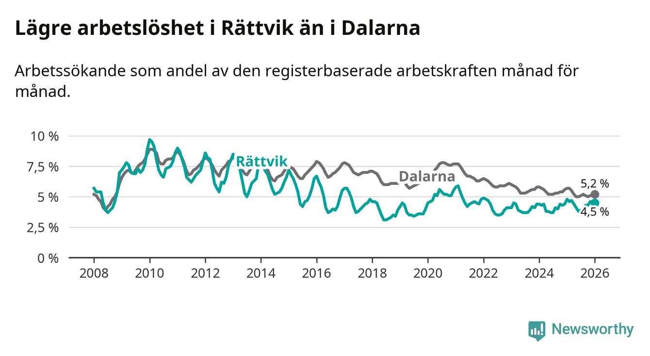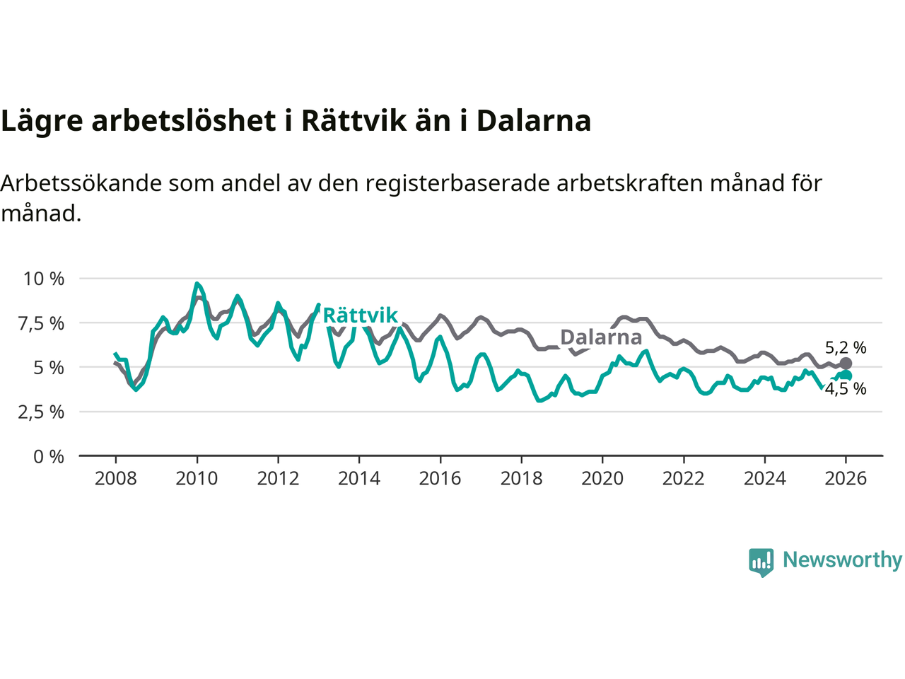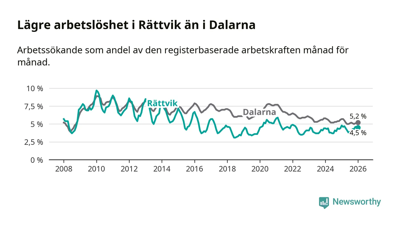 Under januari månad rapporterade Rättviks kommun en total arbetslöshet på 4,5 procent. Det är en minskning jämfört med samma tidpunkt i fjol (−0,3 procentenheter). Även i Dalarnas län sjunker arbetslösheten .