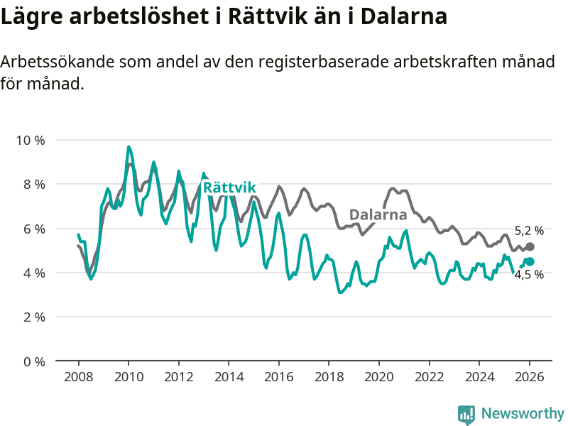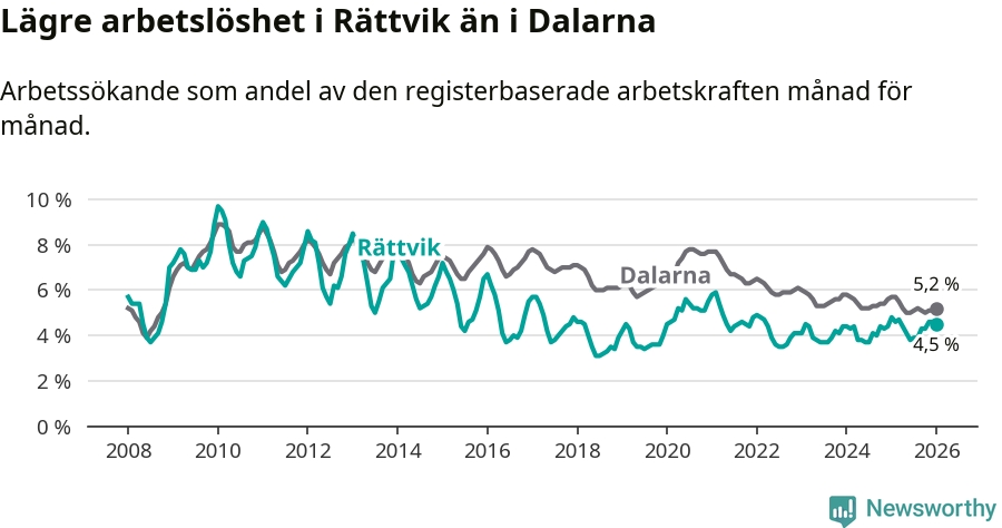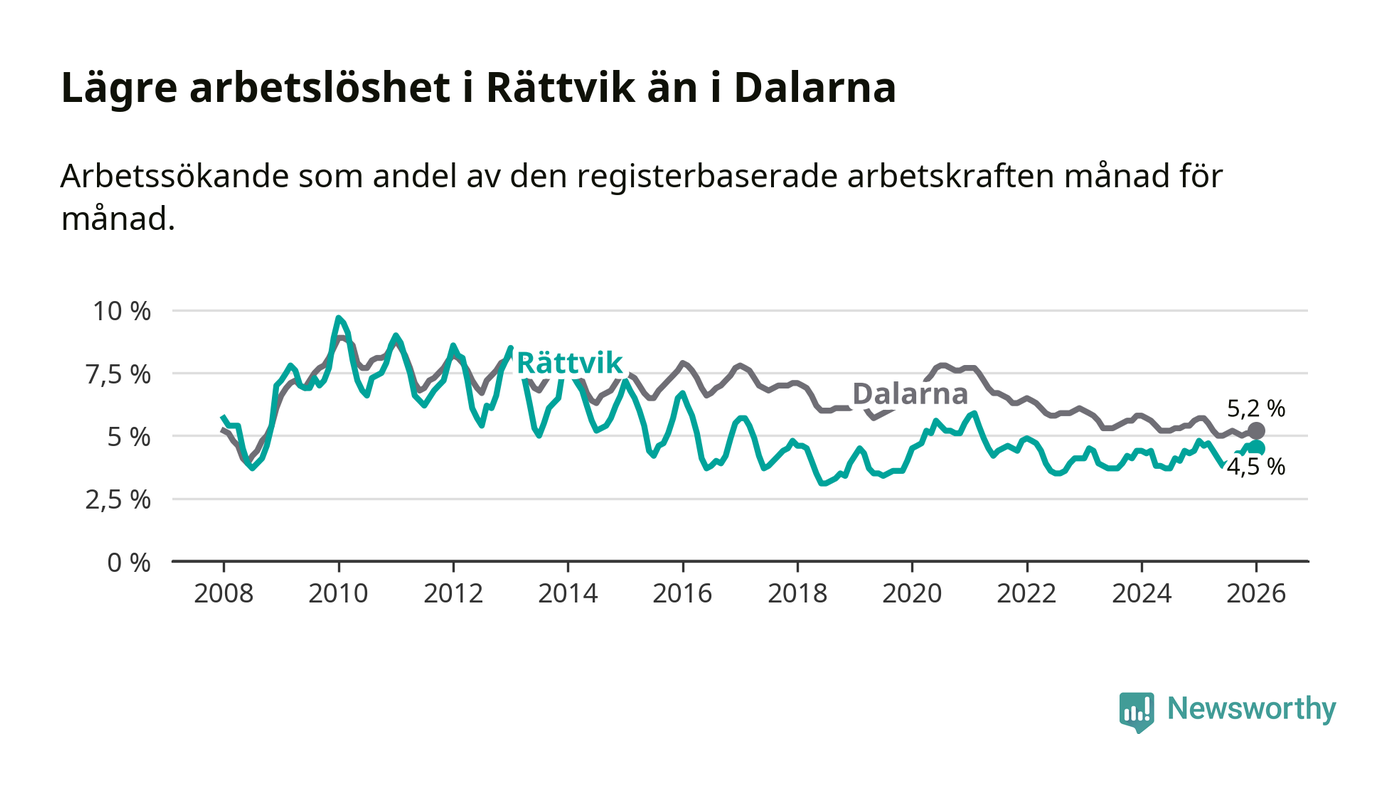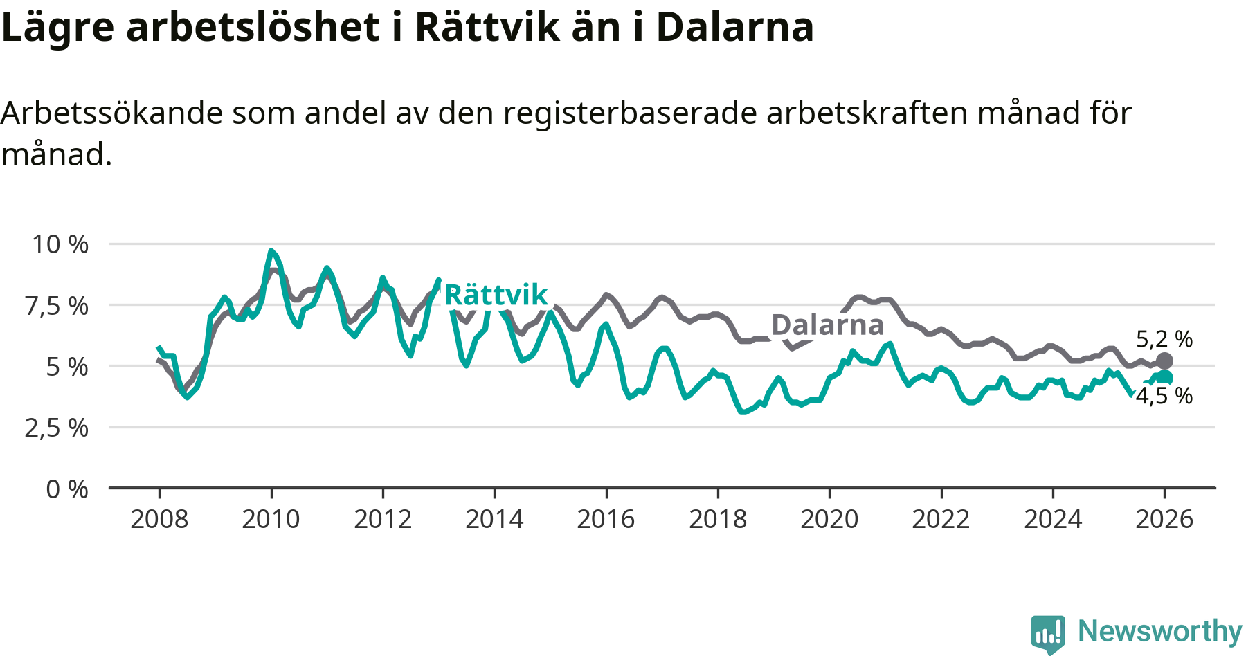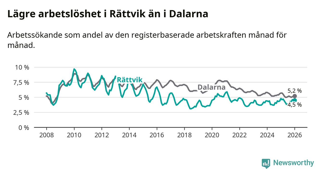 Under januari månad rapporterade Rättviks kommun en total arbetslöshet på 4,5 procent. Det är en minskning jämfört med samma tidpunkt i fjol (−0,3 procentenheter). Även i Dalarnas län sjunker arbetslösheten .