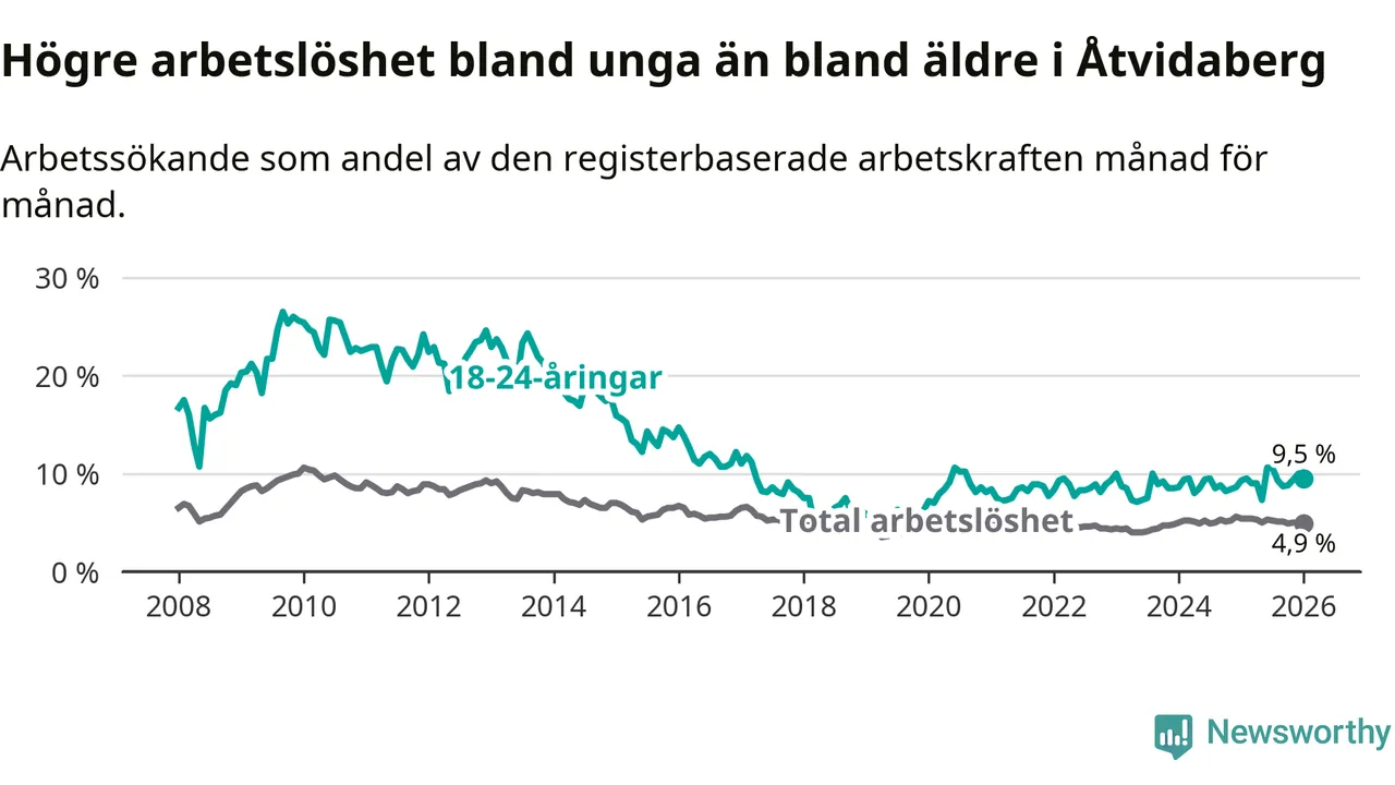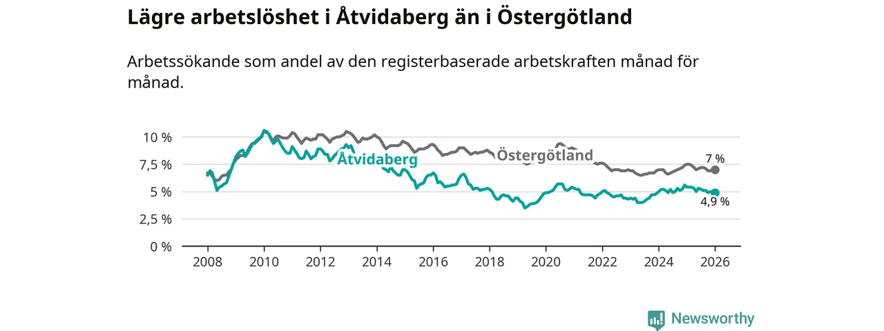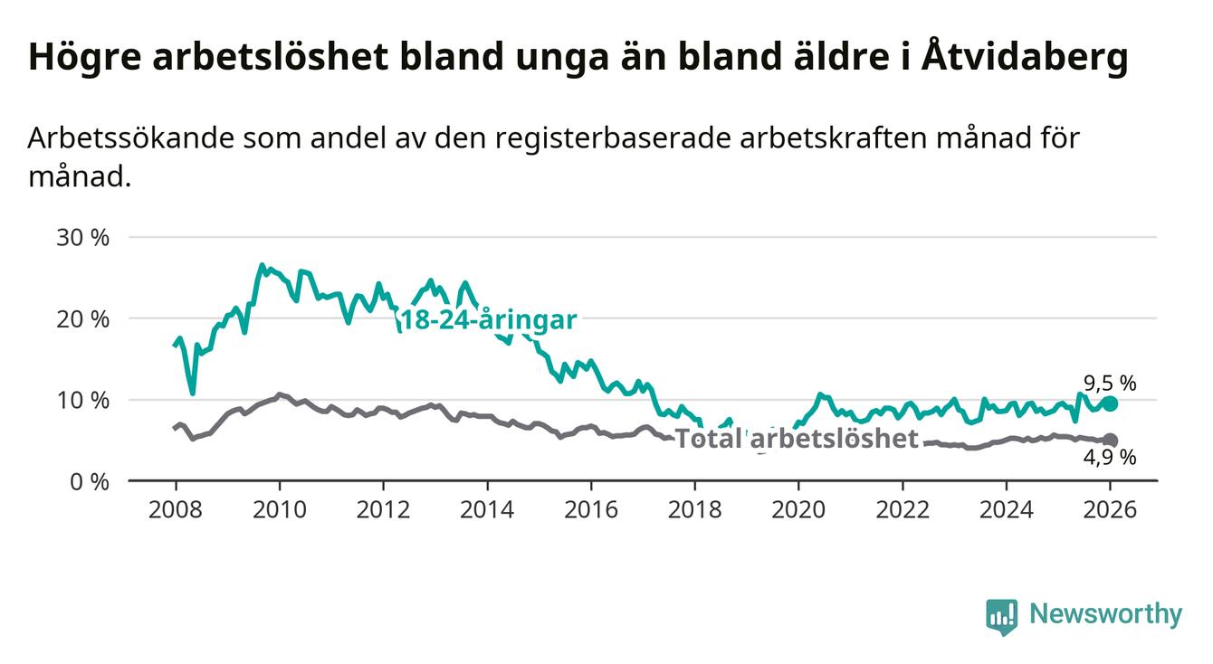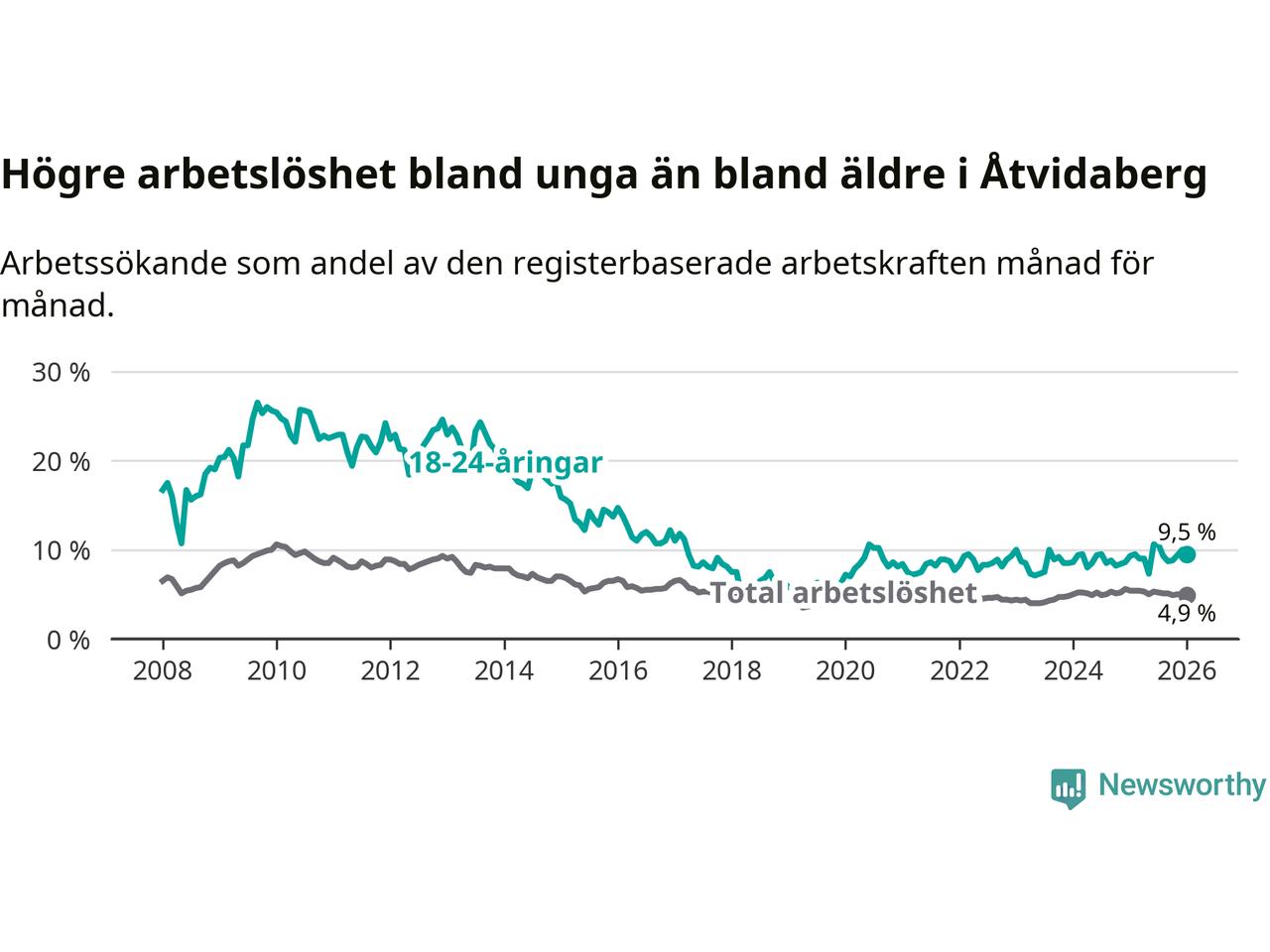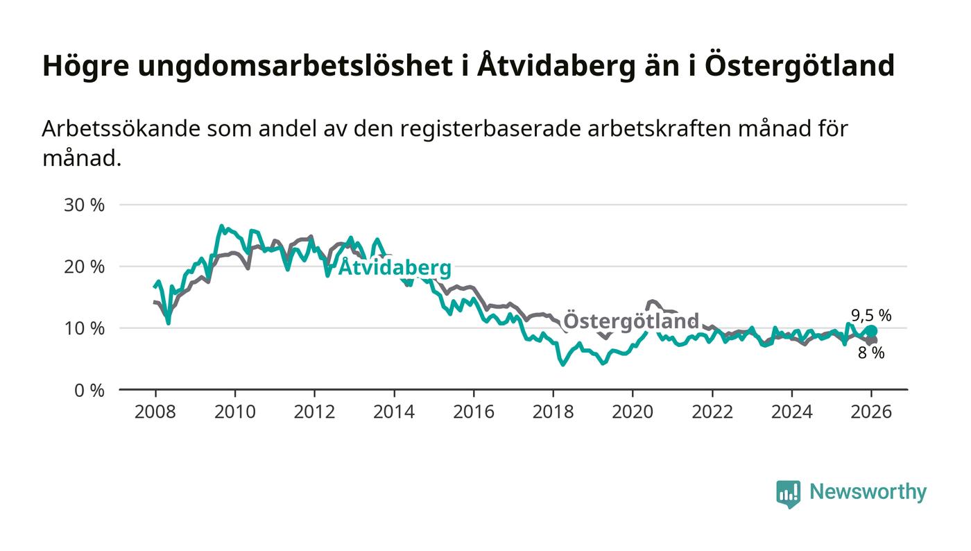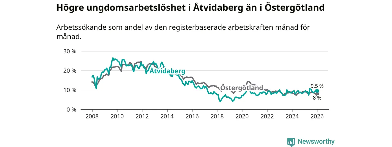 Medan Åtvidaberg har lägre total arbetslöshet än Östergötland, ligger ungdomsarbetslösheten 1,5 procentenheter högre i Åtvidaberg.