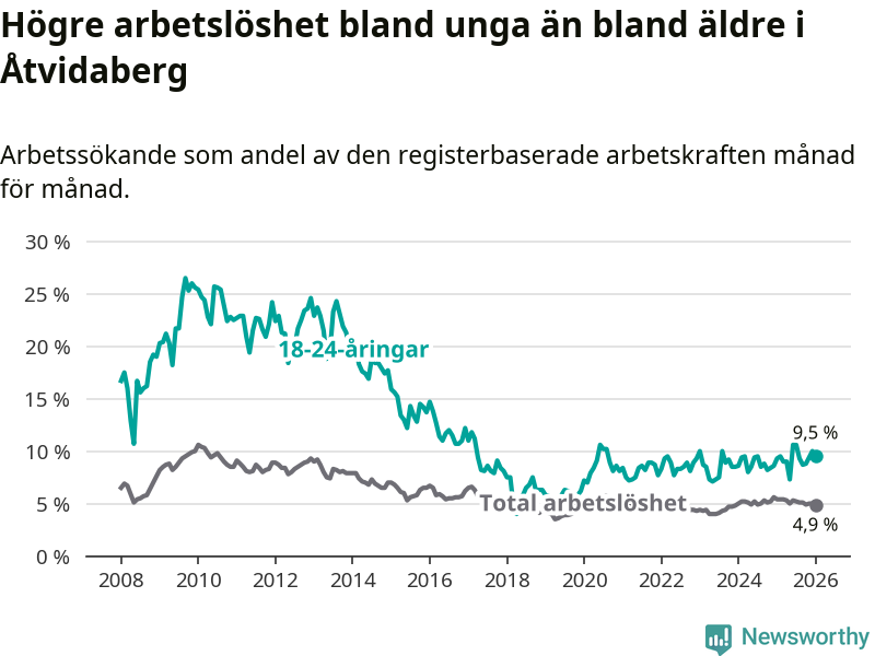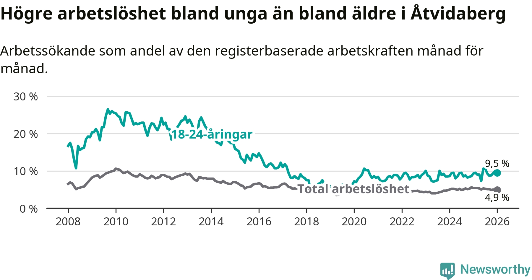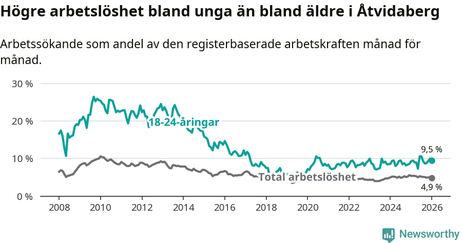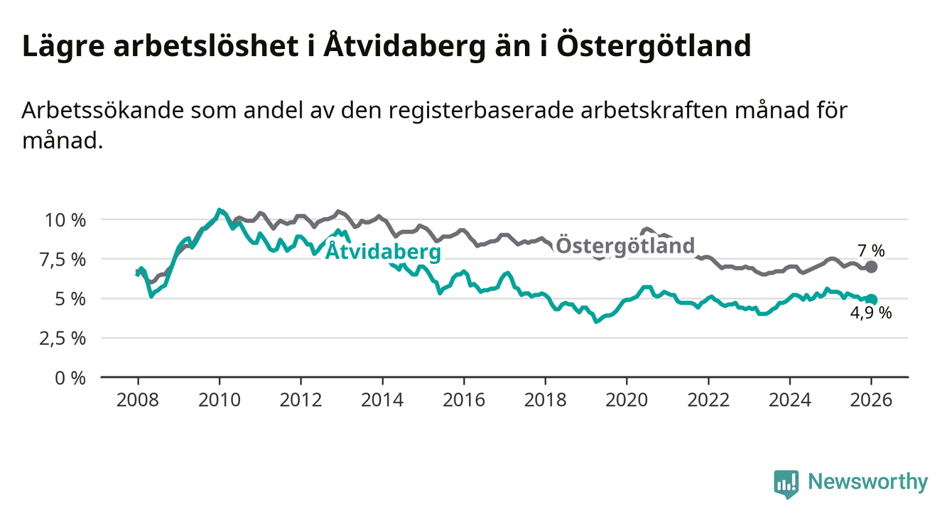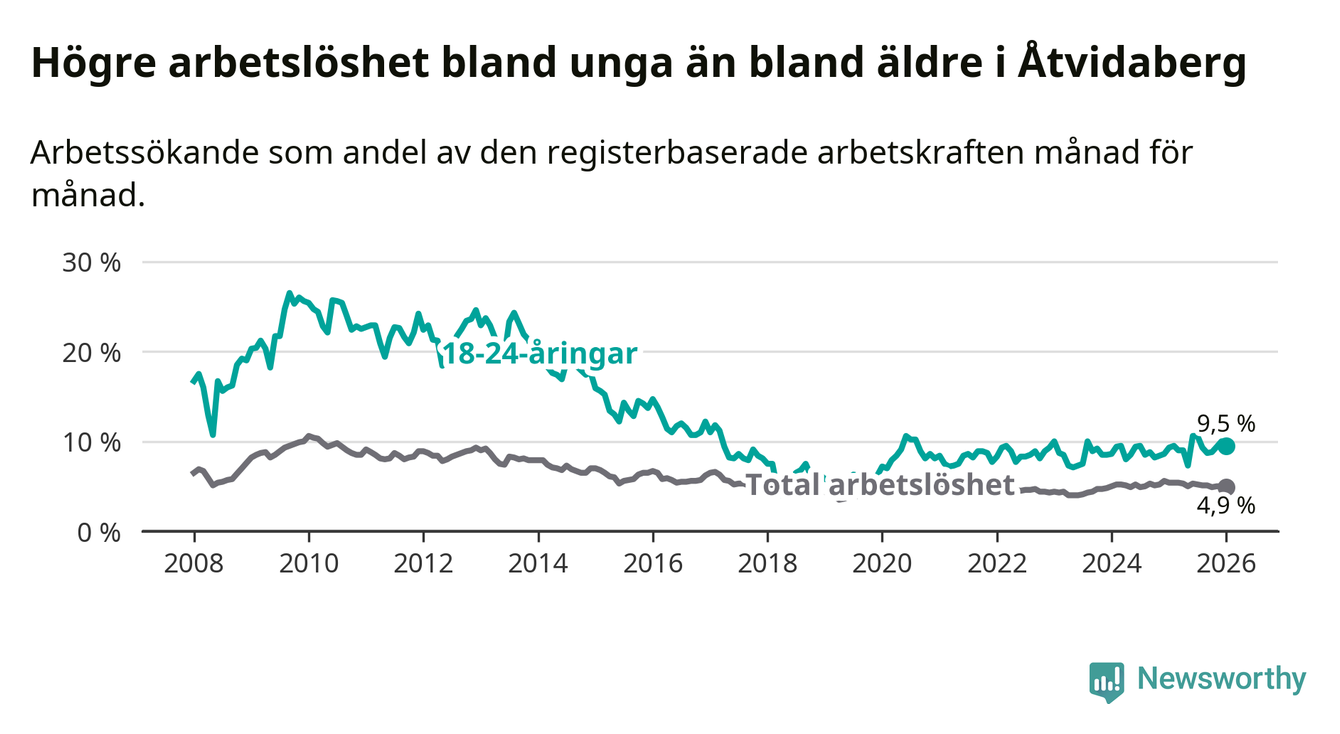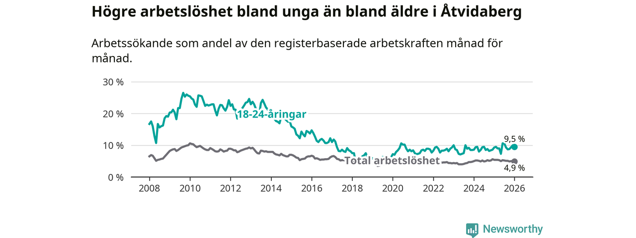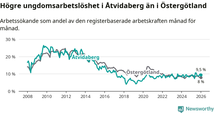Medan Åtvidaberg har lägre total arbetslöshet än Östergötland, ligger ungdomsarbetslösheten 1,5 procentenheter högre i Åtvidaberg.