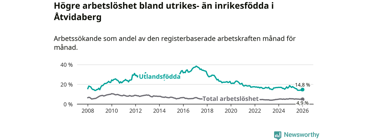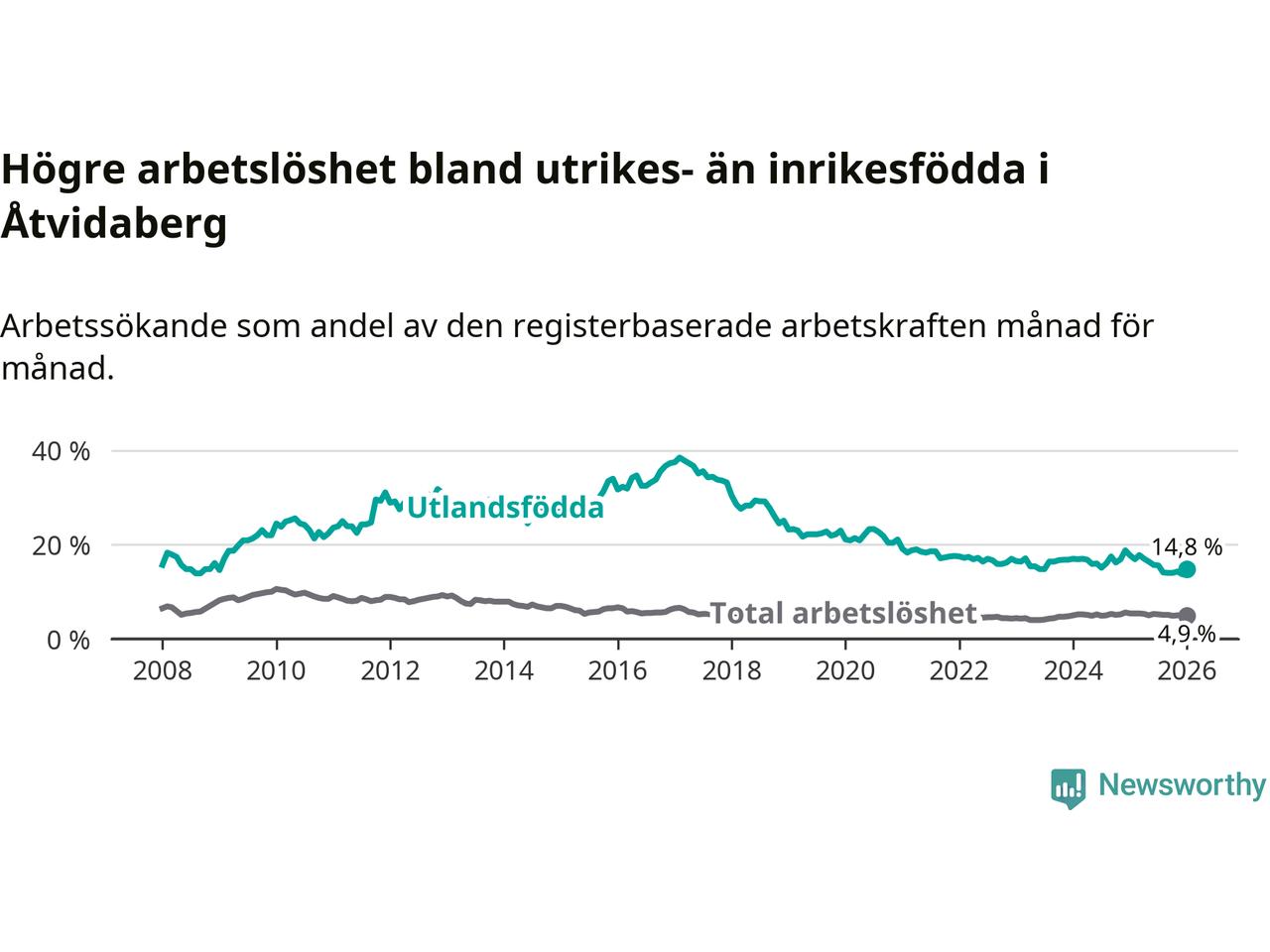 Skillnaden i arbetslöshet mellan utrikesfödda och hela befolkningen är 9,9 procentenheter i Åtvidaberg. Det är en betydligt mindre skillnad än för ett år sedan (−2,4 procentenheter).