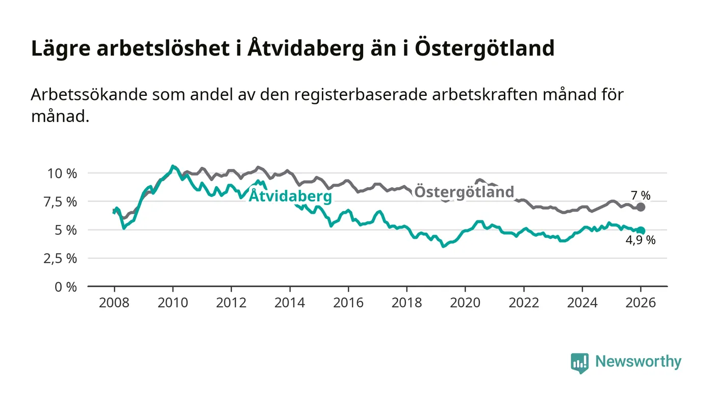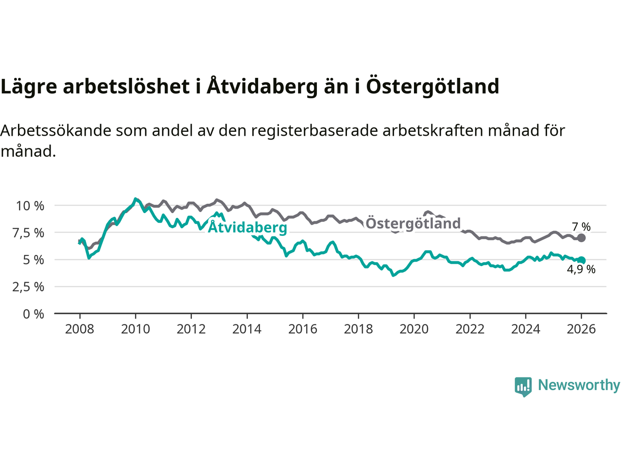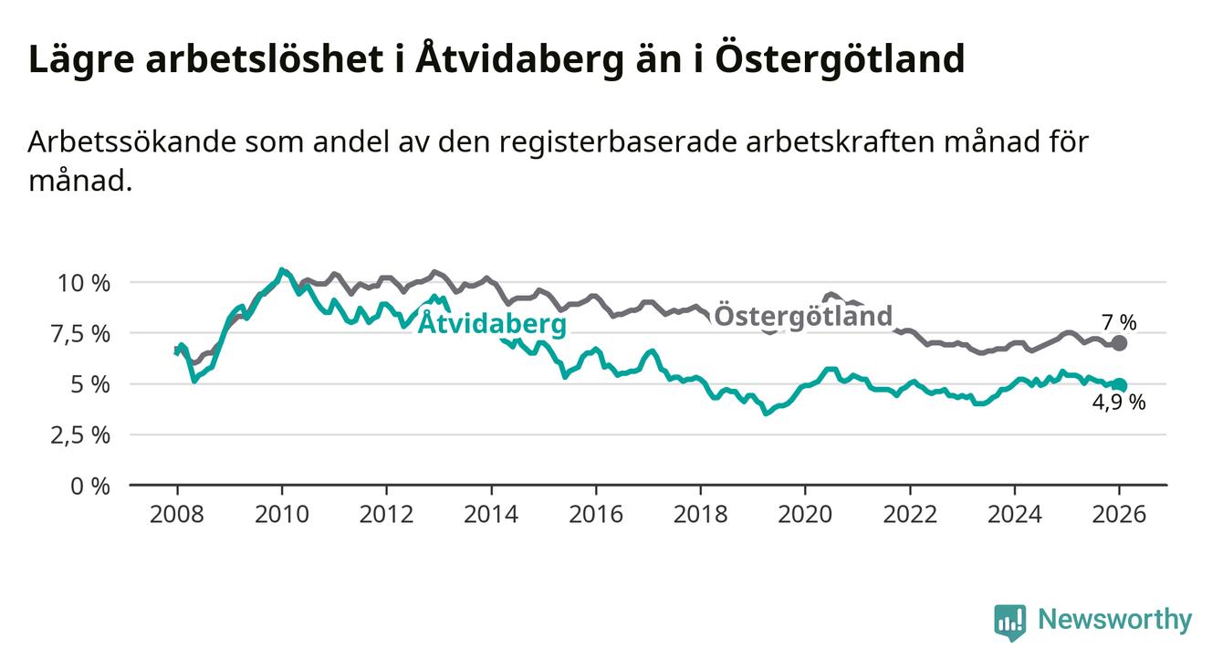 Under januari månad rapporterade Åtvidabergs kommun en total arbetslöshet på 4,9 procent. Det är en minskning jämfört med samma tidpunkt i fjol (−0,5 procentenheter). Även i Östergötlands län sjunker arbetslösheten .