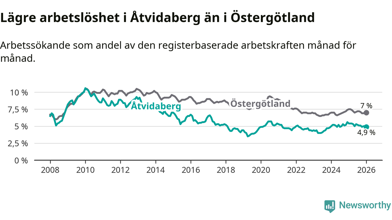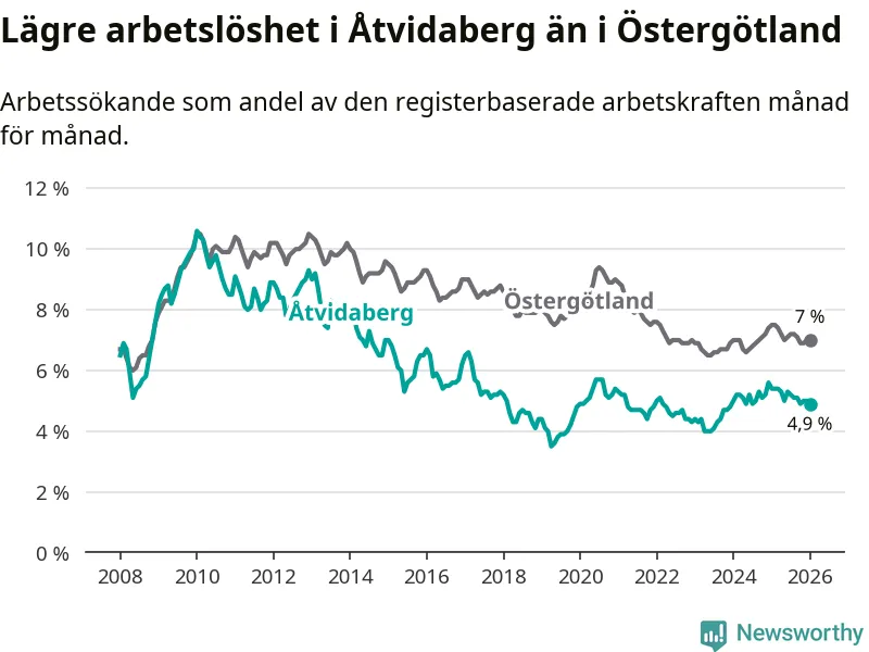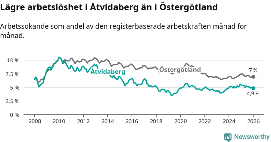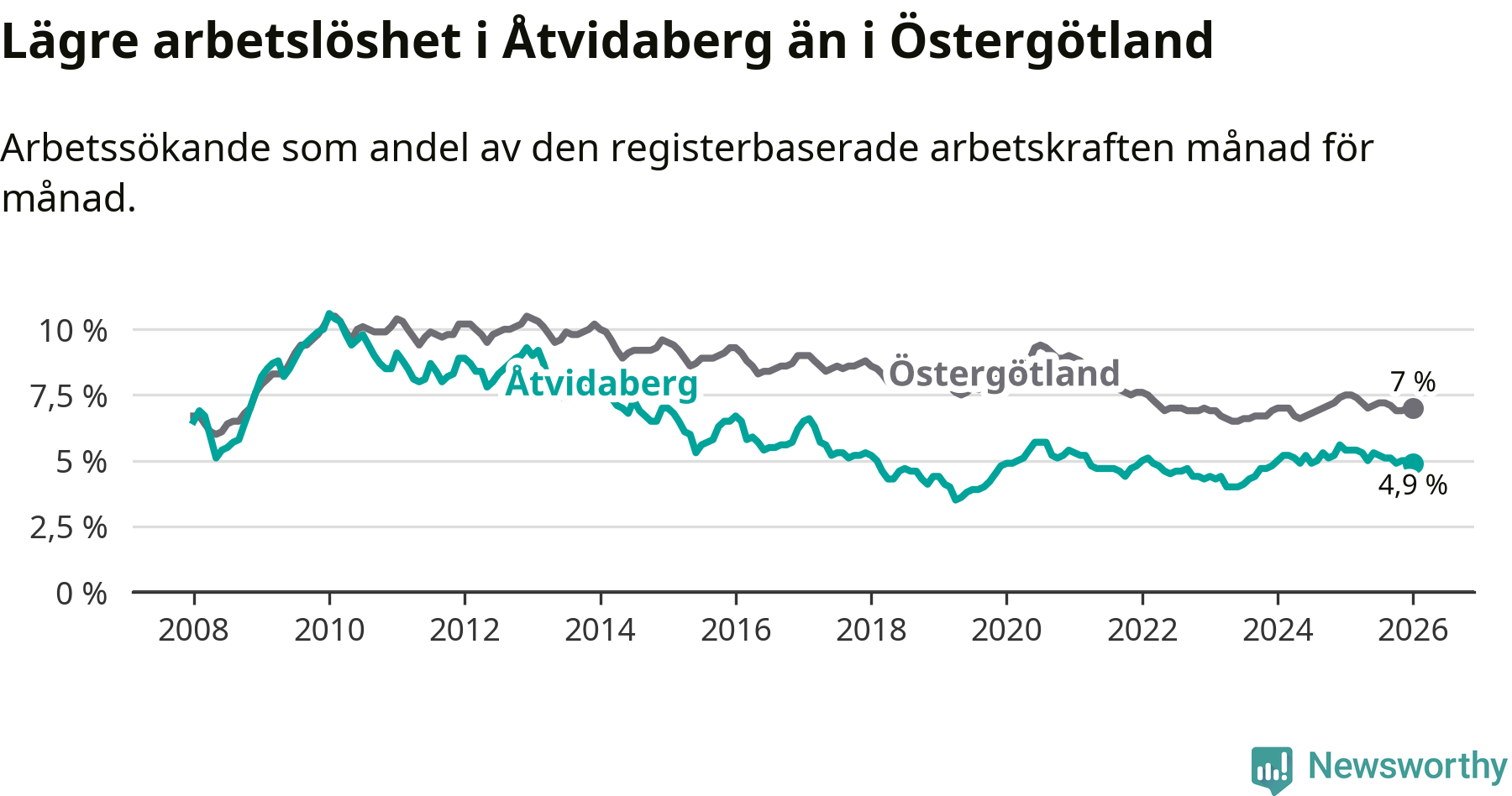 Under januari månad rapporterade Åtvidabergs kommun en total arbetslöshet på 4,9 procent. Det är en minskning jämfört med samma tidpunkt i fjol (−0,5 procentenheter). Även i Östergötlands län sjunker arbetslösheten .