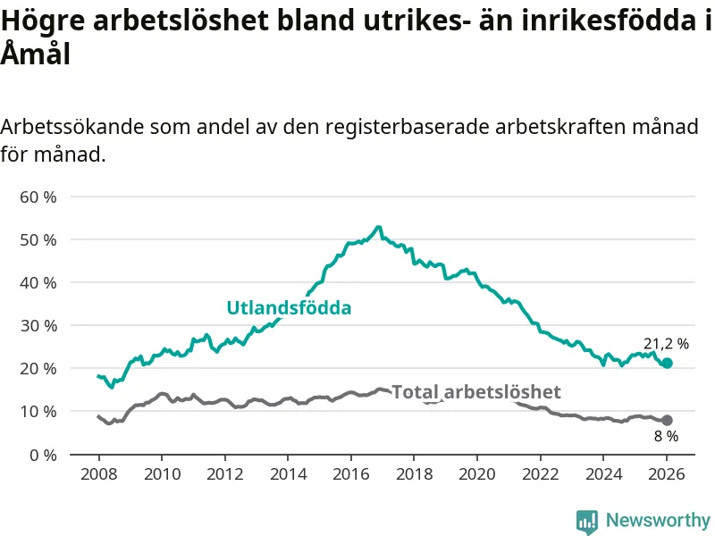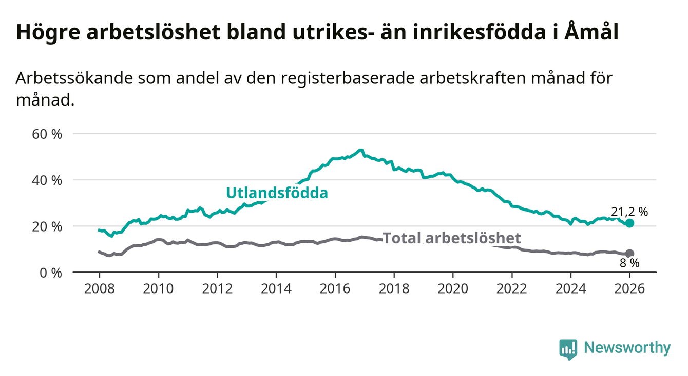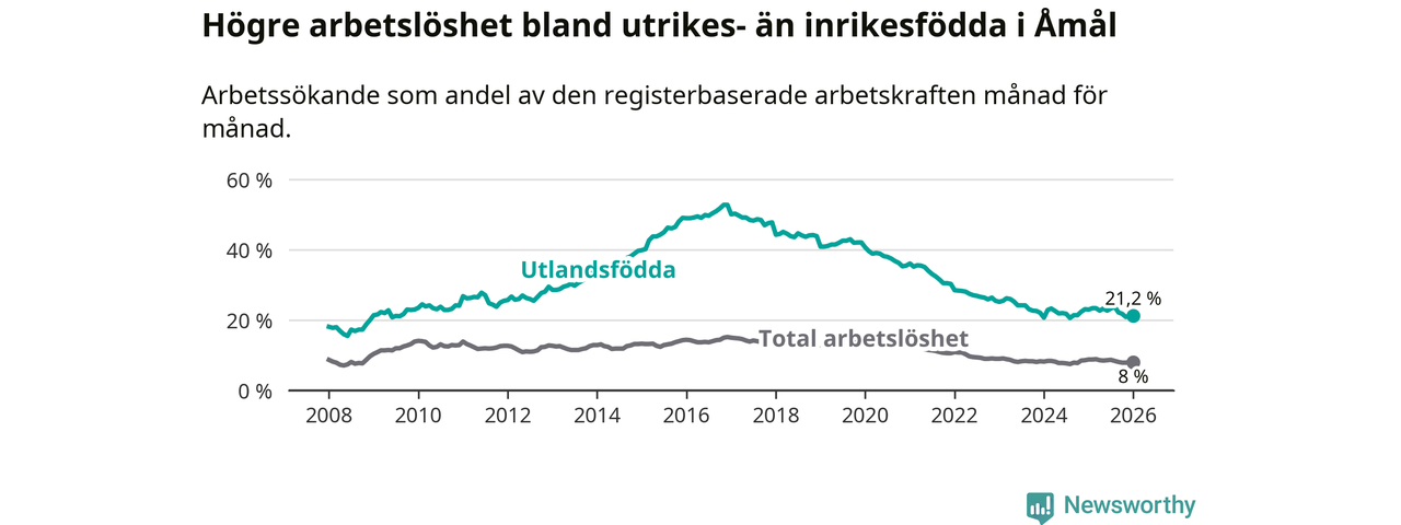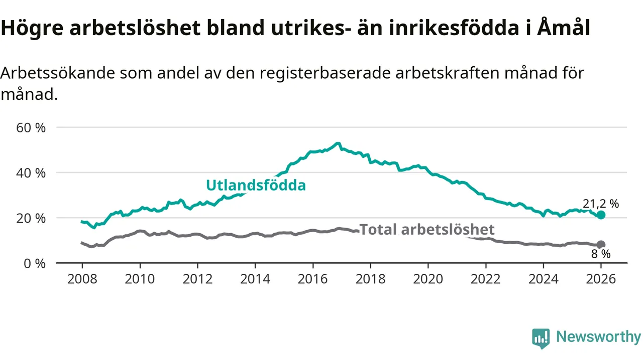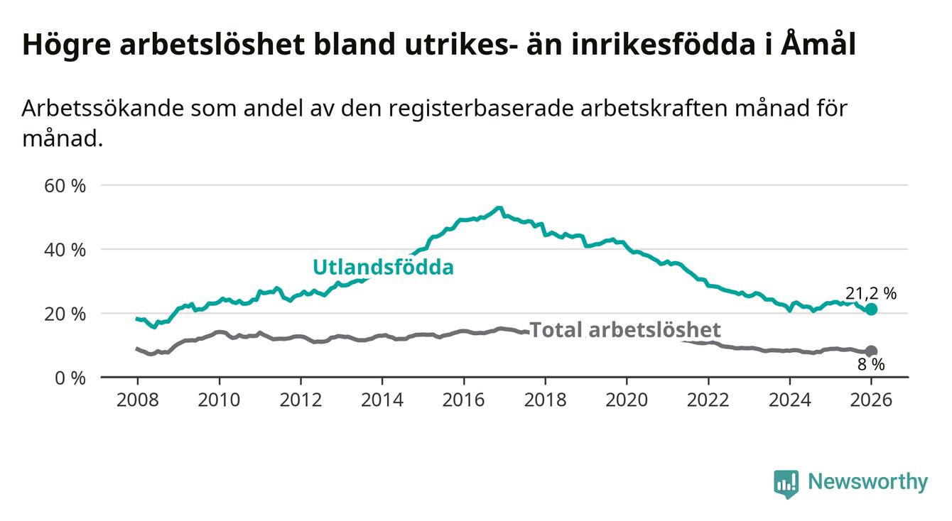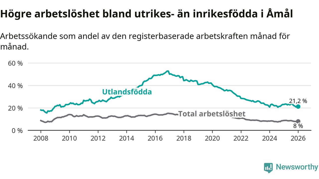 Arbetslösheten bland utlandsfödda var 21,2 procent i Åmål under januari månad, motsvarande 207 av 976 personer. Det är 1,8 procentenheter färre än vid samma tidpunkt i fjol (−13 om man räknar personer).