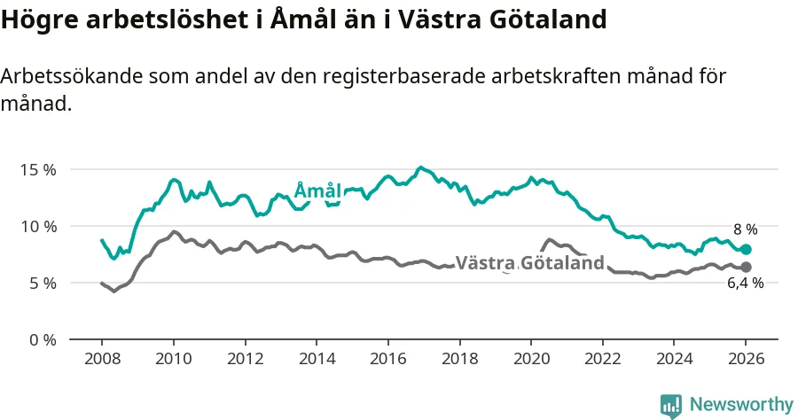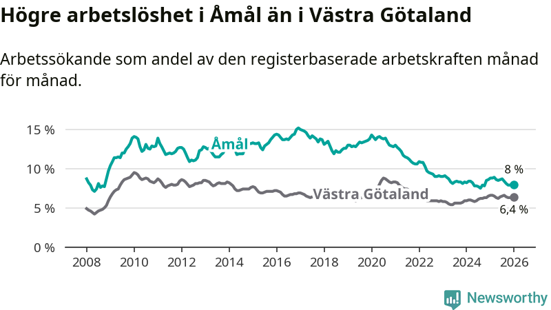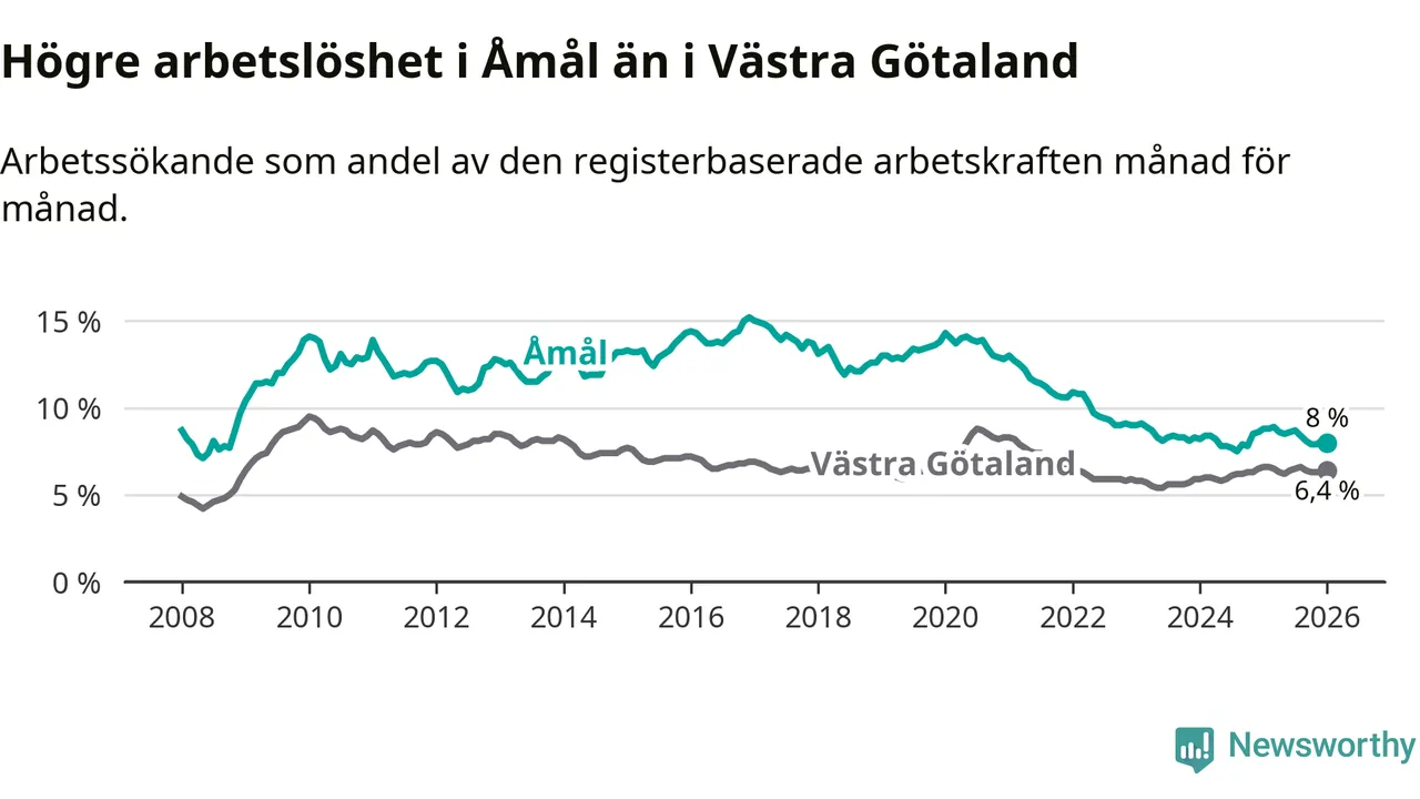 Under januari månad rapporterade Åmåls kommun en total arbetslöshet på 8,0 procent. Det är en minskning jämfört med samma tidpunkt i fjol (−0,8 procentenheter). Även i Västra Götalands län sjunker arbetslösheten .