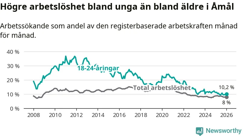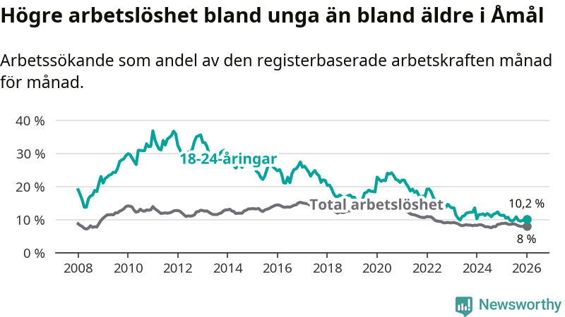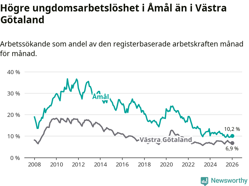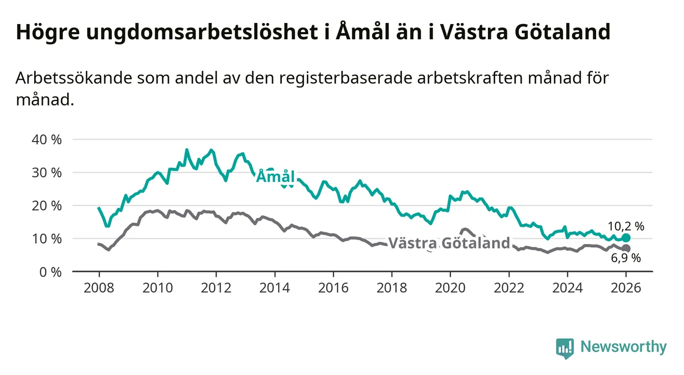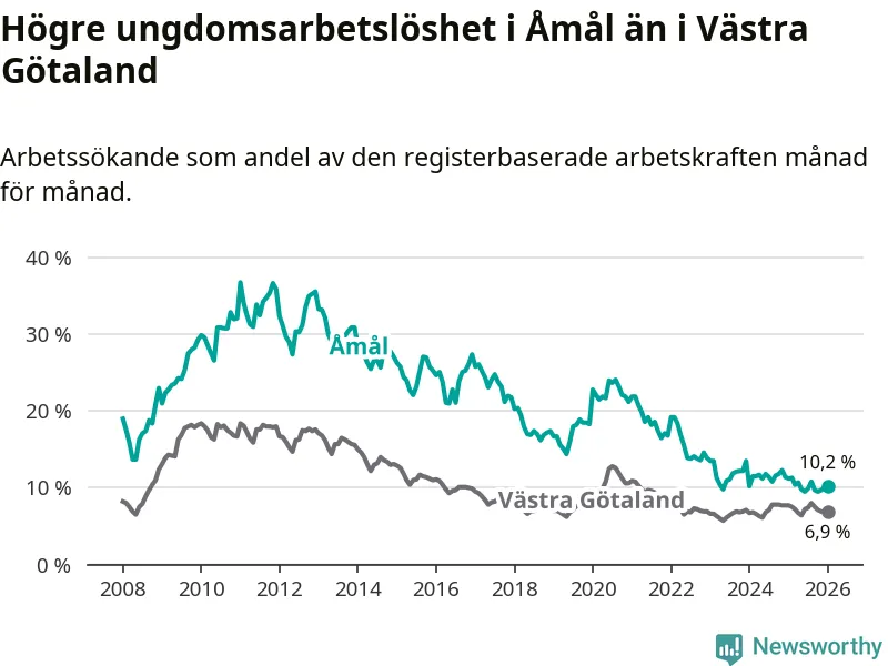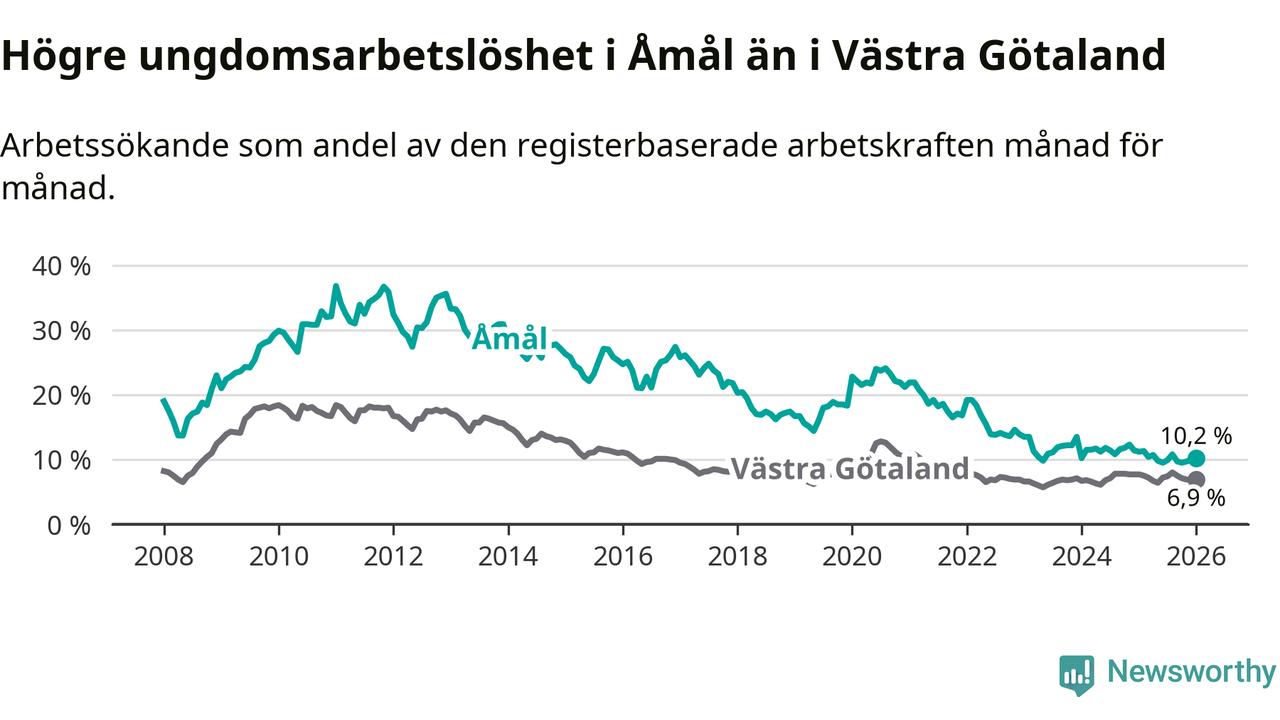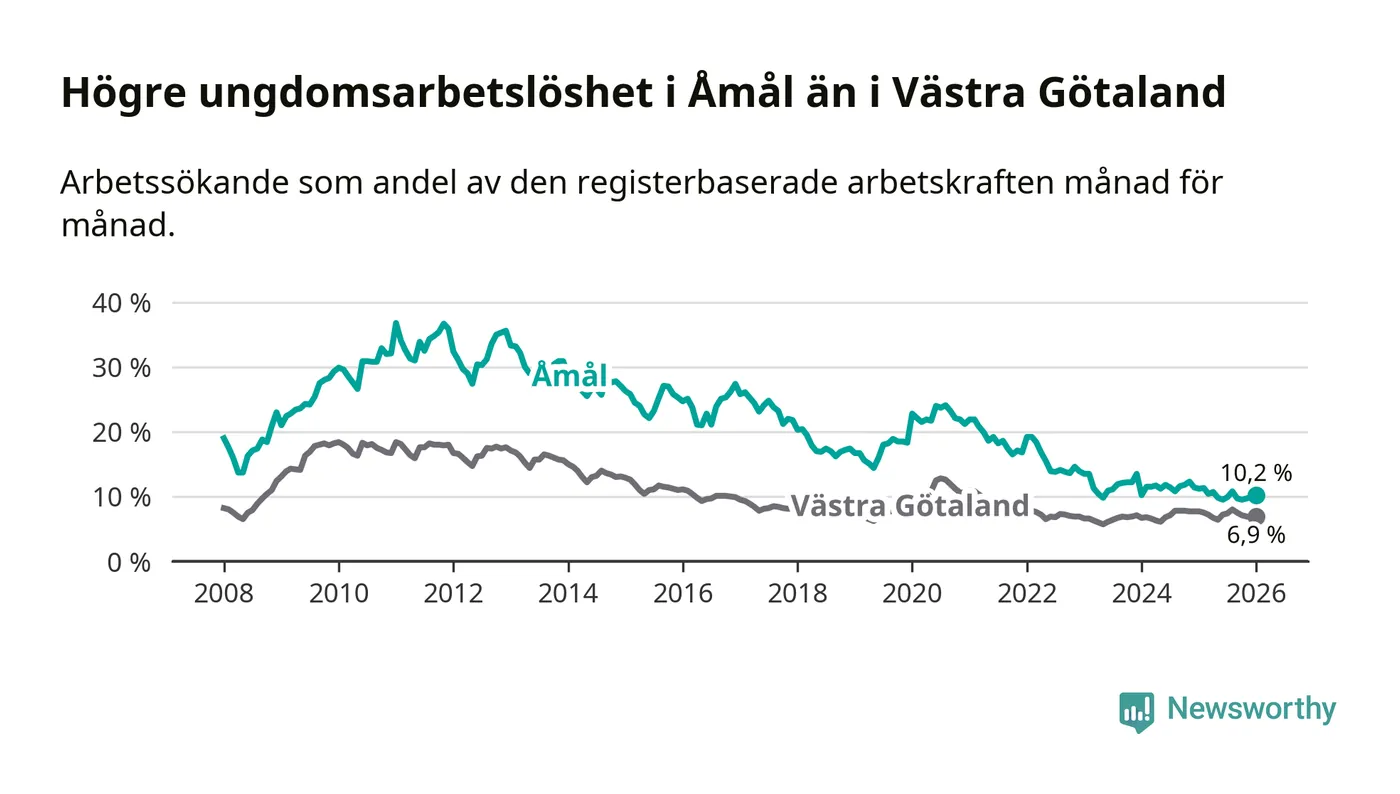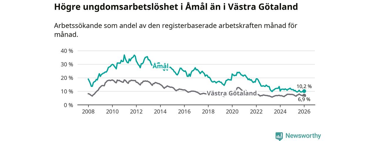 Precis som den totala arbetslösheten ligger ungdomsarbetslösheten i Åmål högre än i Västra Götaland som helhet. Skillnaden mellan kommunen och länet är 3,3 procentenheter.
