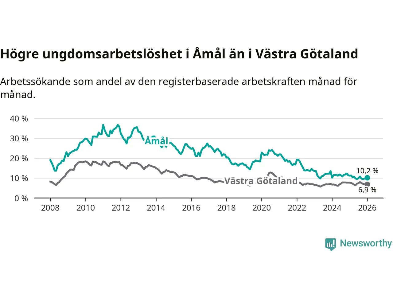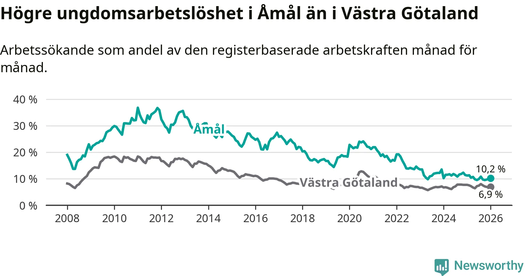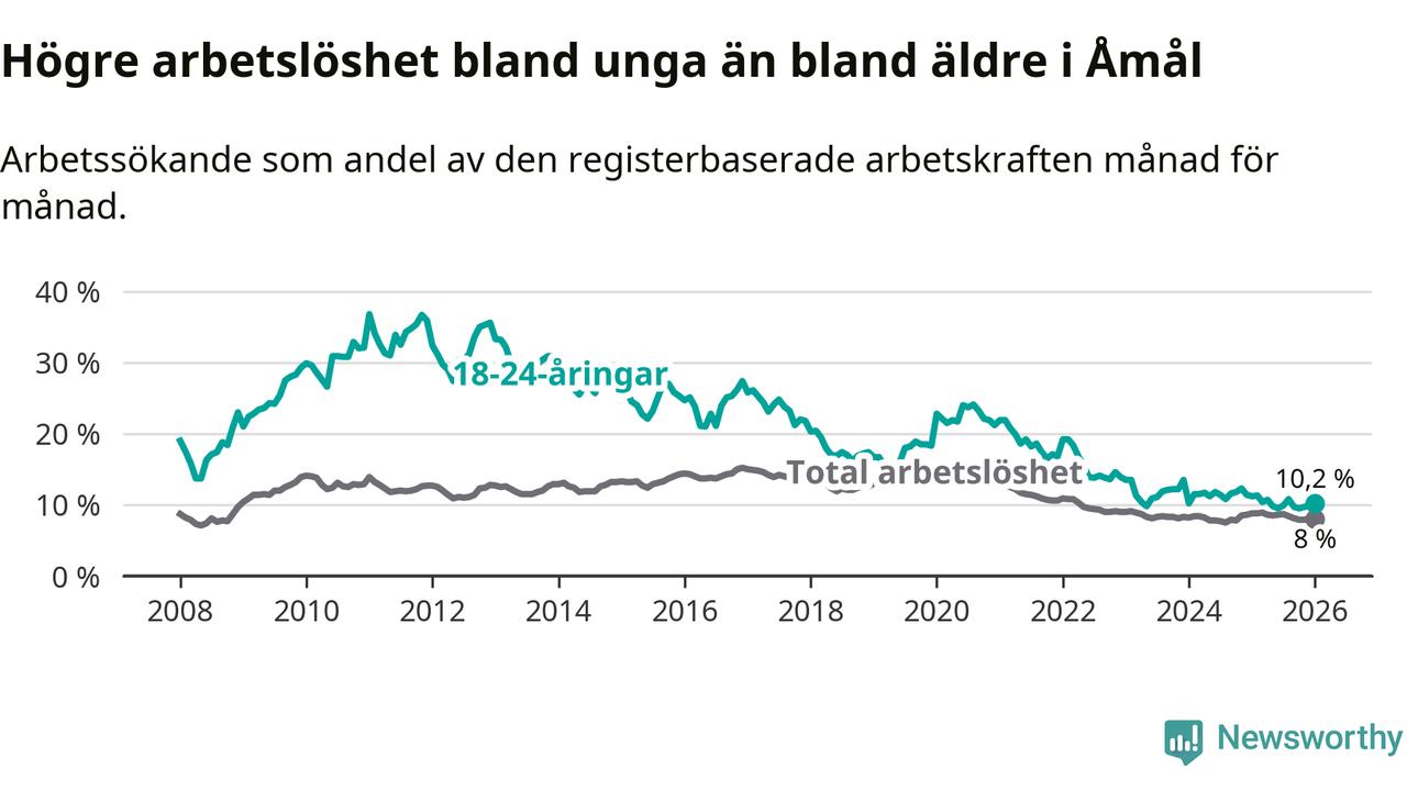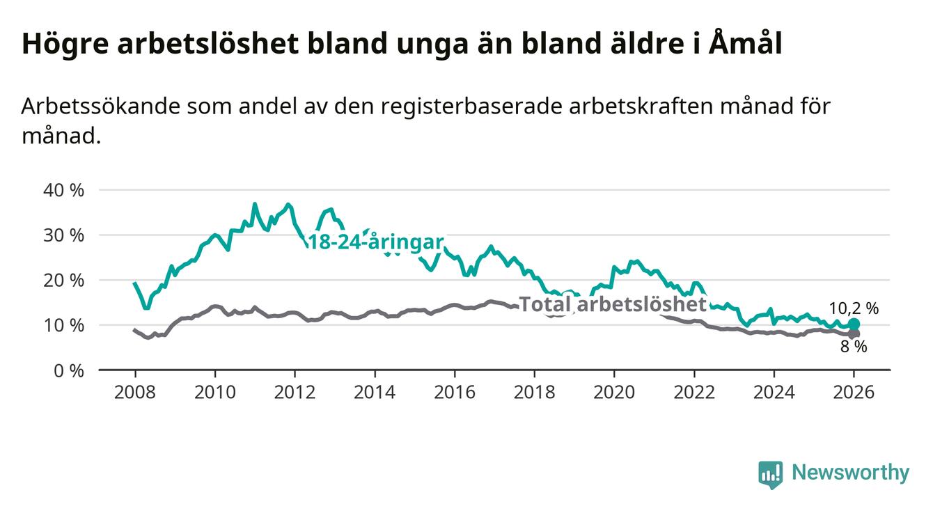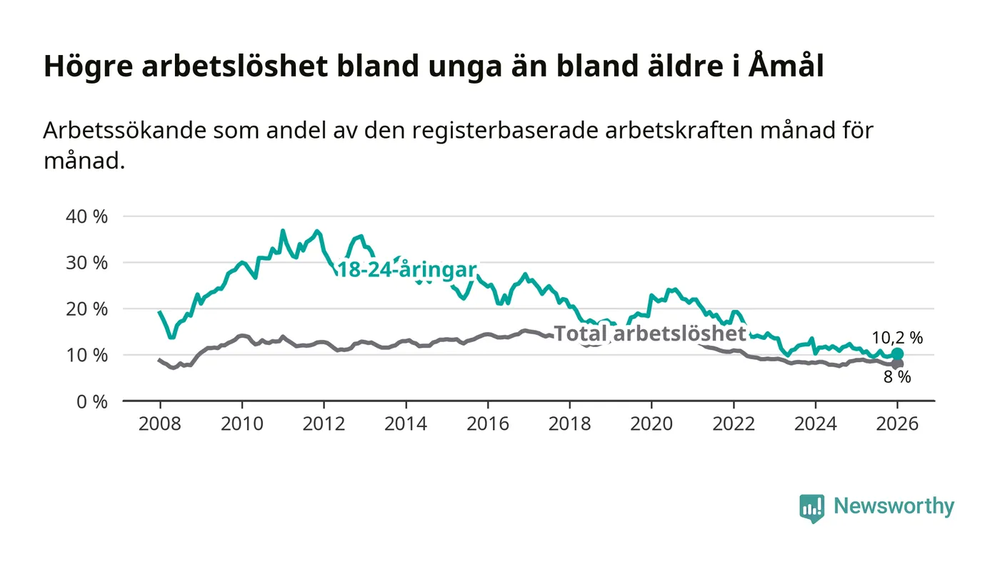 Precis som den totala arbetslösheten ligger ungdomsarbetslösheten i Åmål högre än i Västra Götaland som helhet. Skillnaden mellan kommunen och länet är 3,3 procentenheter.