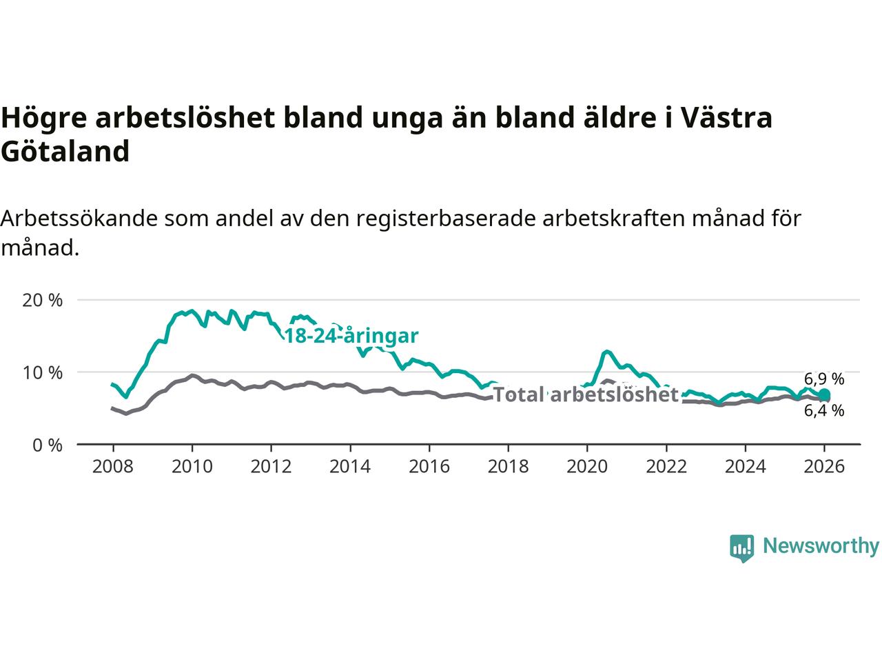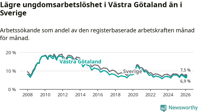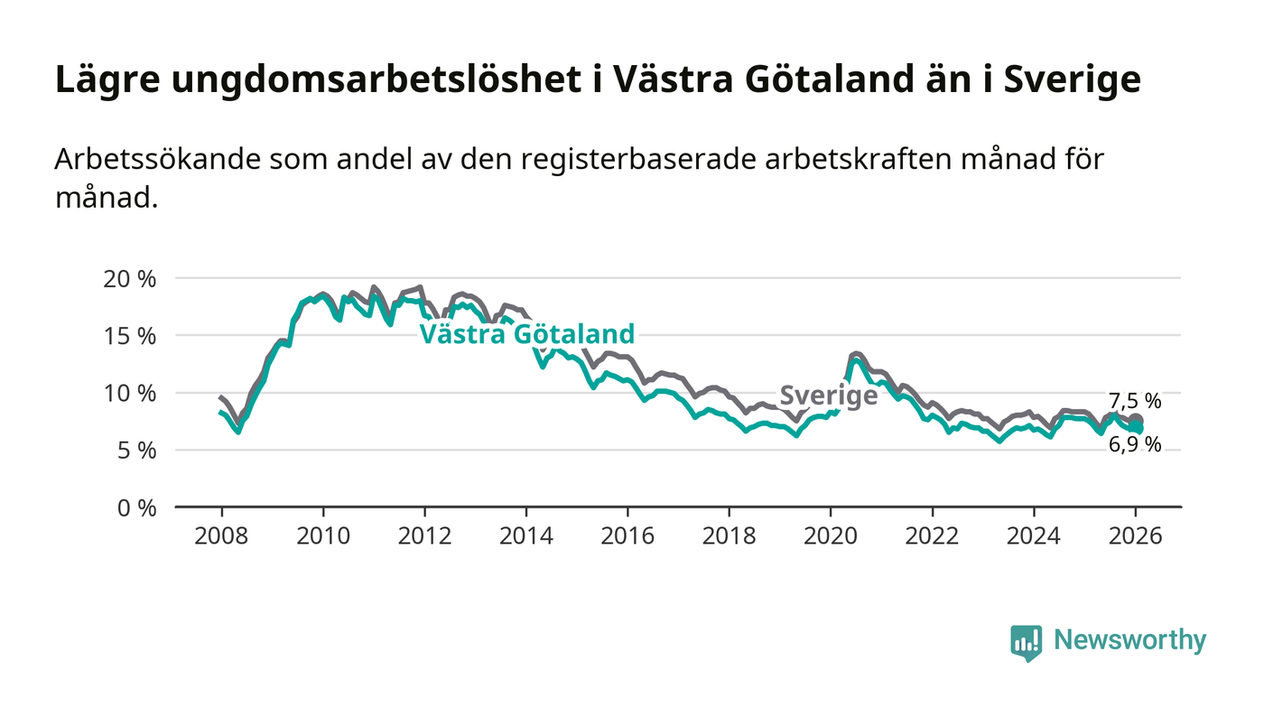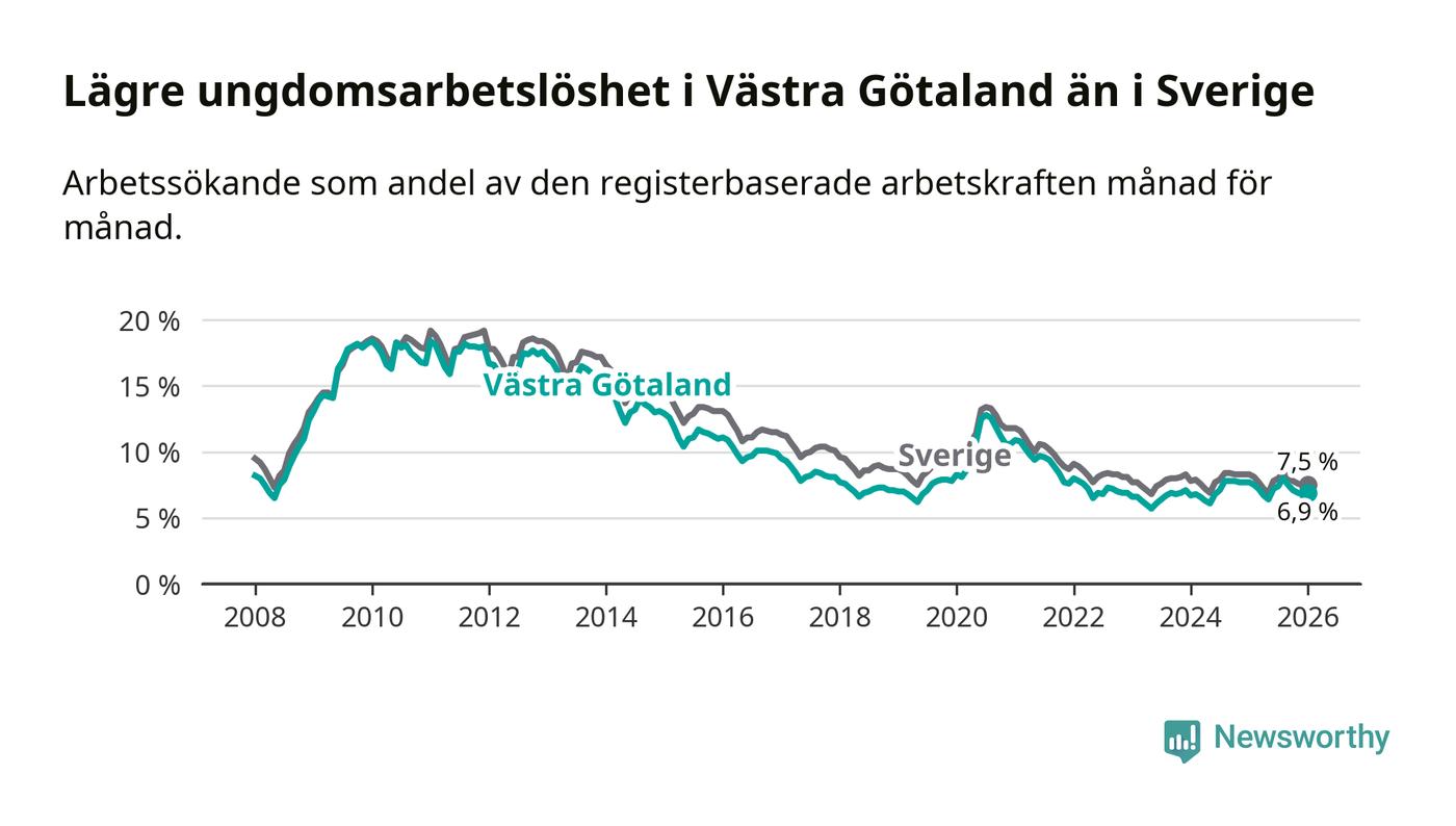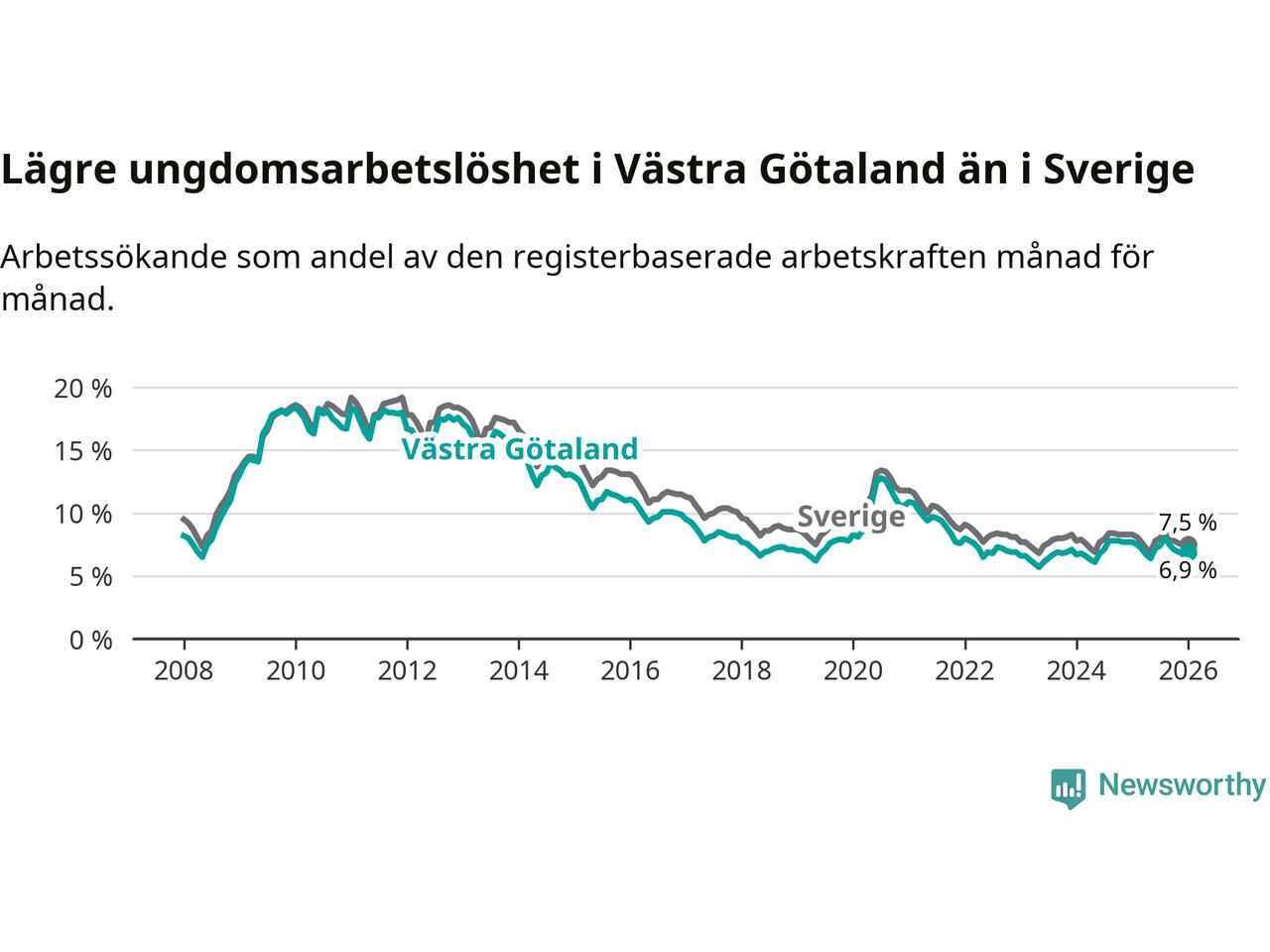 Precis som den totala arbetslösheten ligger ungdomsarbetslösheten i Västra Götaland lägre än i Sverige som helhet. Skillnaden mellan länet och riket är 0,6 procentenheter.
