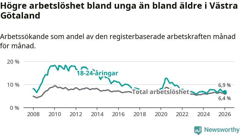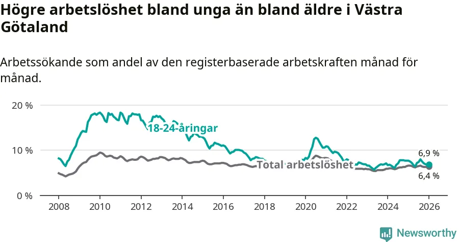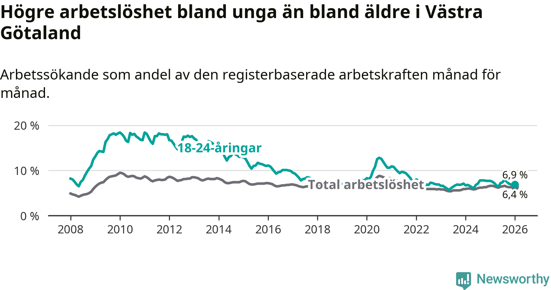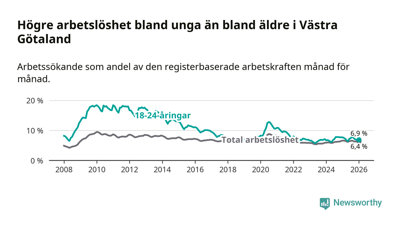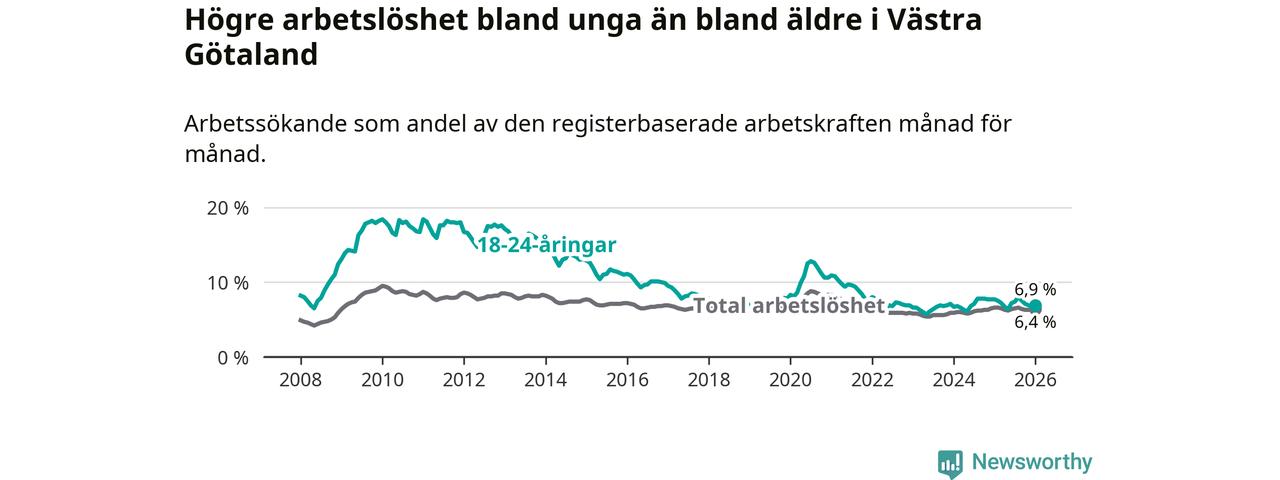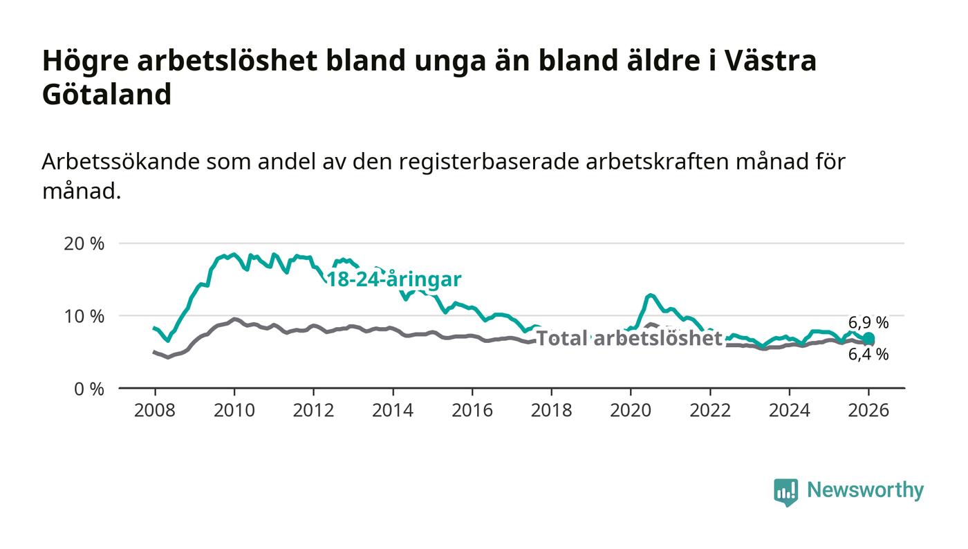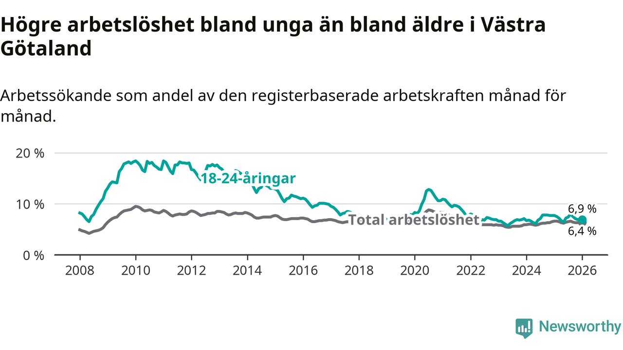 Precis som den totala arbetslösheten ligger ungdomsarbetslösheten i Västra Götaland lägre än i Sverige som helhet. Skillnaden mellan länet och riket är 0,6 procentenheter.