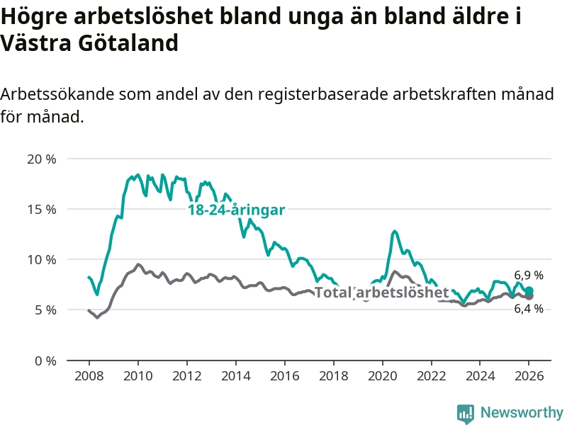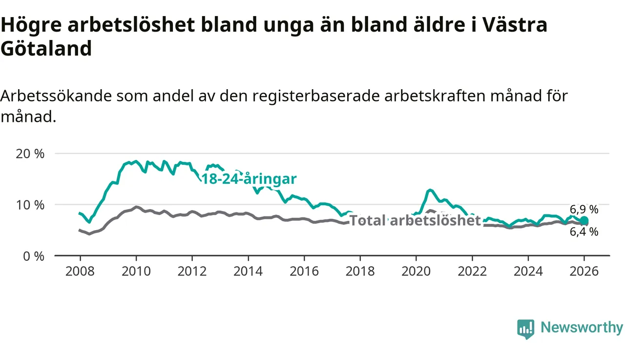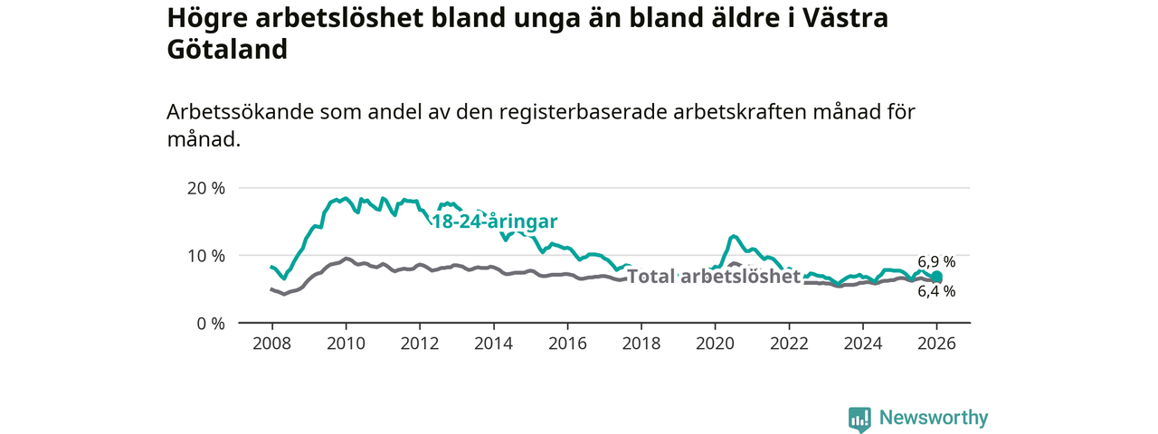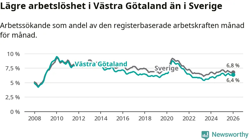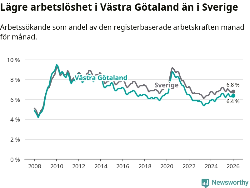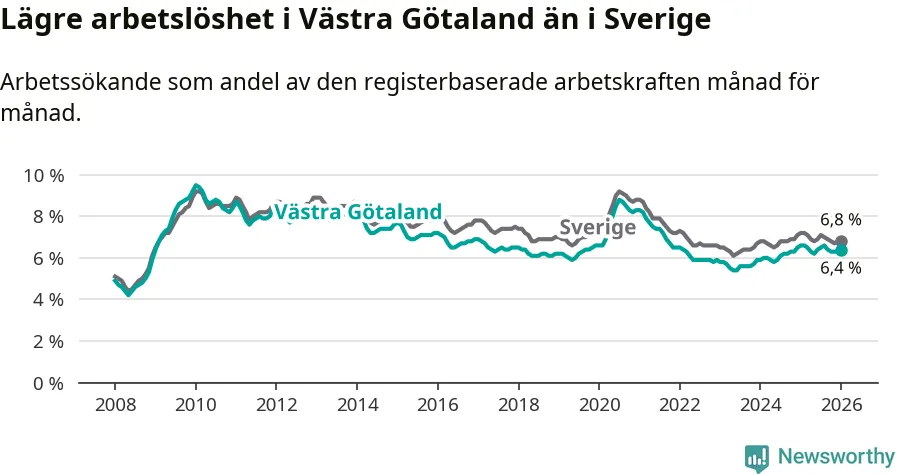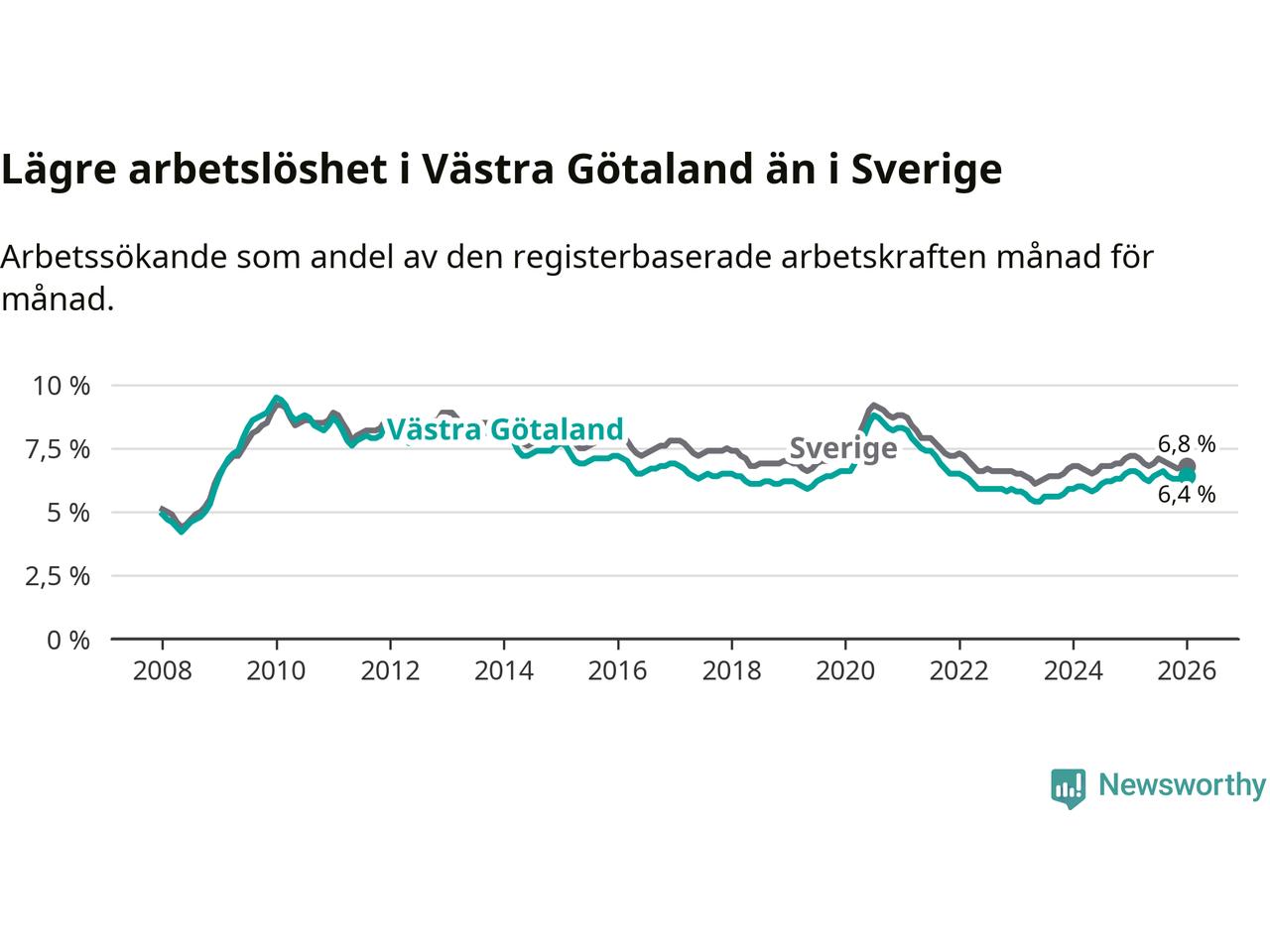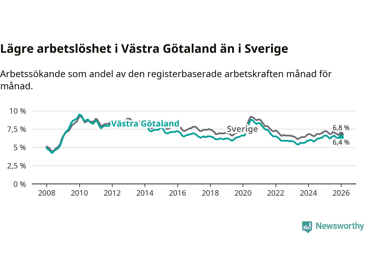 Under januari månad rapporterade Västra Götalands län en total arbetslöshet på 6,4 procent. Det är en minskning jämfört med samma tidpunkt i fjol (−0,2 procentenheter). Även i Sverige sjunker arbetslösheten .