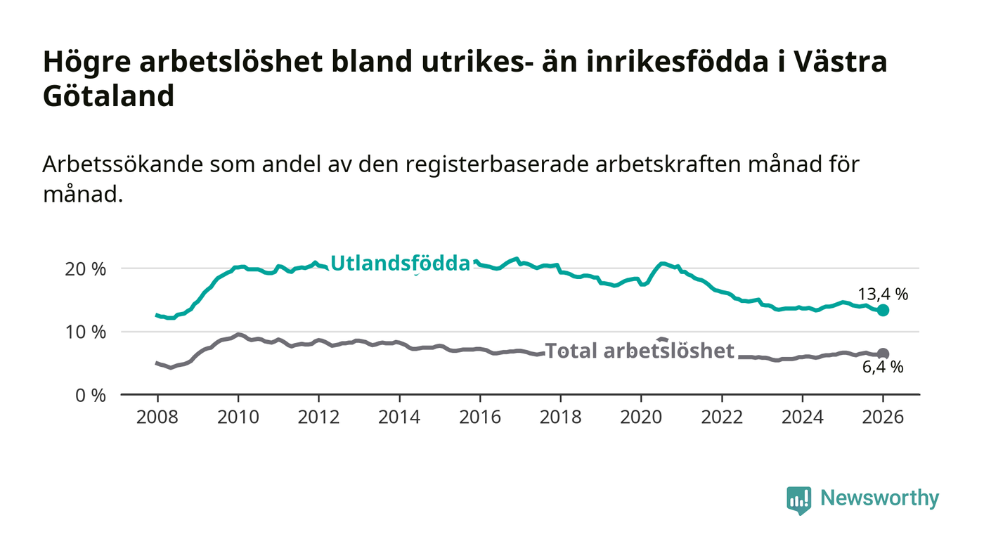 Arbetslösheten bland utlandsfödda var 13,4 procent i Västra Götaland under januari månad, motsvarande 30 040 av 224 179 personer. Det är 1,2 procentenheter färre än vid samma tidpunkt i fjol (−2 040 om man räknar personer).