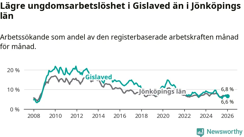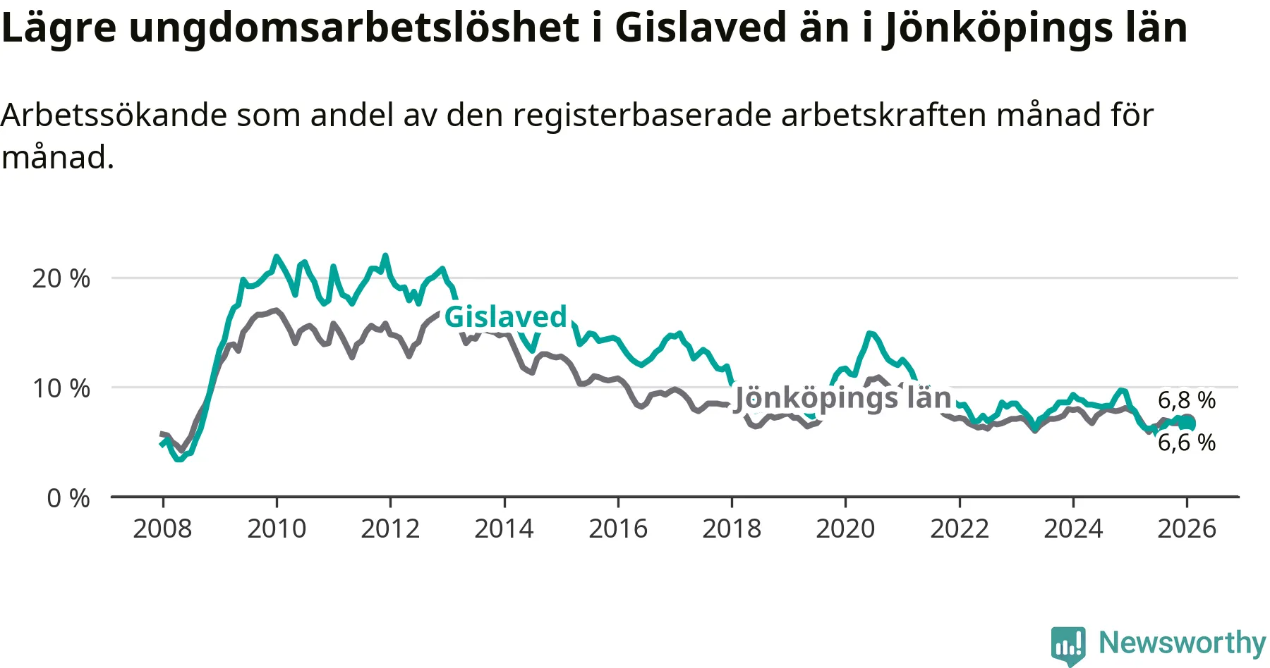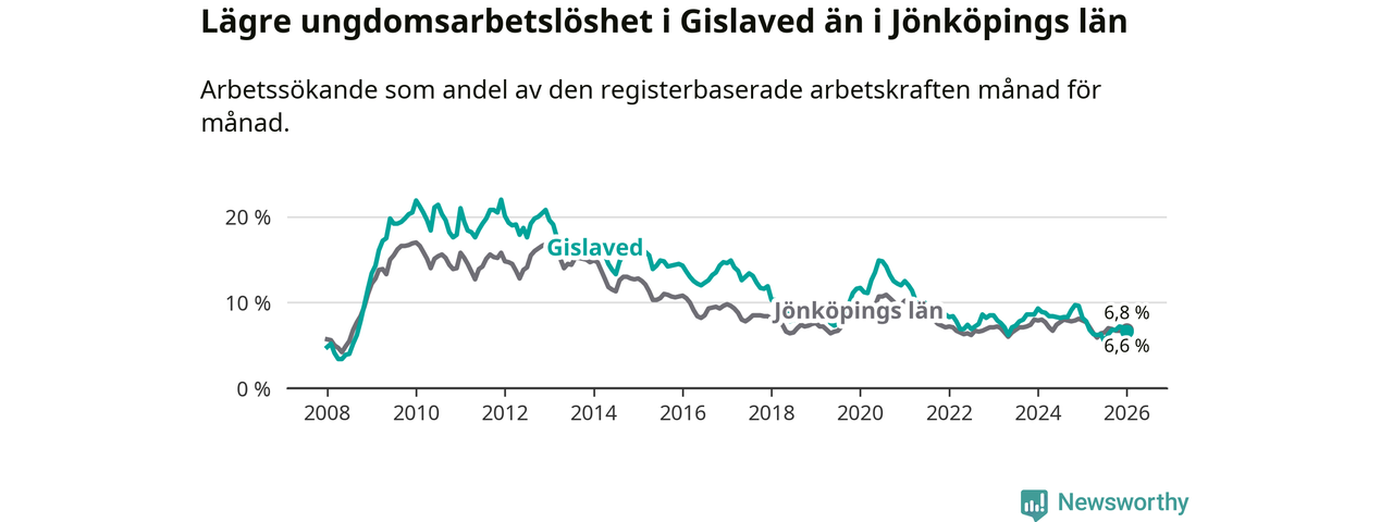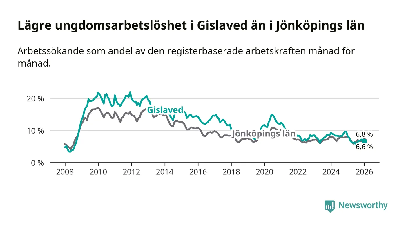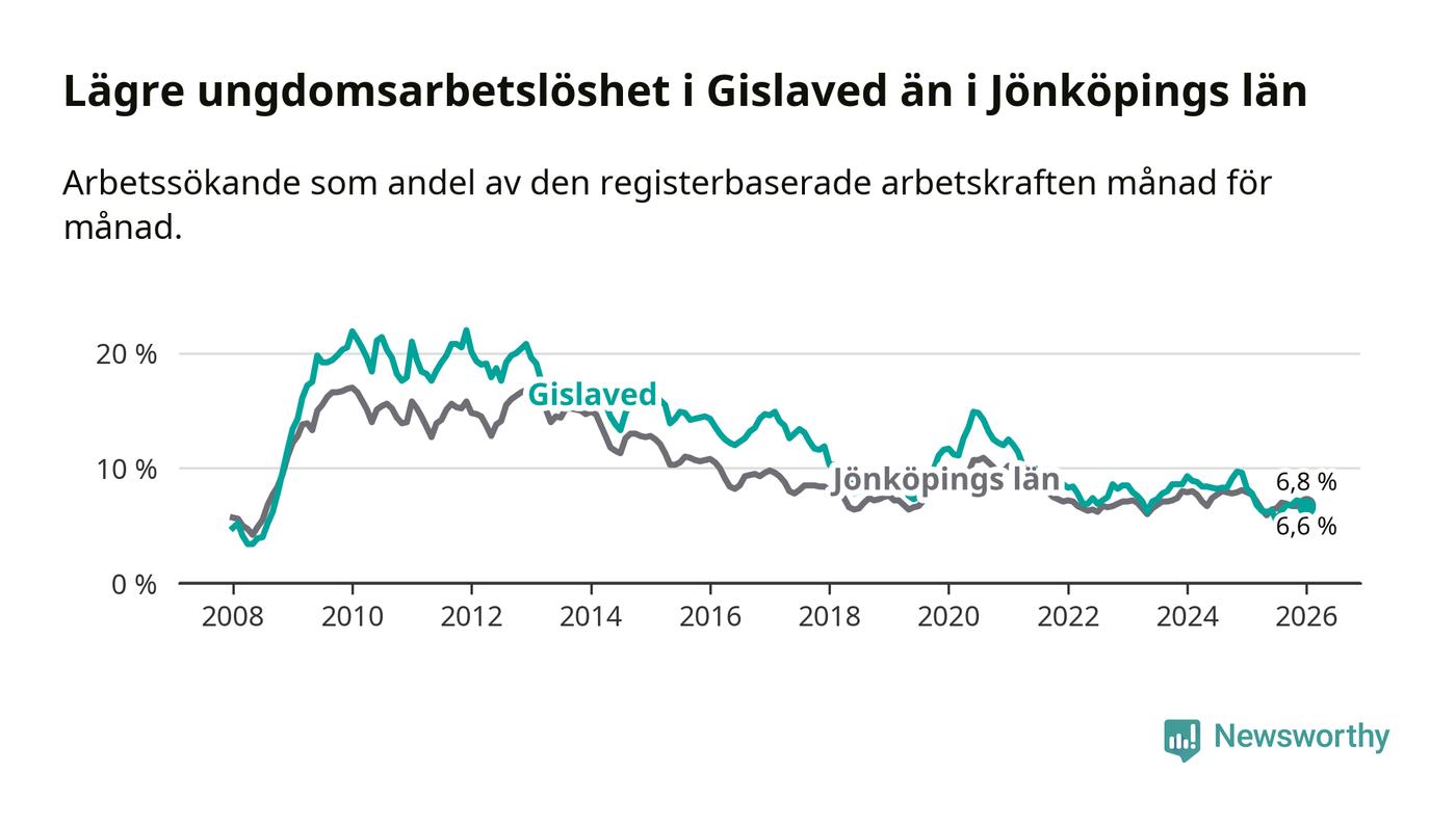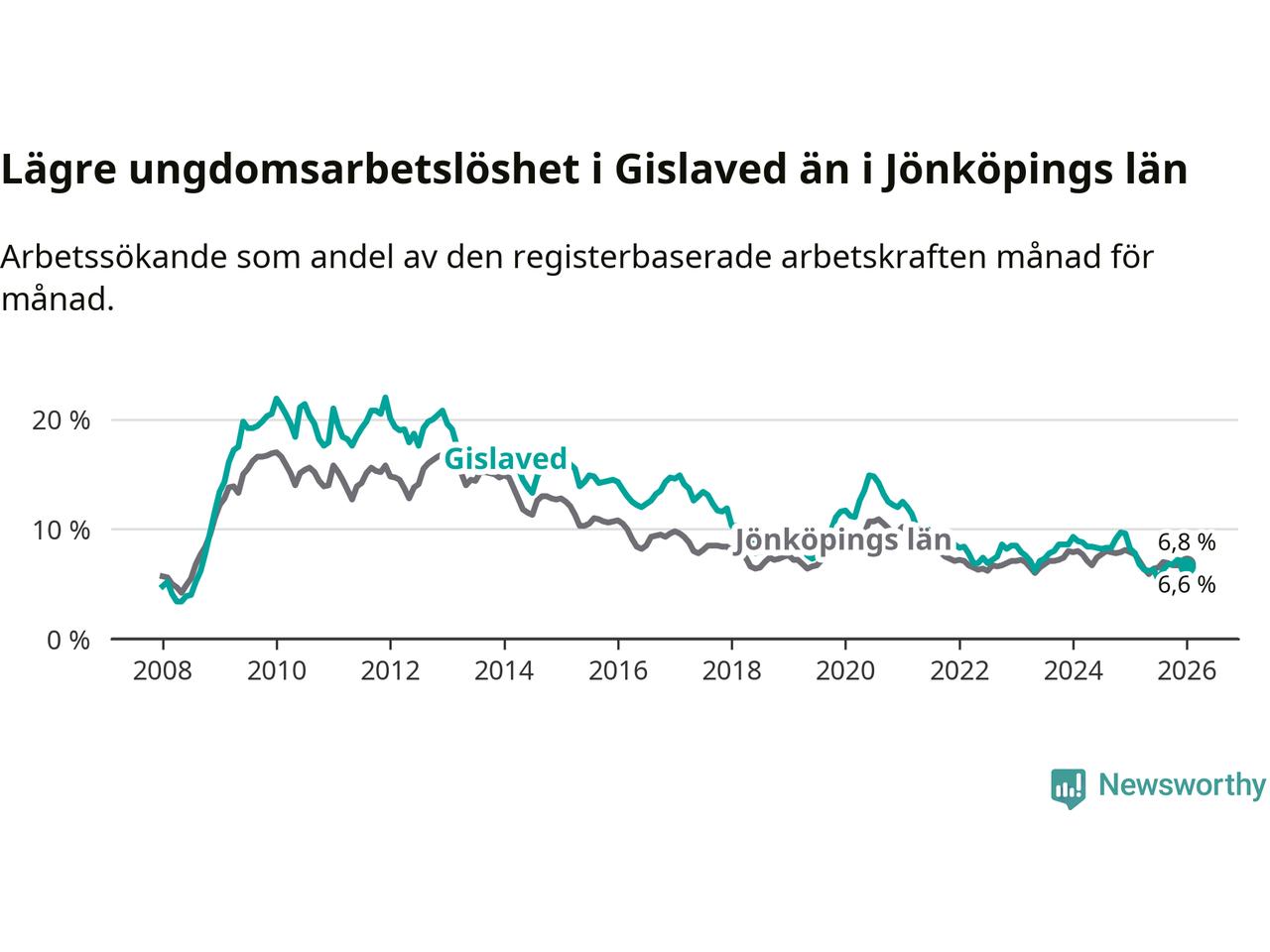Medan Gislaved har högre total arbetslöshet än Jönköpings län, ligger ungdomsarbetslösheten 0,2 procentenheter lägre i Gislaved.