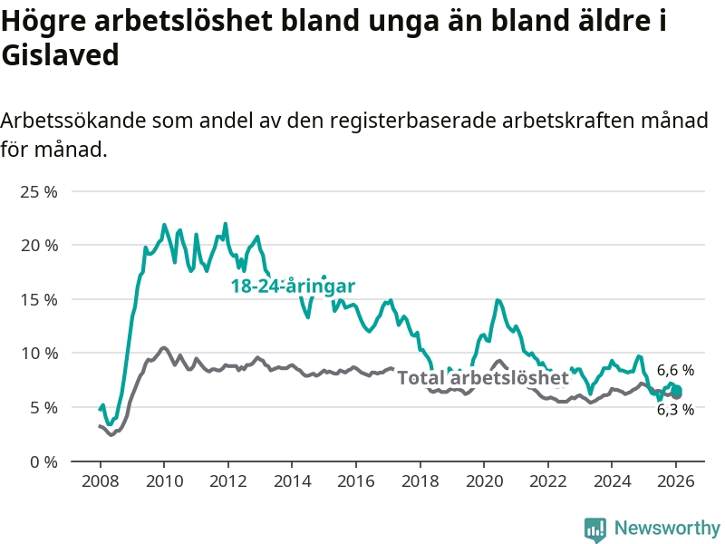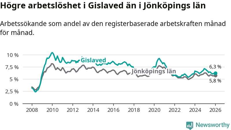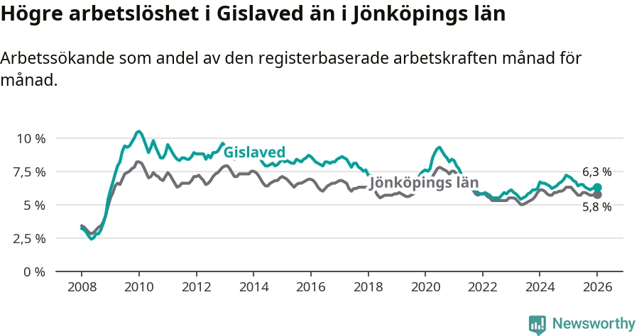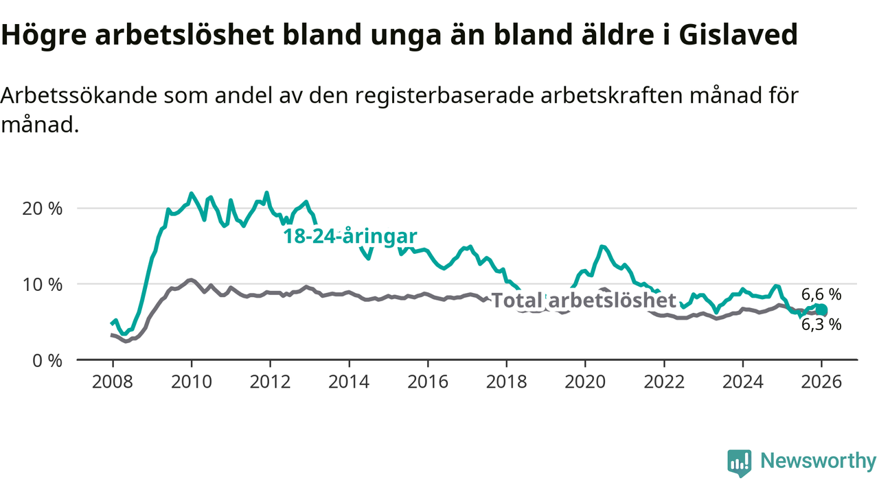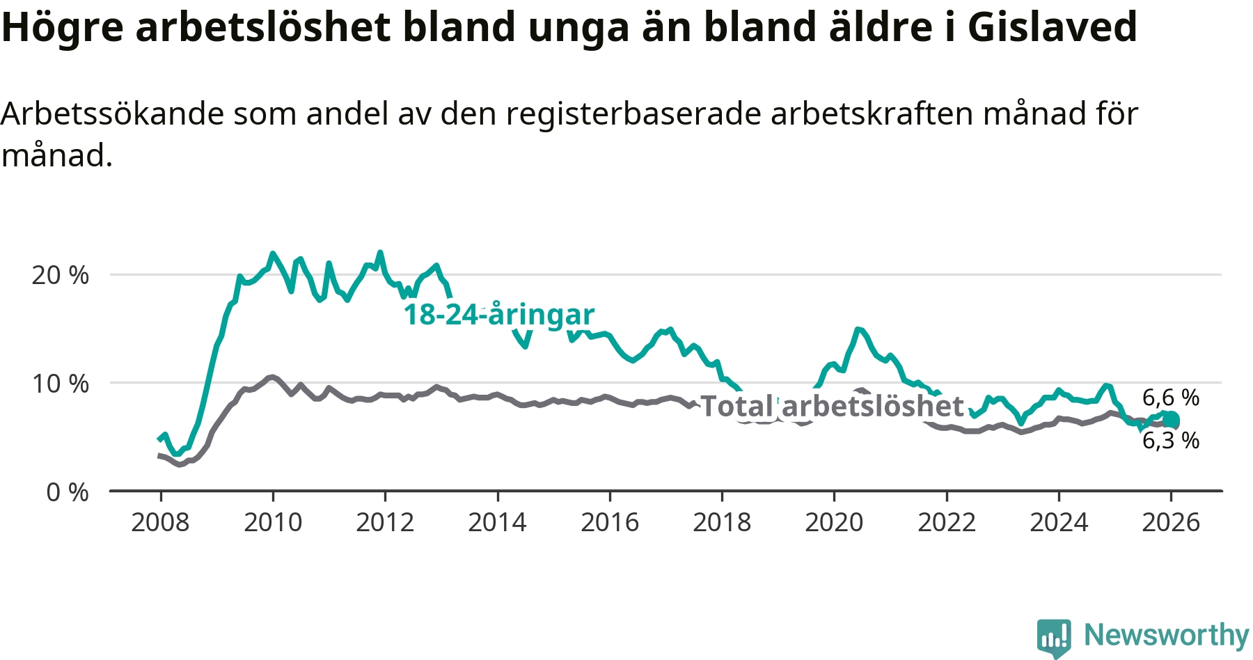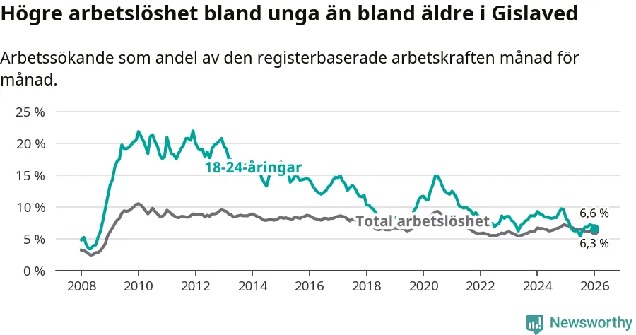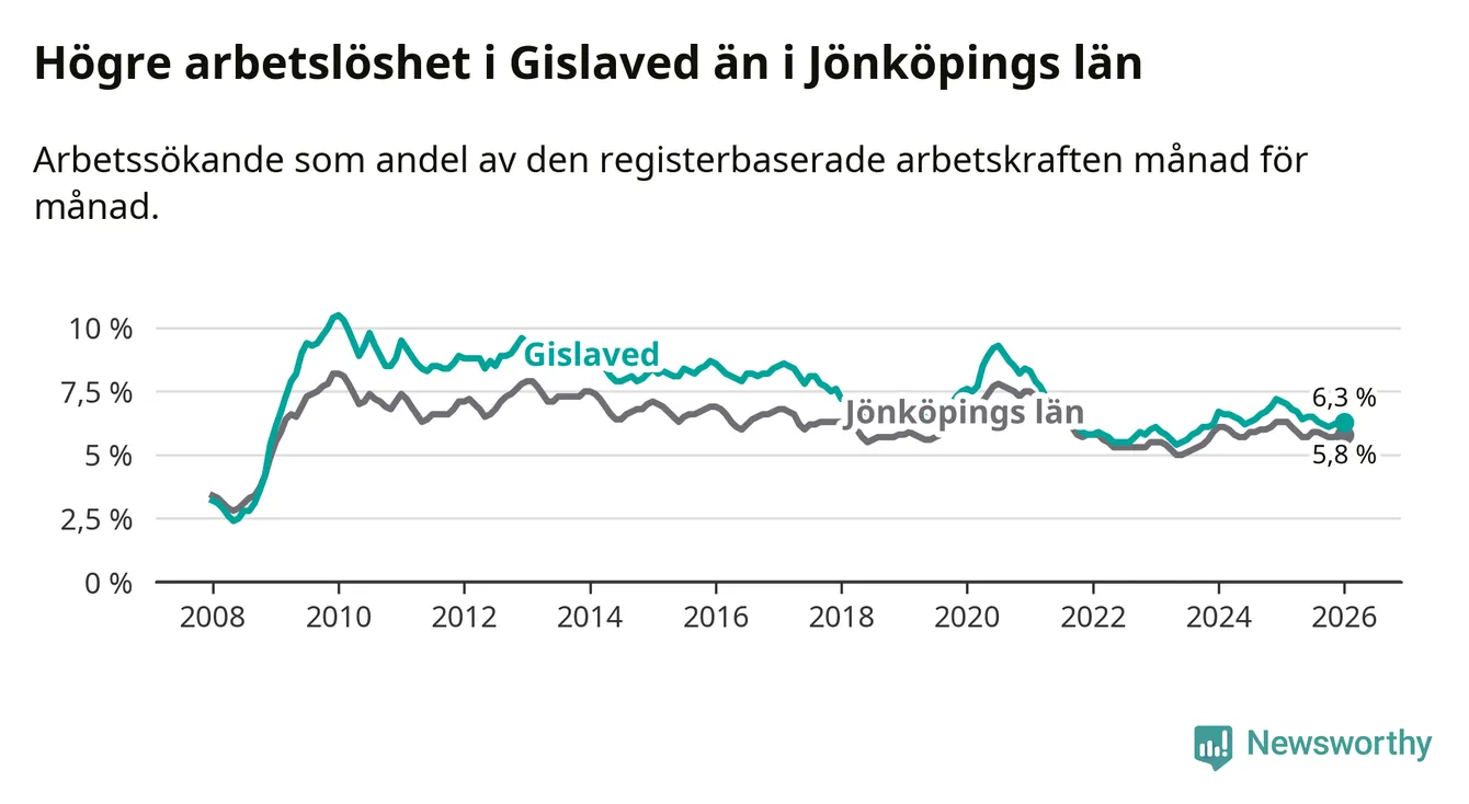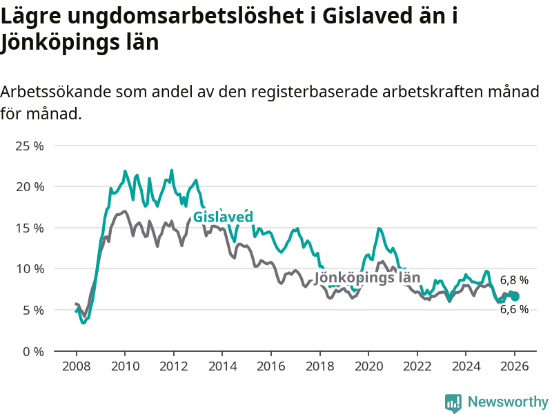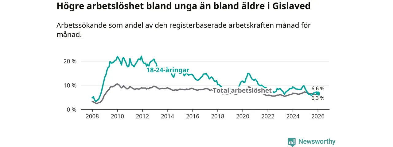 Medan Gislaved har högre total arbetslöshet än Jönköpings län, ligger ungdomsarbetslösheten 0,2 procentenheter lägre i Gislaved.
