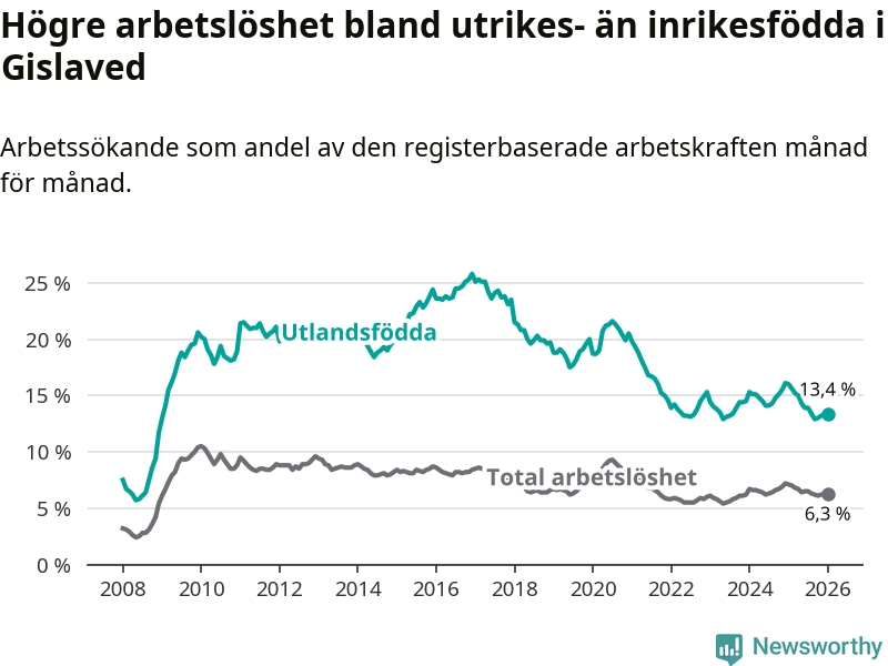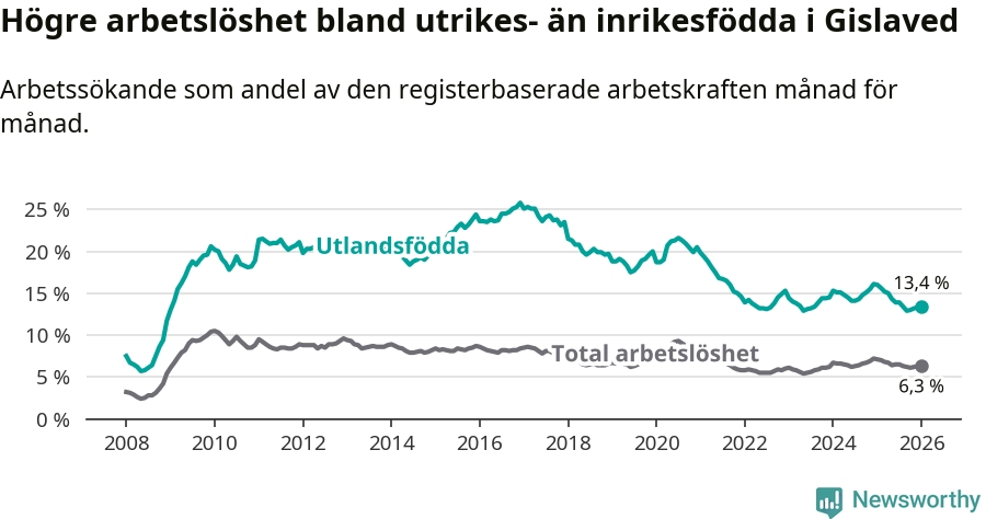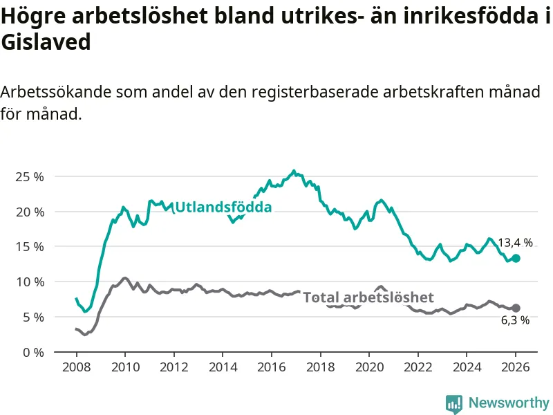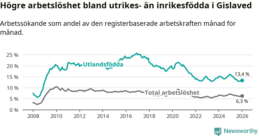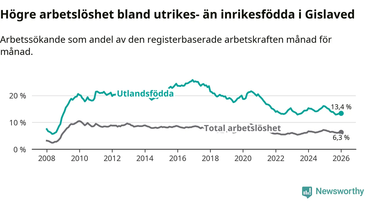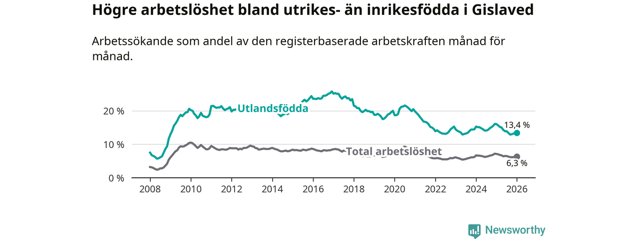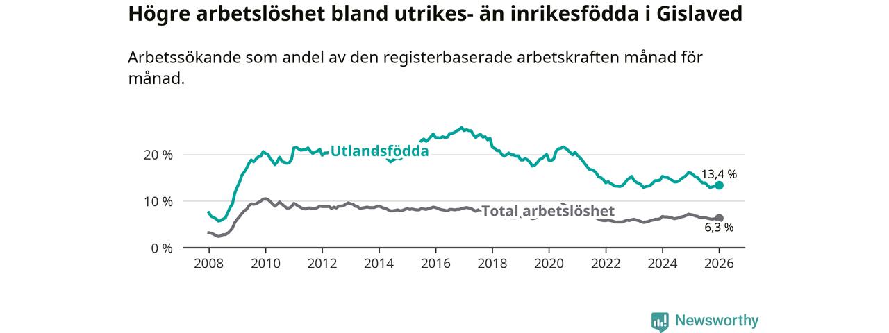 Arbetslösheten bland utlandsfödda var 13,4 procent i Gislaved under januari månad, motsvarande 607 av 4 530 personer. Det är 2,6 procentenheter färre än vid samma tidpunkt i fjol (−116 om man räknar personer). Därmed är de utlandsföddas arbetslöshet lägre än vid samma tidpunkt i fjol för nionde månaden i följd. Sedan april 2025 har arbetslösheten bland utlandsfödda minskat från 15,0 till 13,4 procent.