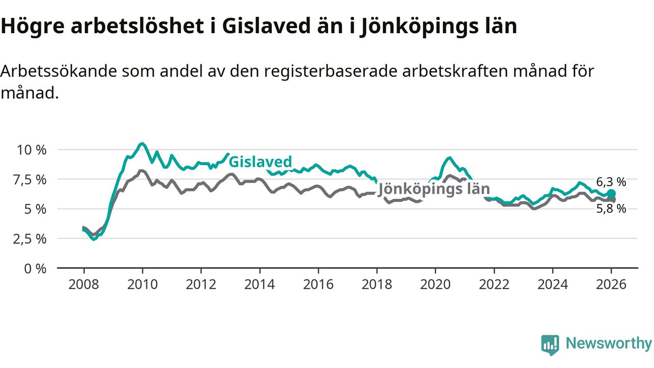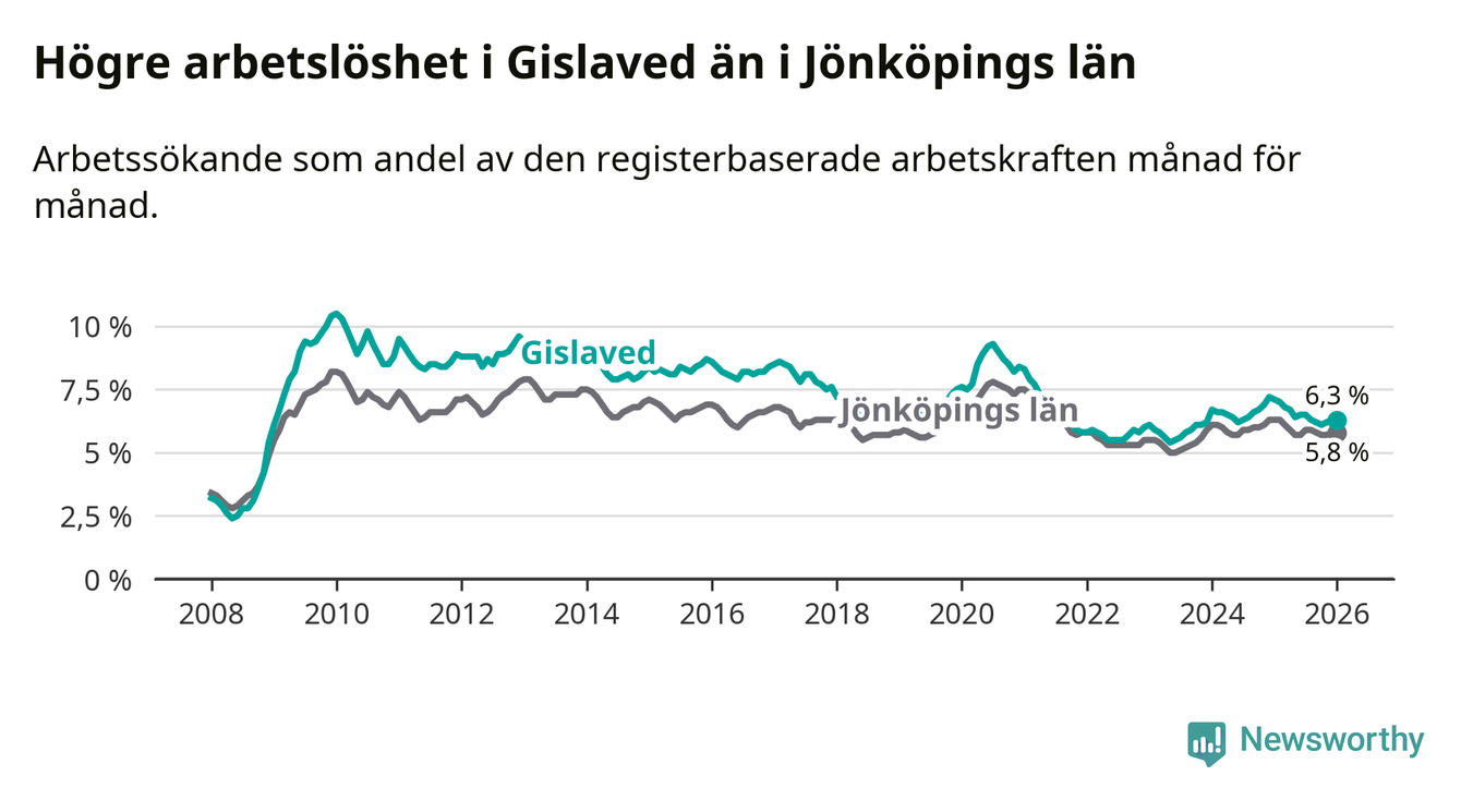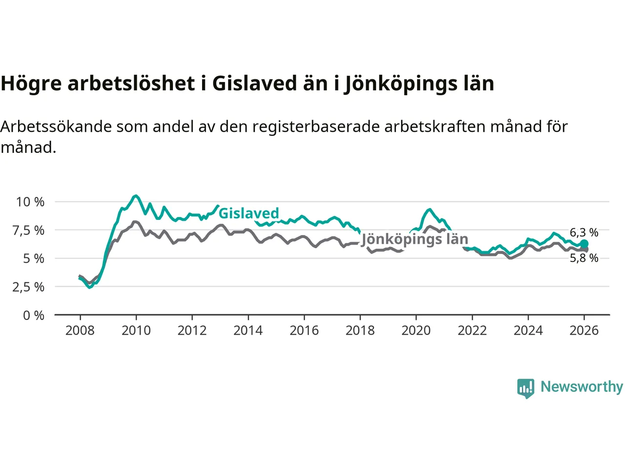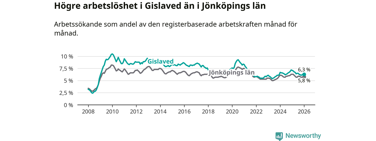 Arbetslösheten bland utlandsfödda var 13,4 procent i Gislaved under januari månad, motsvarande 607 av 4 530 personer. Det är 2,6 procentenheter färre än vid samma tidpunkt i fjol (−116 om man räknar personer). Därmed är de utlandsföddas arbetslöshet lägre än vid samma tidpunkt i fjol för nionde månaden i följd. Sedan april 2025 har arbetslösheten bland utlandsfödda minskat från 15,0 till 13,4 procent.
