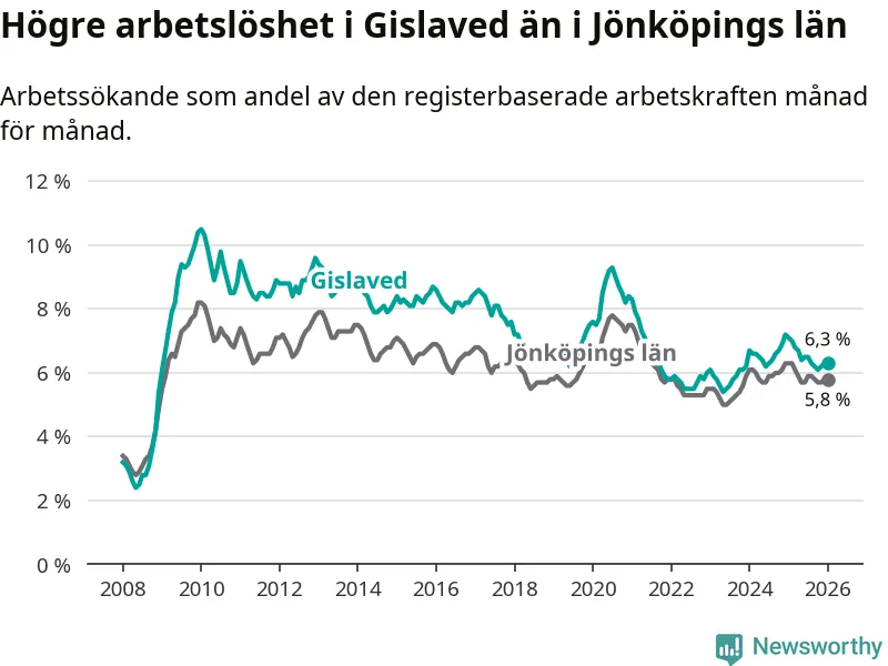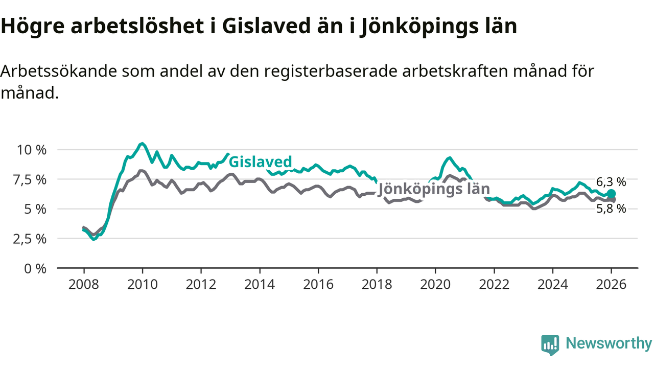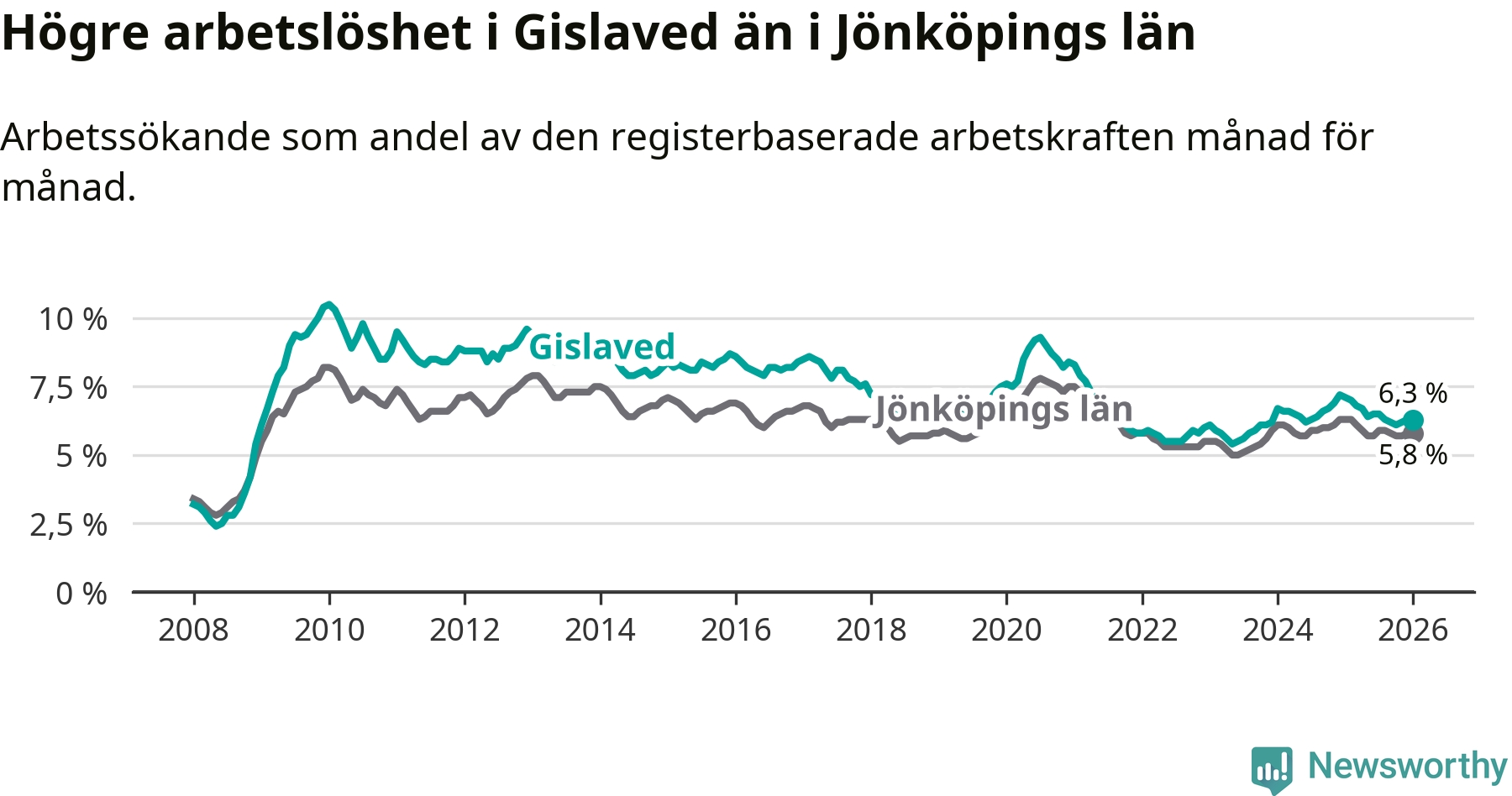 Graf: Arbetslöshet i Gislaveds kommun och Jönköpings län