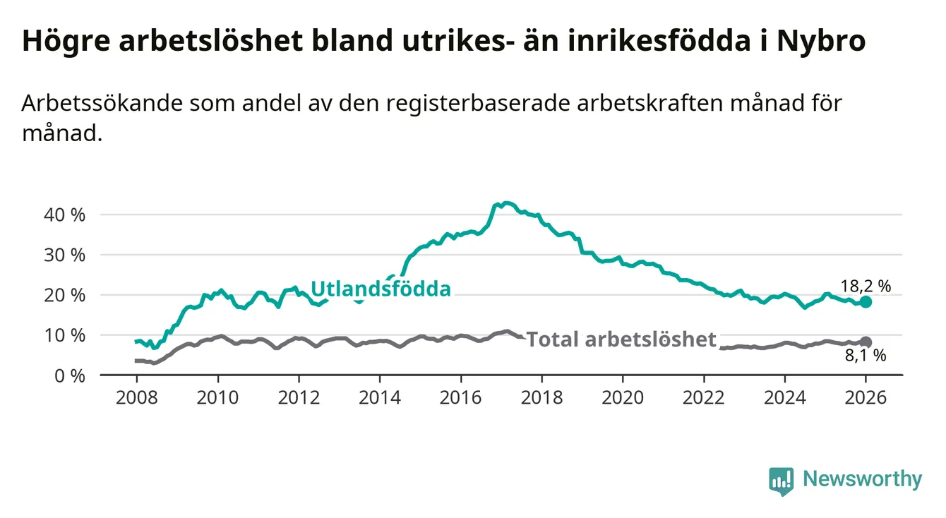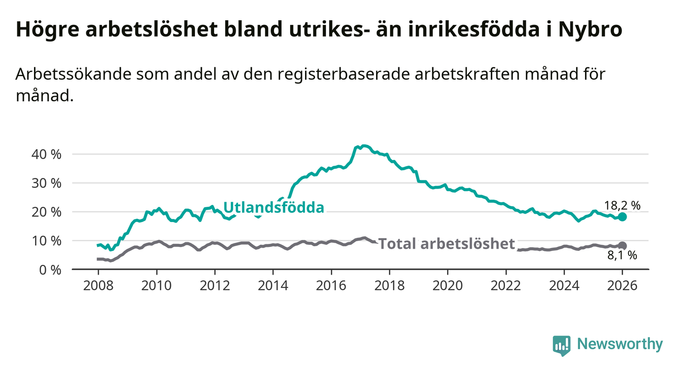 Skillnaden i arbetslöshet mellan utrikesfödda och hela befolkningen är 10,1 procentenheter i Nybro. Det är en betydligt mindre skillnad än för ett år sedan (−1,6 procentenheter).