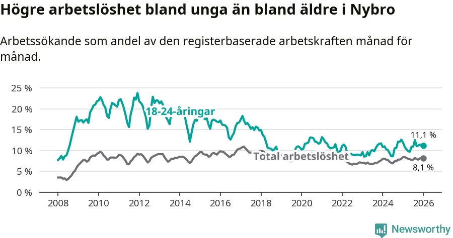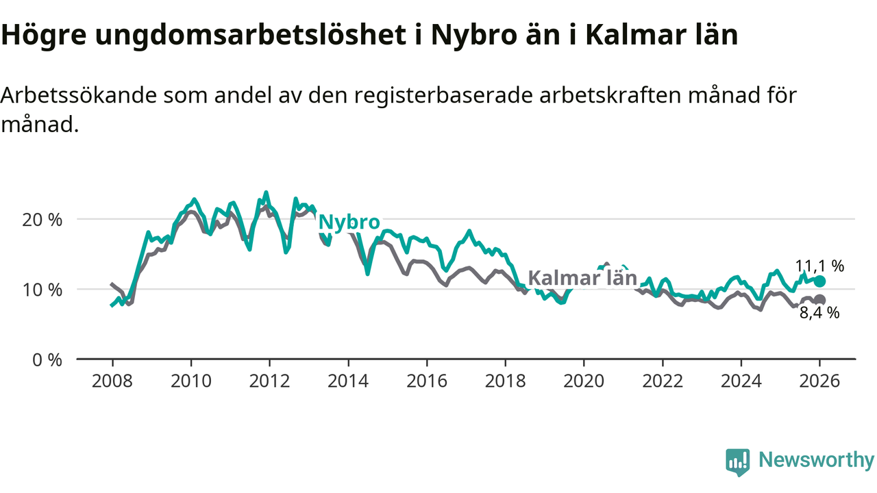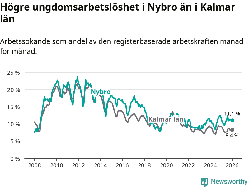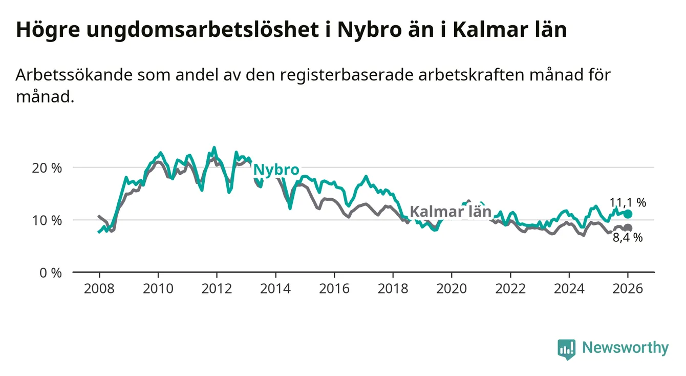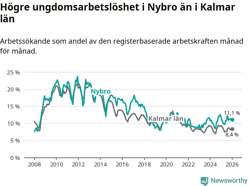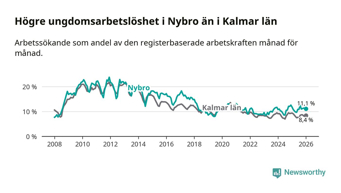 Precis som den totala arbetslösheten ligger ungdomsarbetslösheten i Nybro högre än i Kalmar län som helhet. Skillnaden mellan kommunen och länet är 2,7 procentenheter.