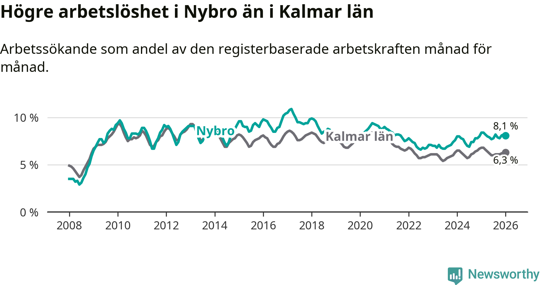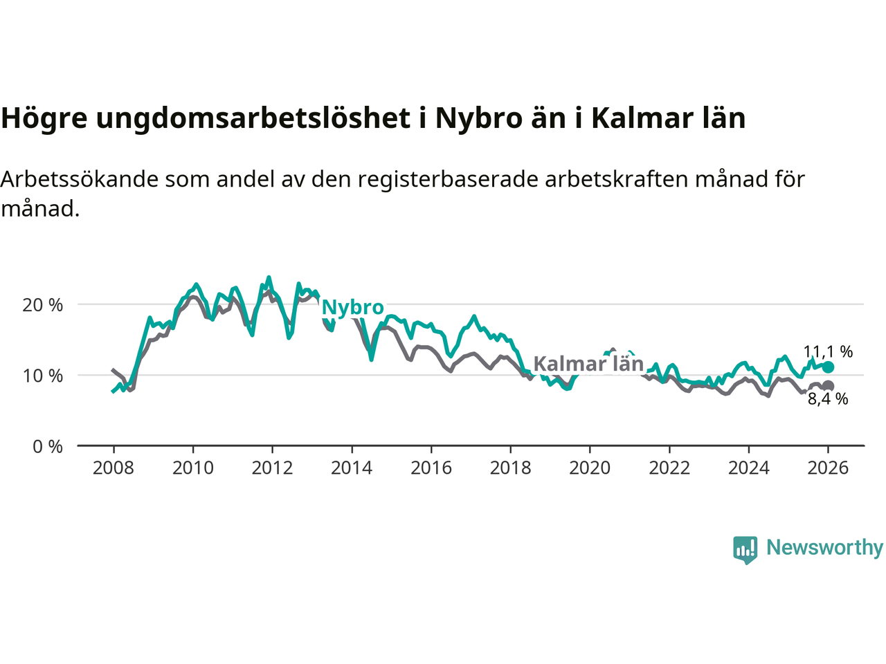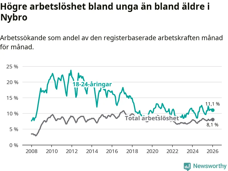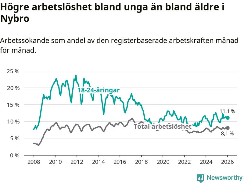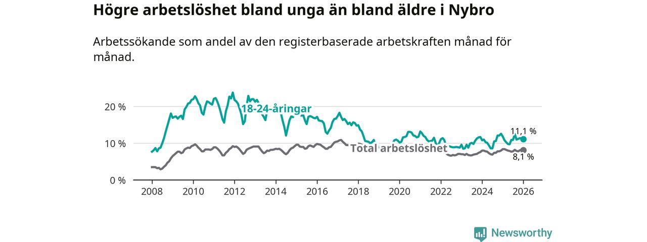Precis som den totala arbetslösheten ligger ungdomsarbetslösheten i Nybro högre än i Kalmar län som helhet. Skillnaden mellan kommunen och länet är 2,7 procentenheter.