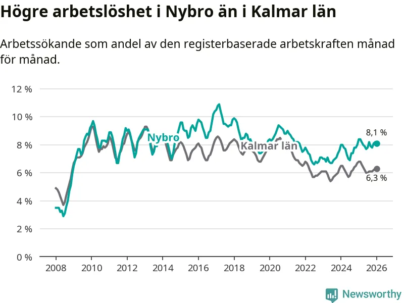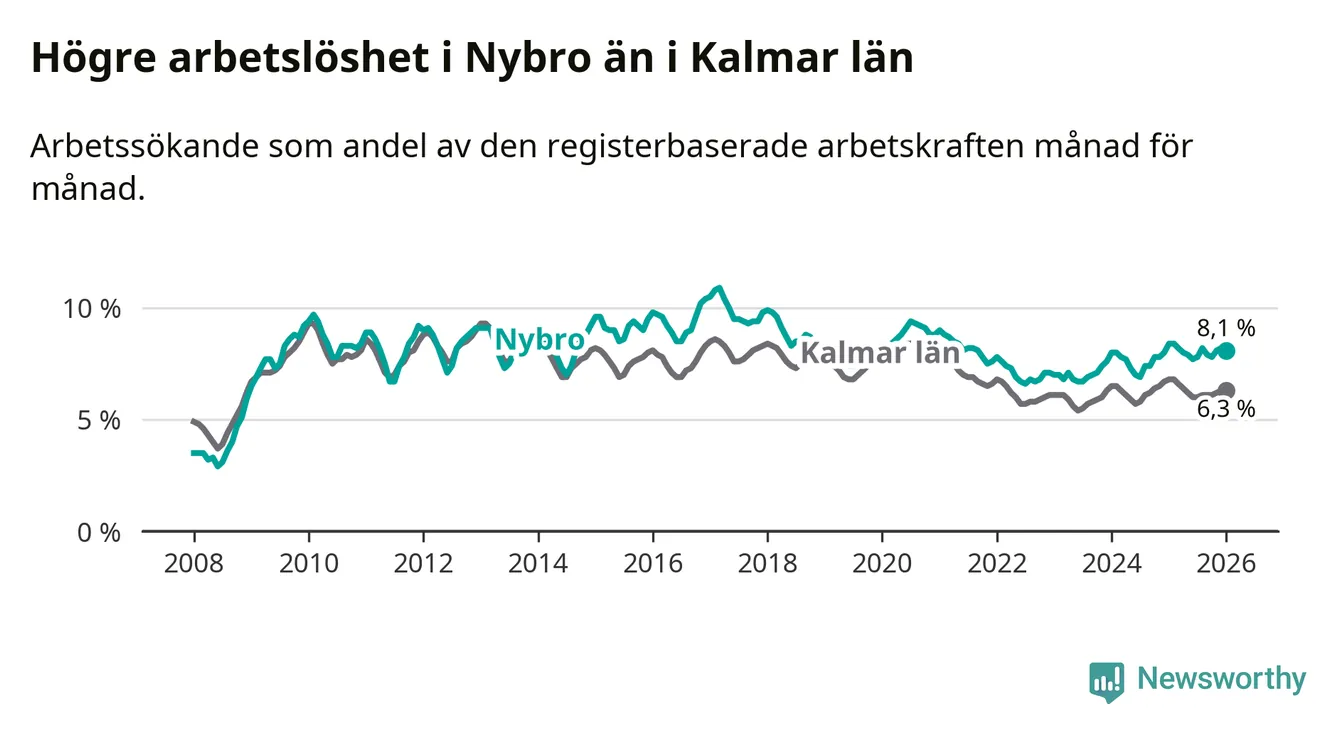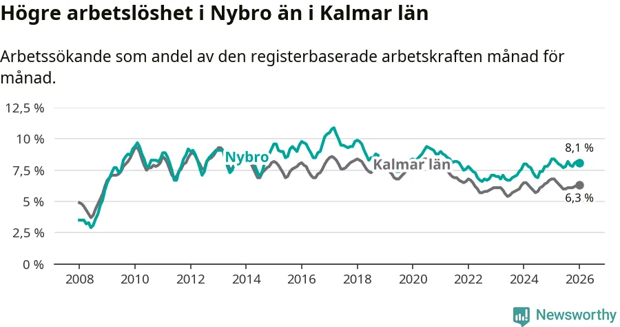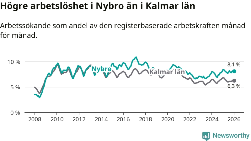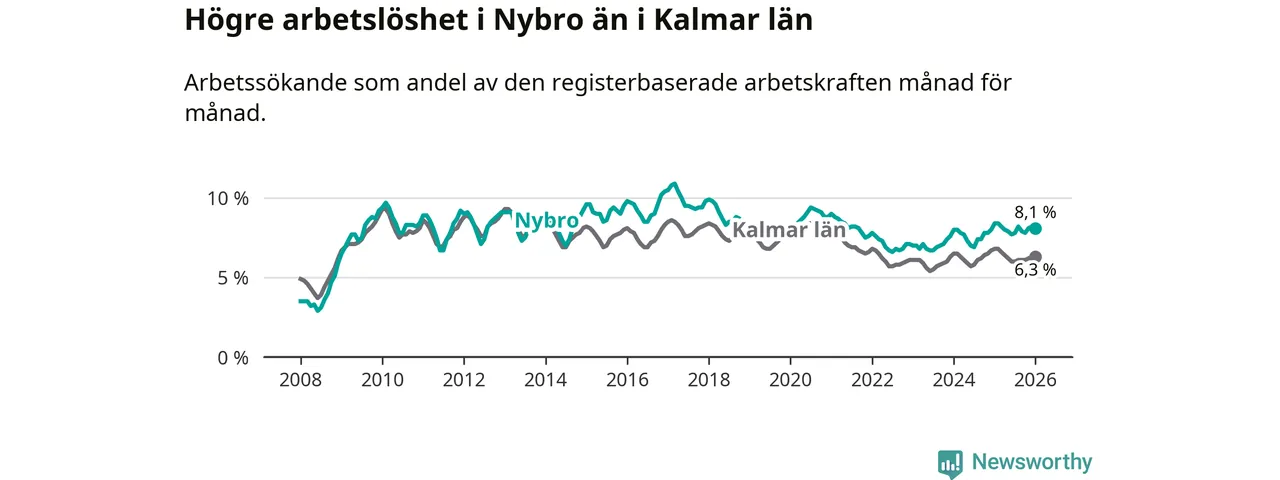 Under januari månad rapporterade Nybro kommun en total arbetslöshet på 8,1 procent. Det är en minskning jämfört med samma tidpunkt i fjol (−0,3 procentenheter). Även i Kalmar län sjunker arbetslösheten .