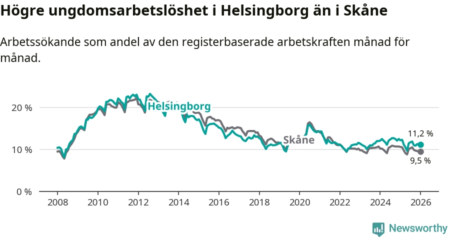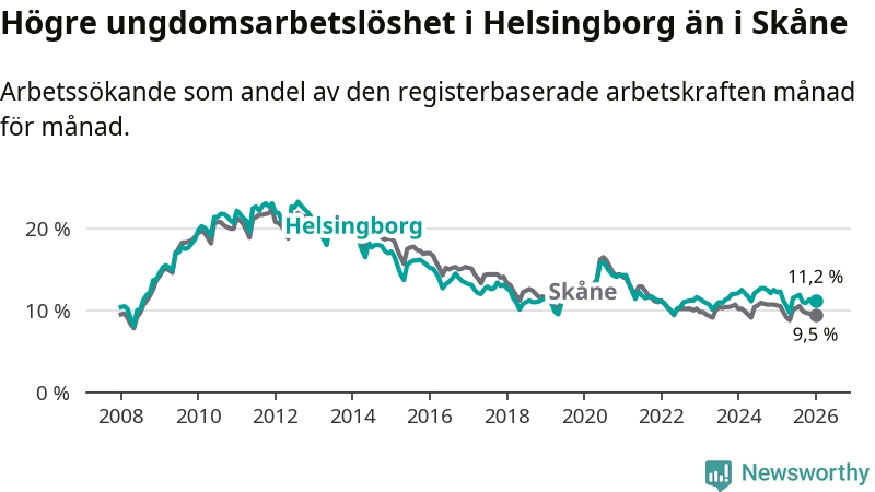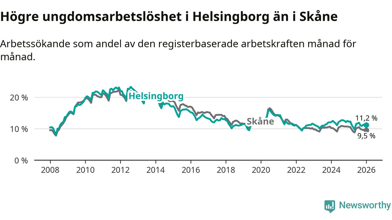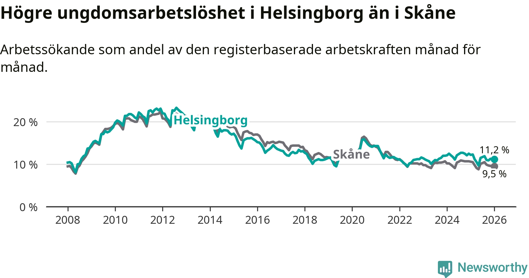 Precis som den totala arbetslösheten ligger ungdomsarbetslösheten i Helsingborg högre än i Skåne som helhet. Skillnaden mellan kommunen och länet är 1,7 procentenheter.
