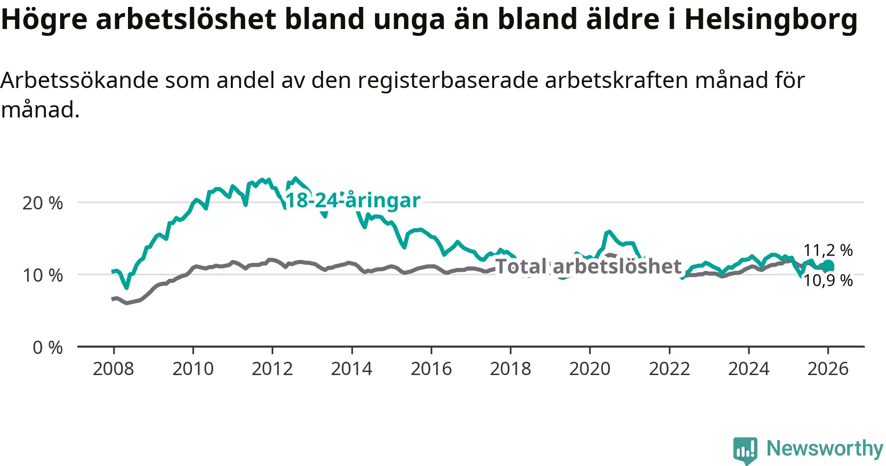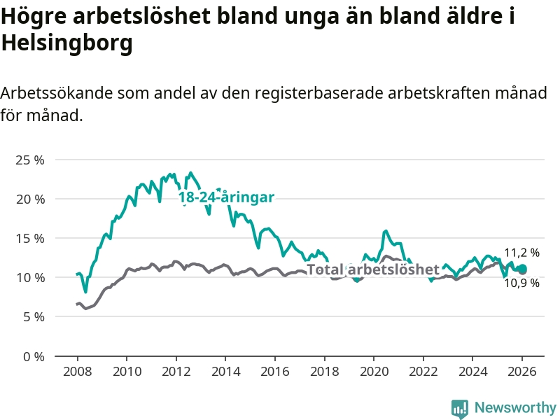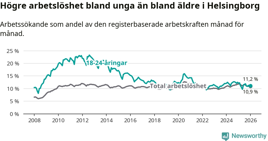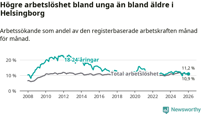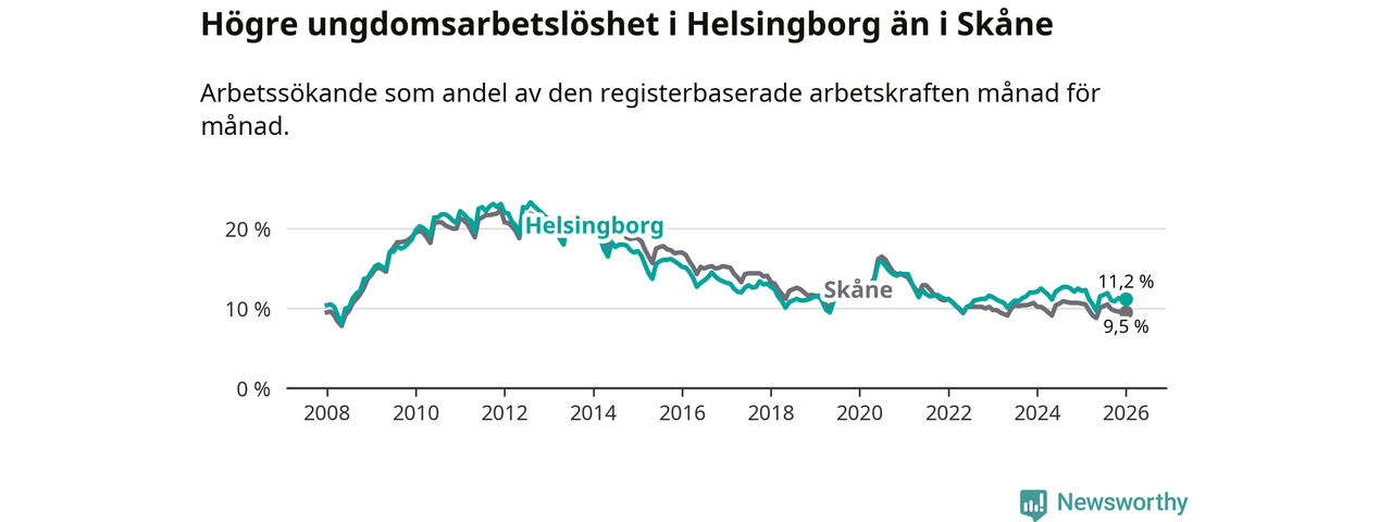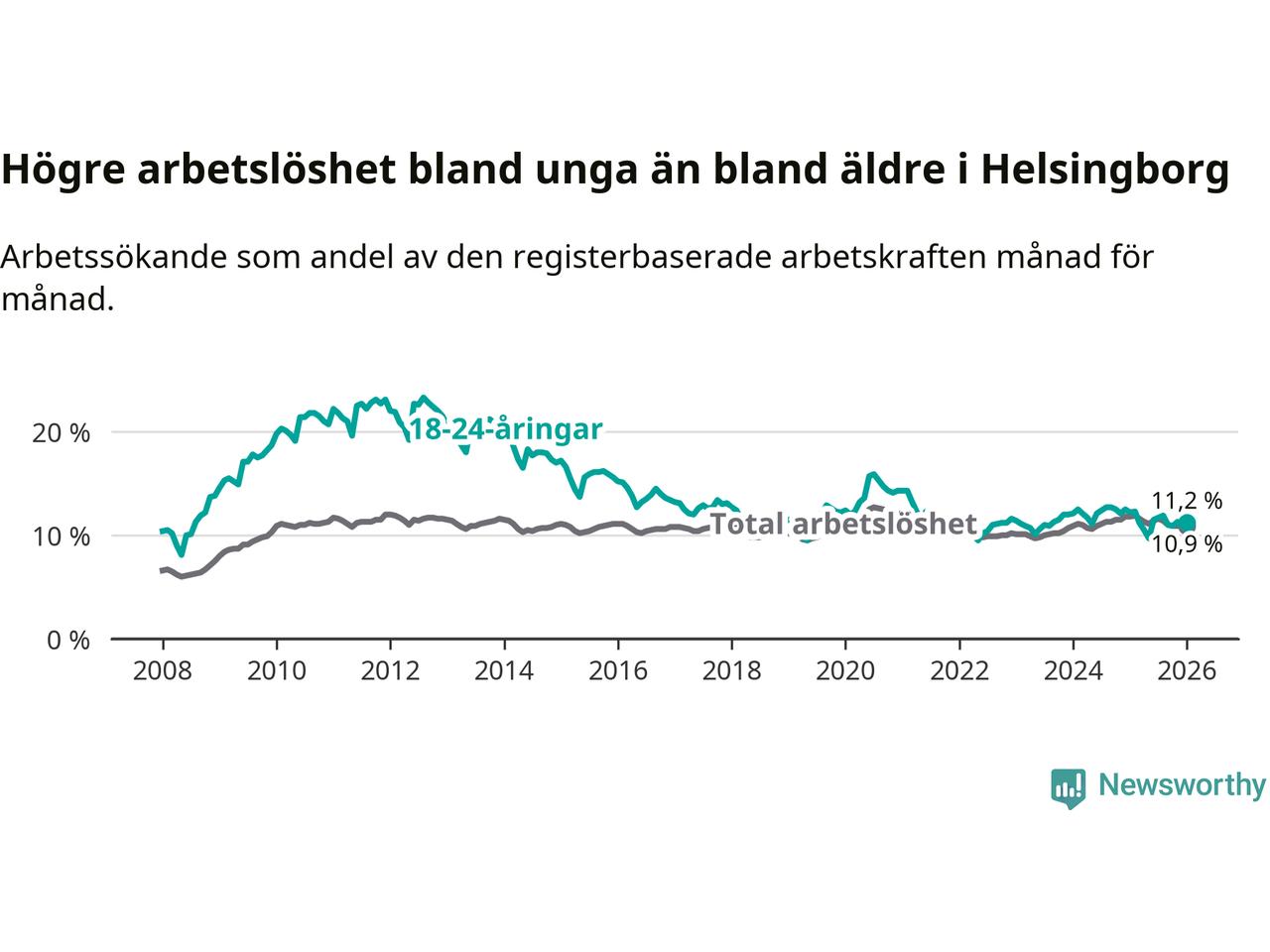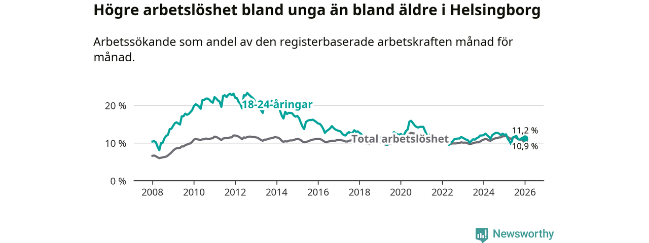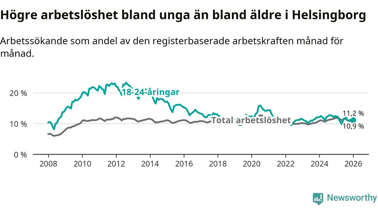 I och med den senaste månadens nedgång har de ungas arbetslöshet i Helsingborg sjunkit tolv månader i följd (ner från 12,2 procent i januari 2025 till 11,2 procent nu).