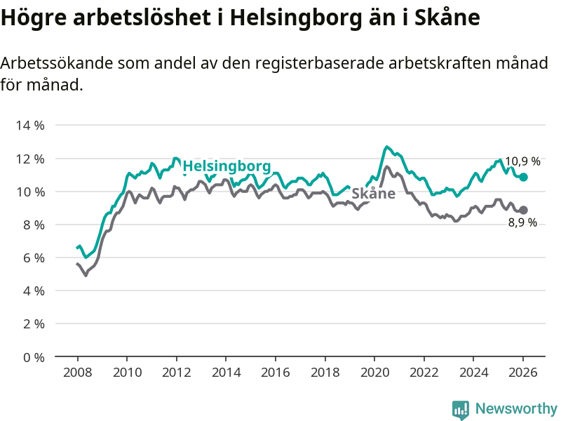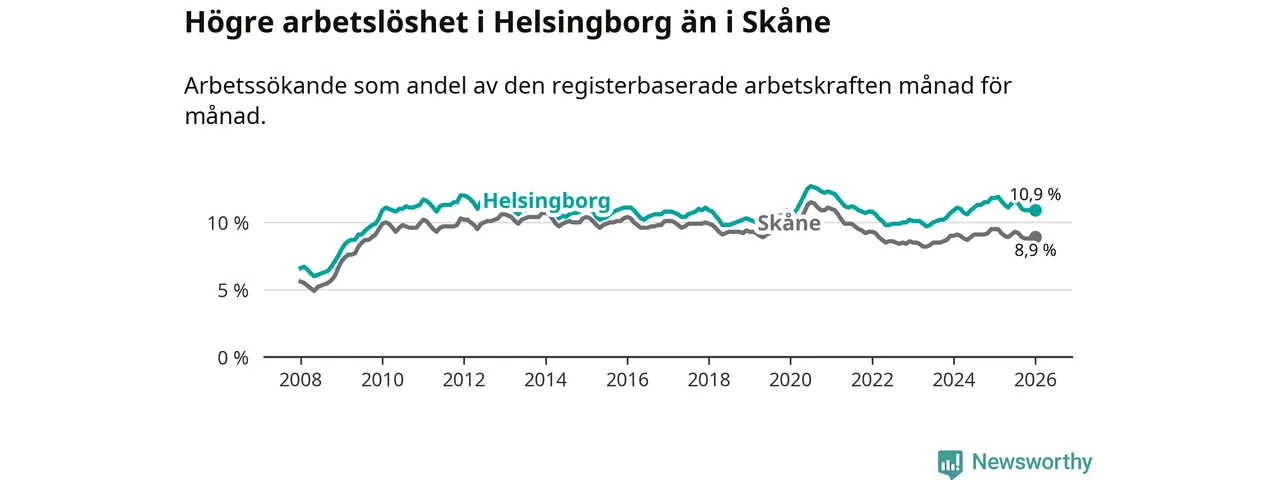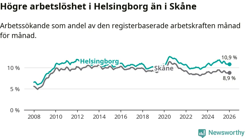 Även om arbetslösheten i Helsingborg alltså minskar, så ligger den fortfarande över snittet i hela Skåne län (10,9 procent i kommunen, jämfört med 8,9 procent i hela länet). Lomma har den lägsta arbetslösheten i länet (3,9 procent), medan Perstorp har den högsta (13,4 procent). För att Helsingborg skulle komma ner i samma arbetslöshetsnivå som Lomma skulle 5 353 personer behöva sysselsättas.