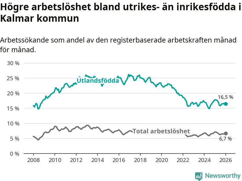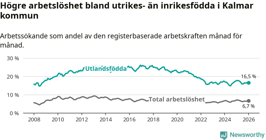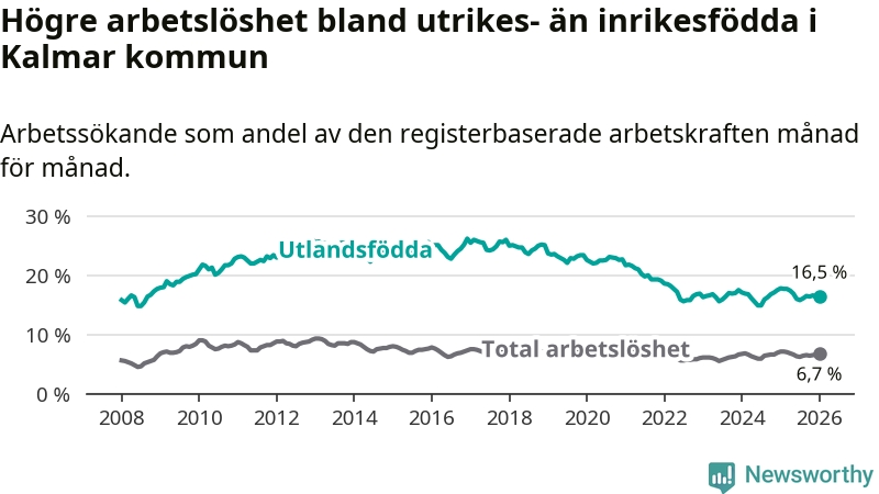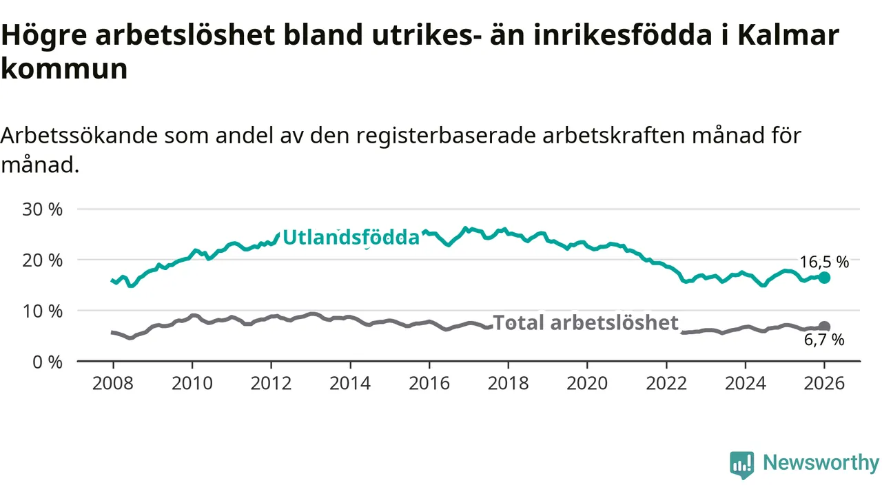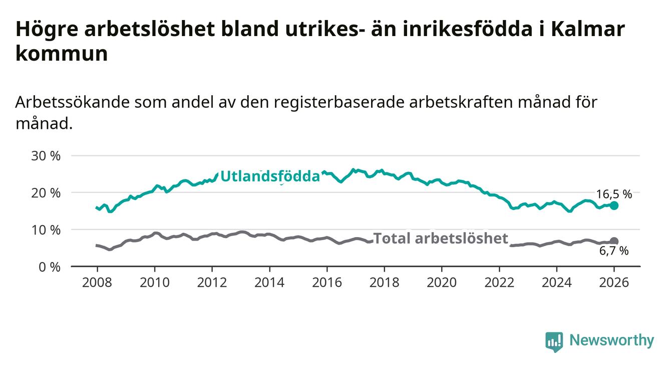 Arbetslösheten bland utlandsfödda var 16,5 procent i Kalmar under januari månad, motsvarande 1 194 av 7 236 personer. Det är 1,3 procentenheter färre än vid samma tidpunkt i fjol (−75 om man räknar personer).