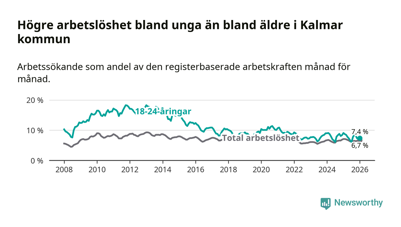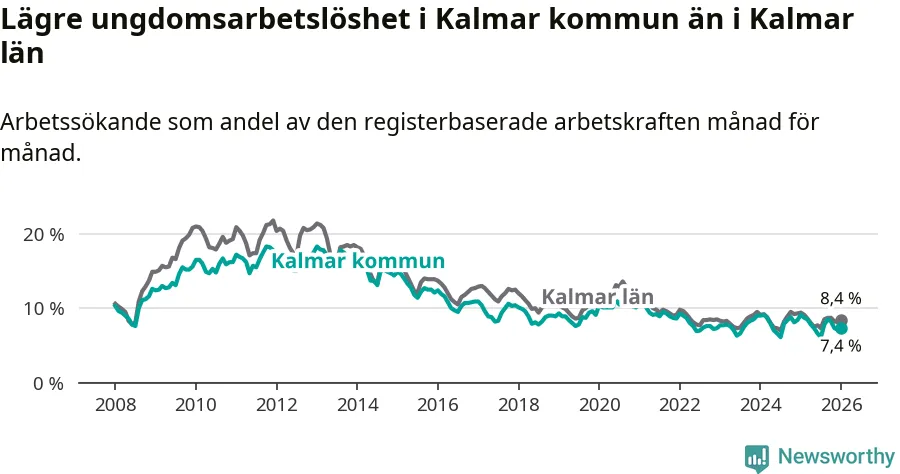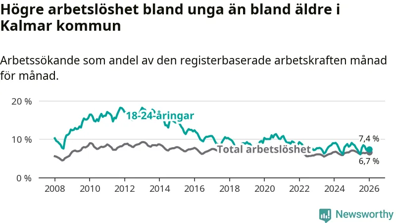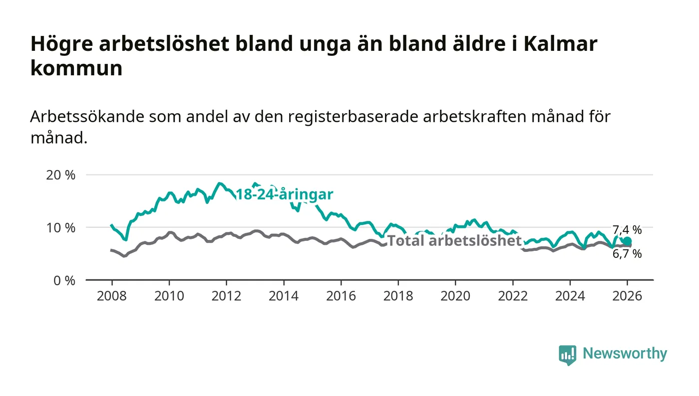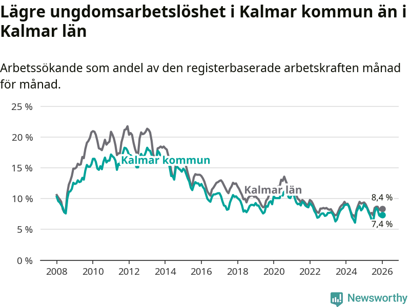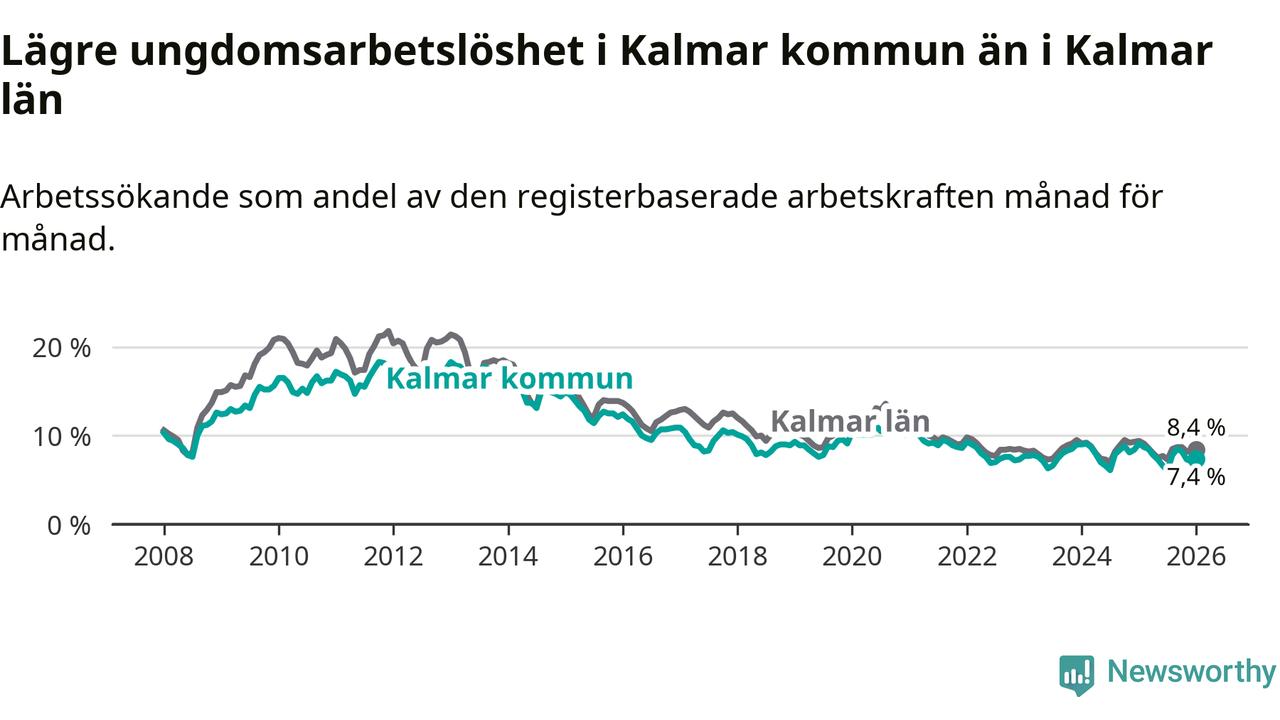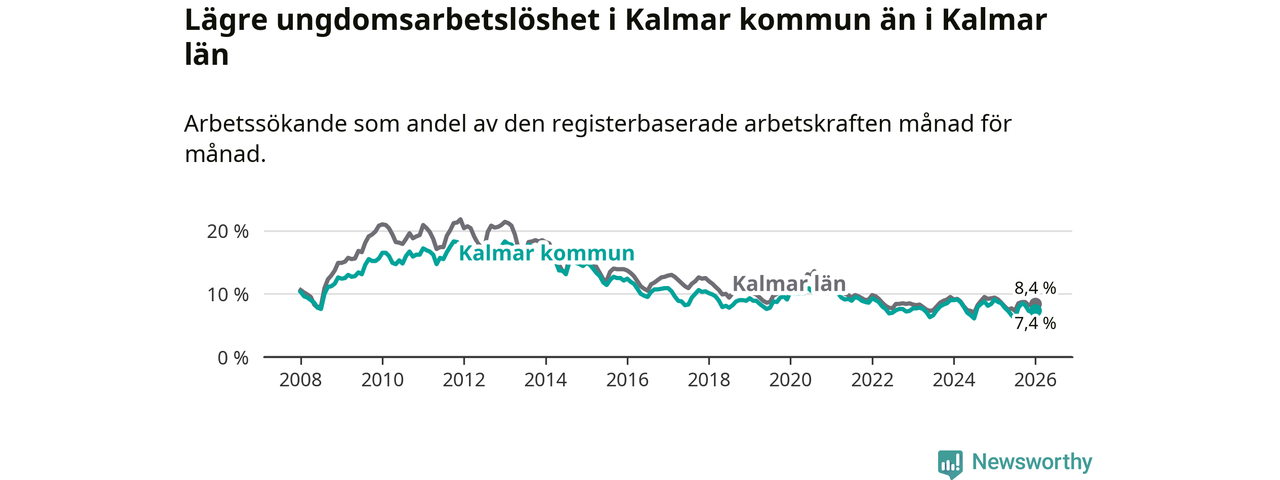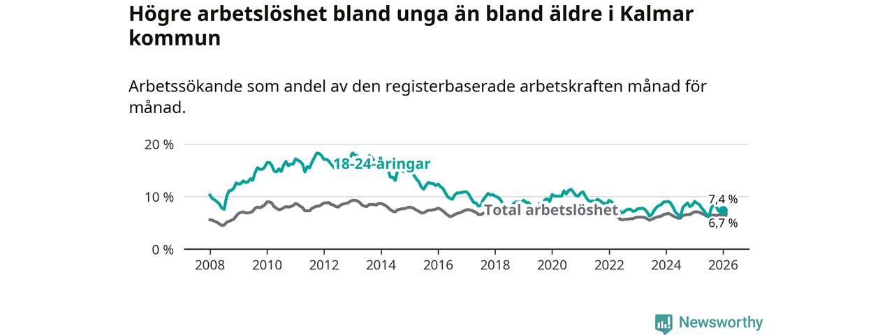 Medan Kalmar har högre total arbetslöshet än Kalmar län, ligger ungdomsarbetslösheten 1,0 procentenheter lägre i Kalmar.
