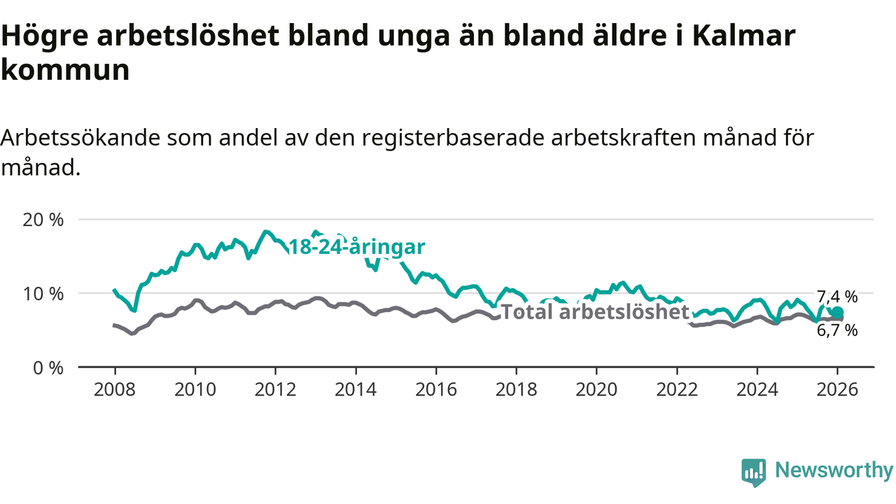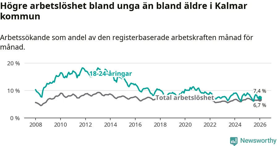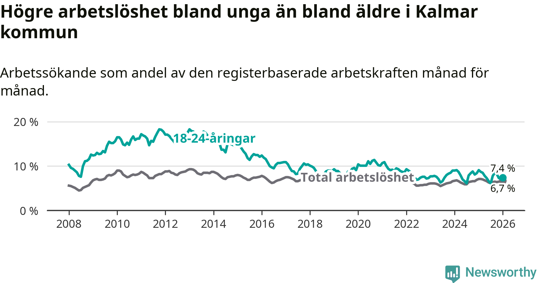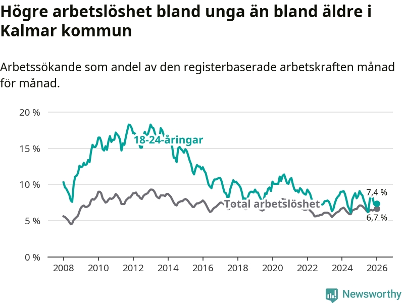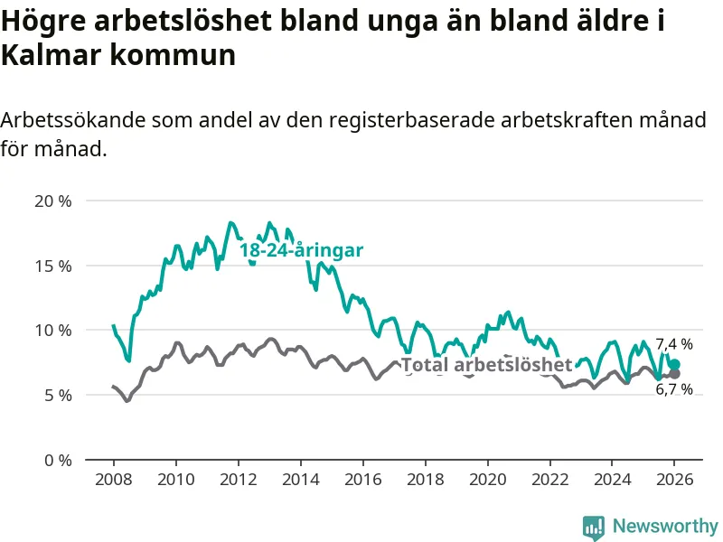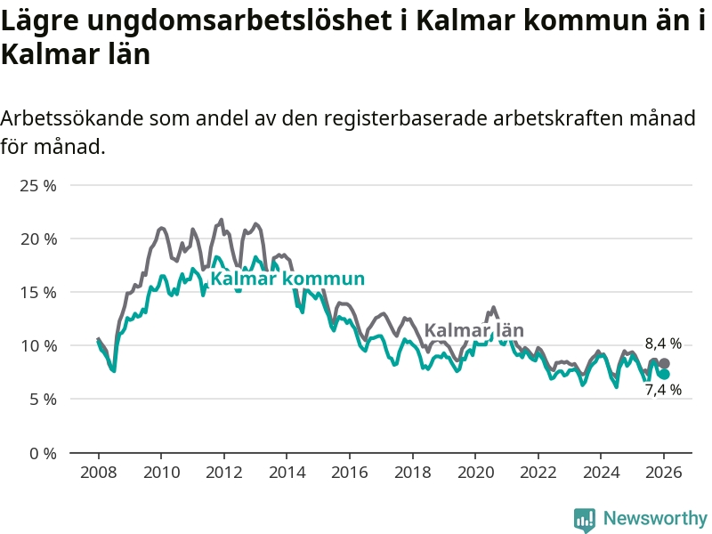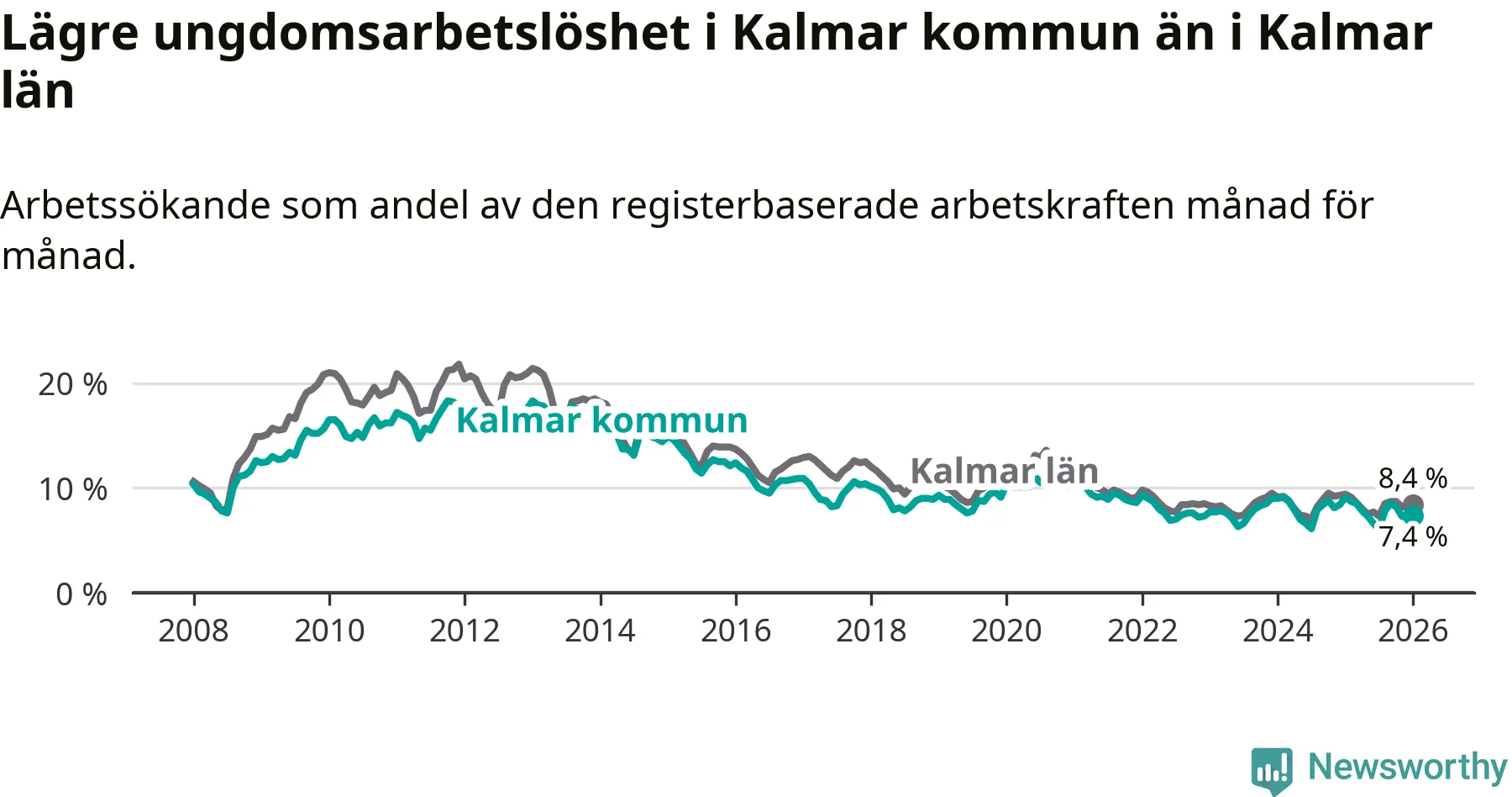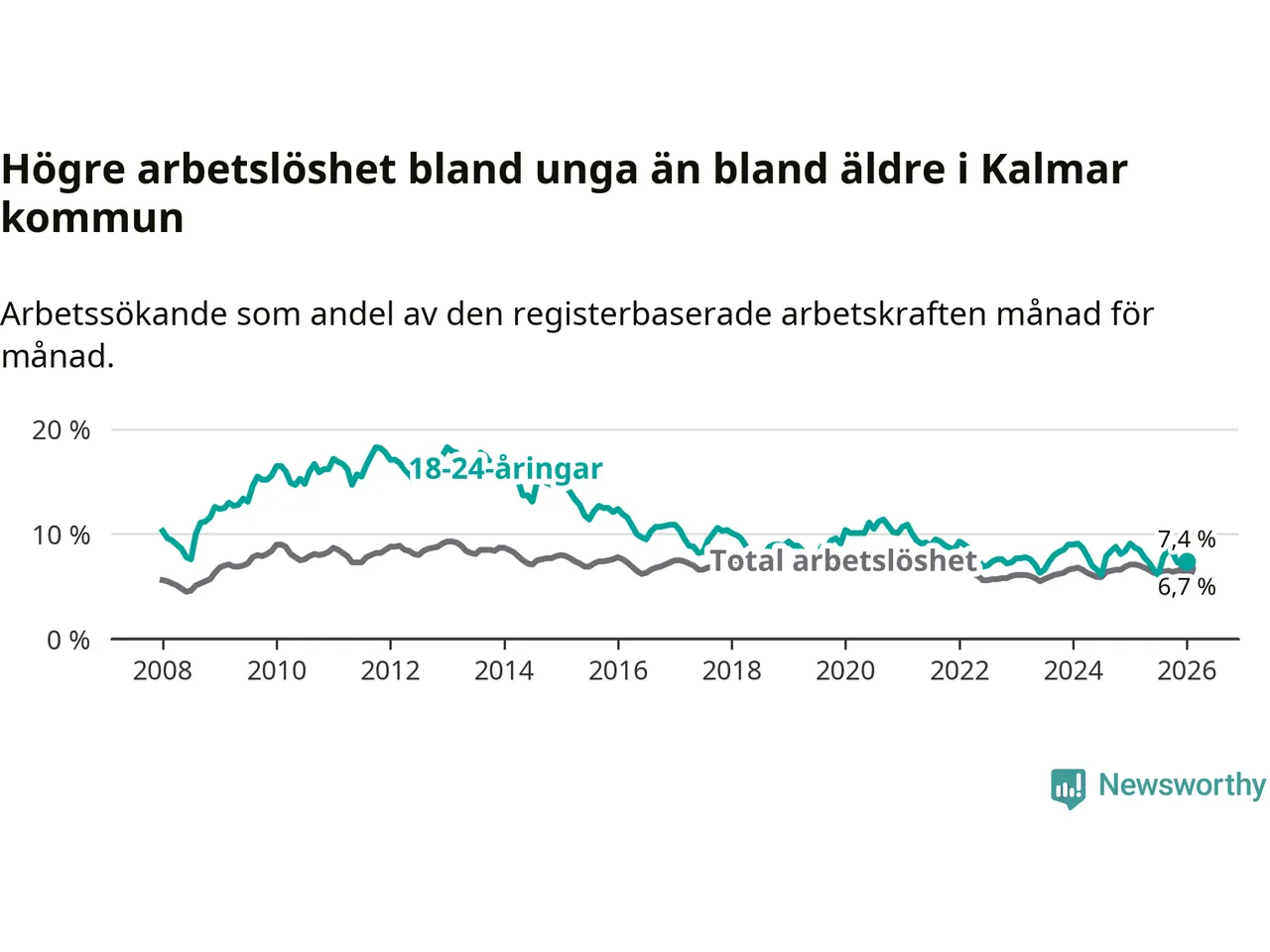 Medan Kalmar har högre total arbetslöshet än Kalmar län, ligger ungdomsarbetslösheten 1,0 procentenheter lägre i Kalmar.