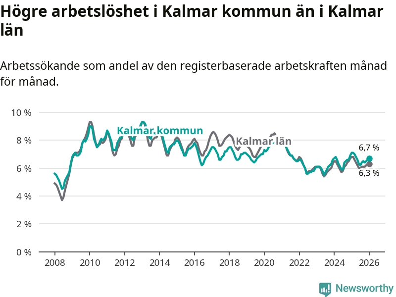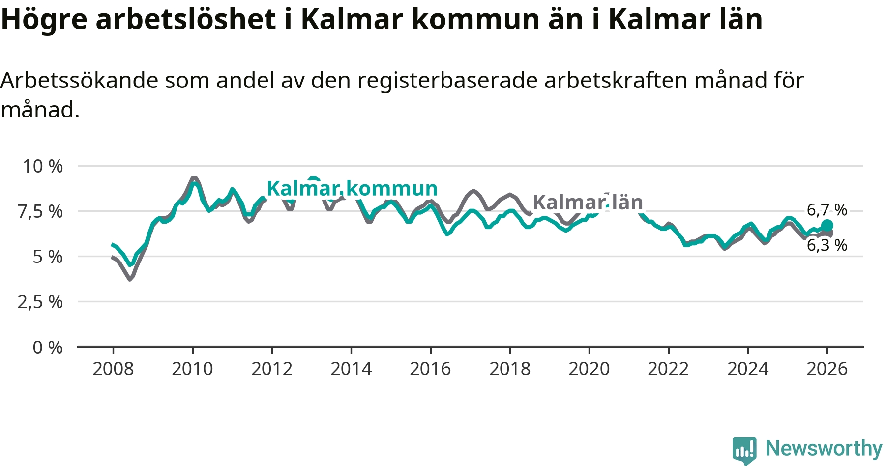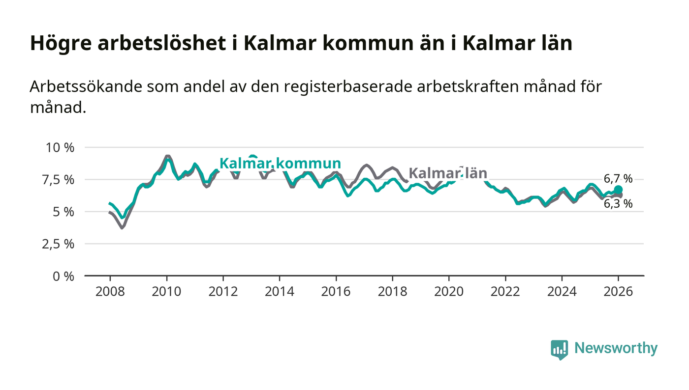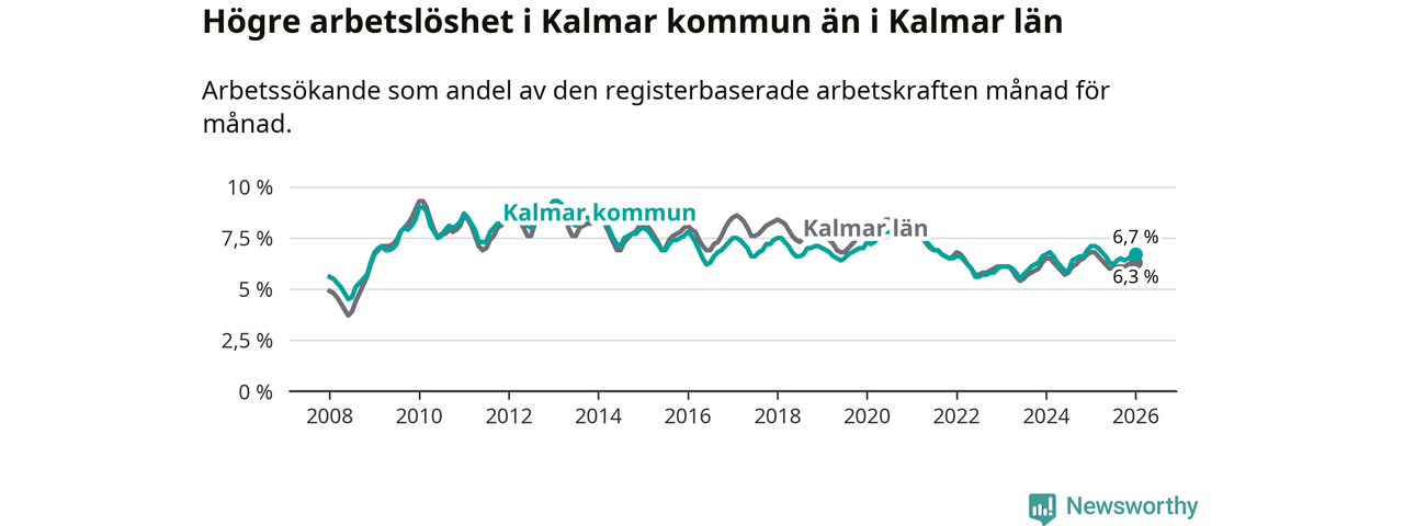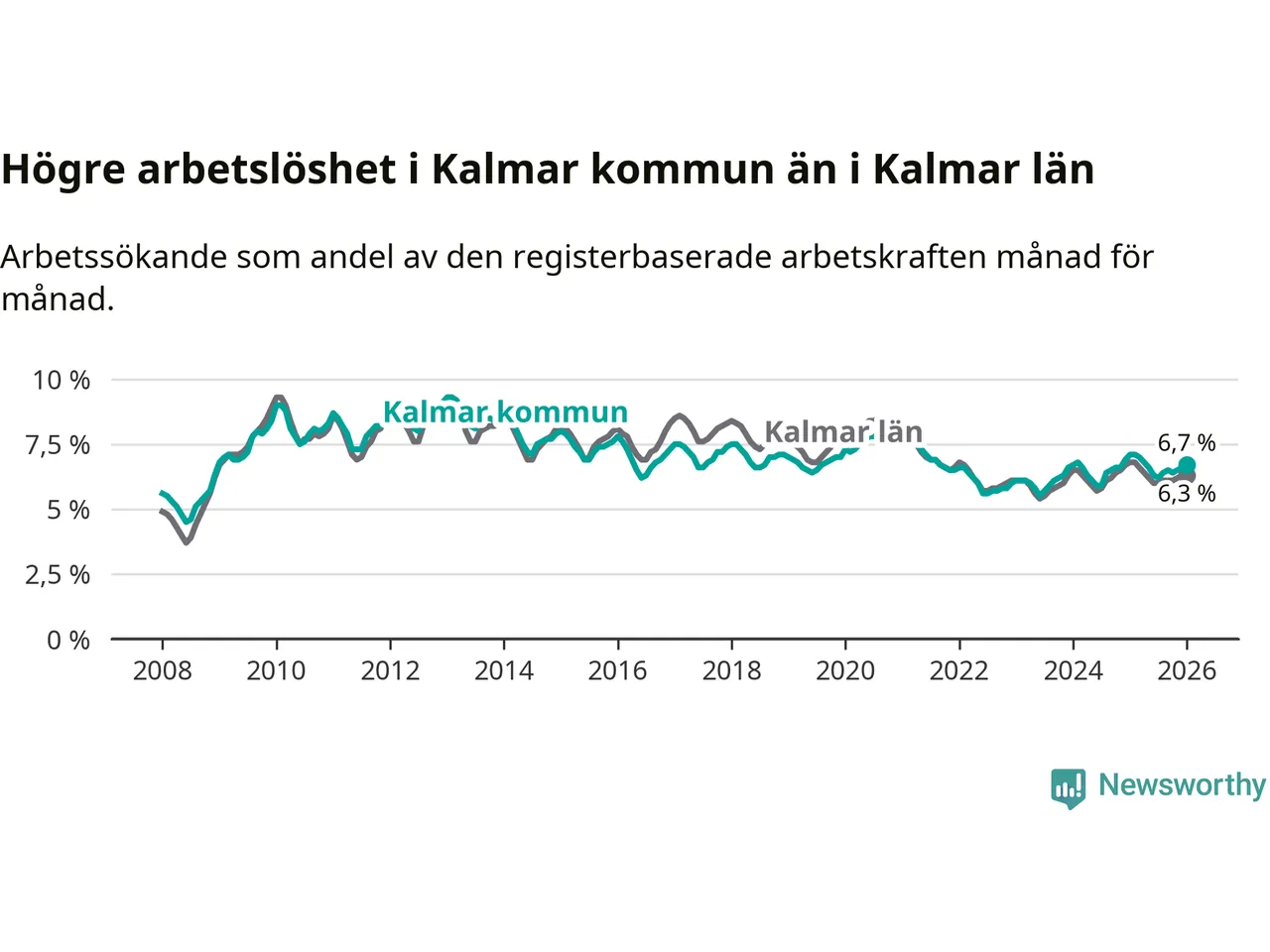 Under januari månad rapporterade Kalmar kommun en total arbetslöshet på 6,7 procent. Det är en minskning jämfört med samma tidpunkt i fjol (−0,4 procentenheter). Även i Kalmar län sjunker arbetslösheten .