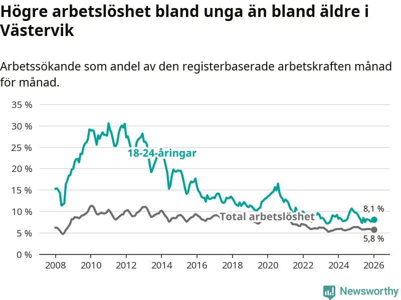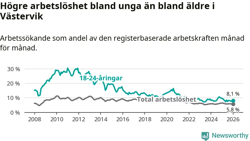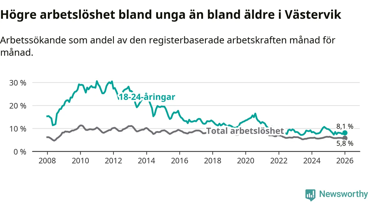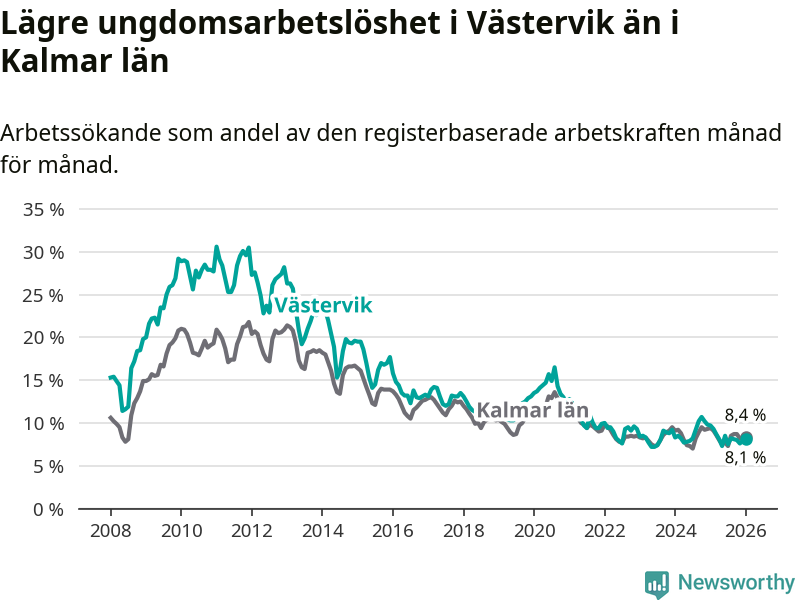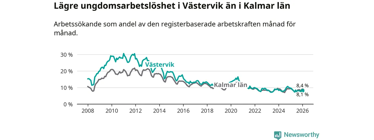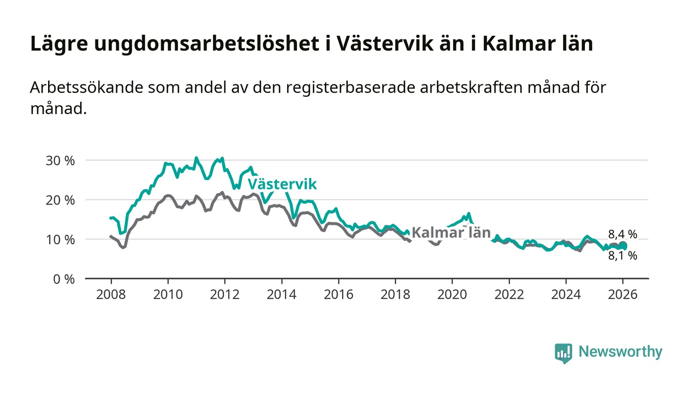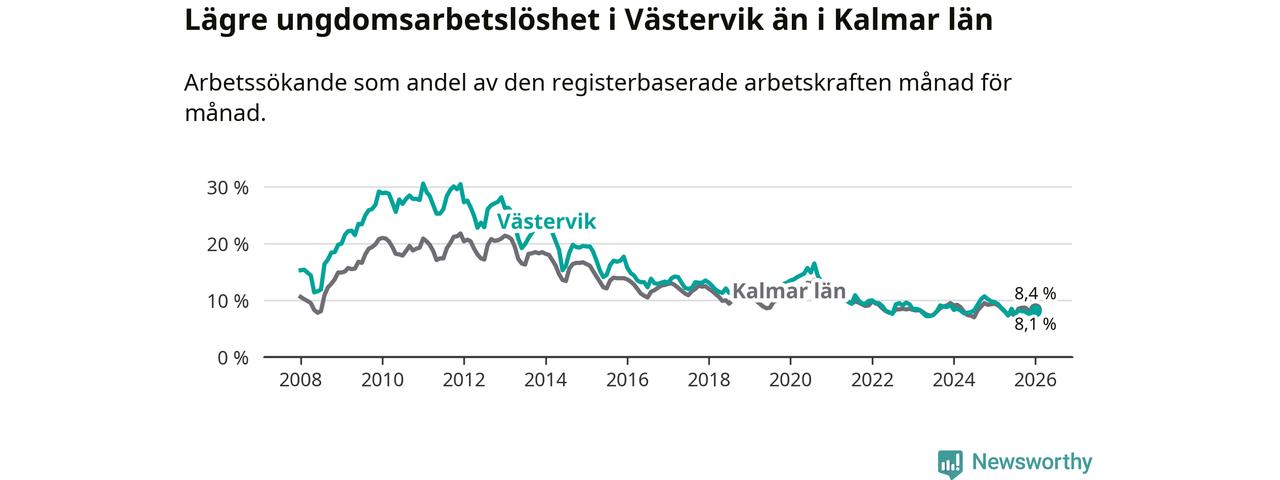 I och med den senaste månadens nedgång har de ungas arbetslöshet i Västervik sjunkit sju månader i följd (ner från 8,5 procent i juni 2025 till 8,1 procent nu).