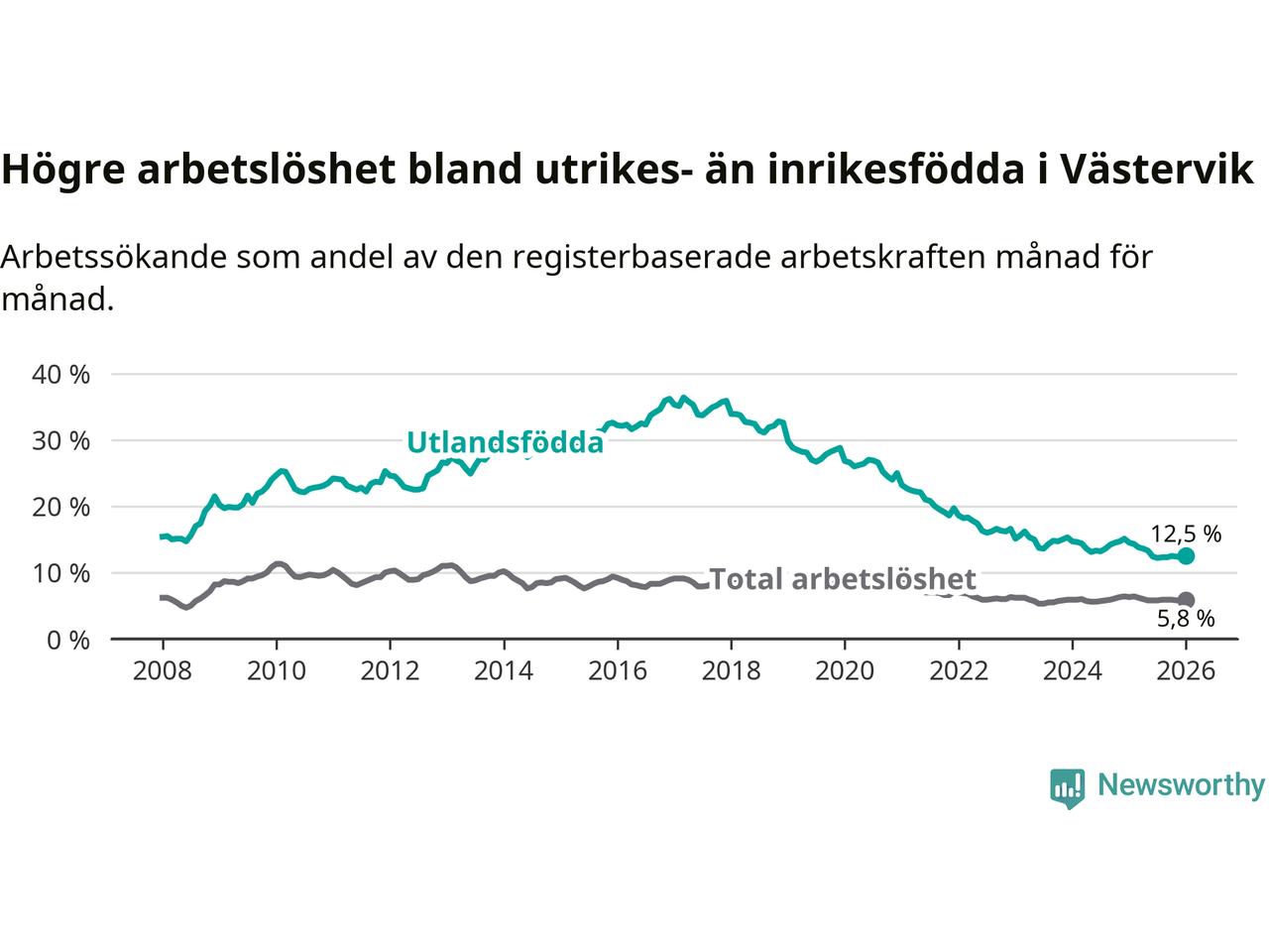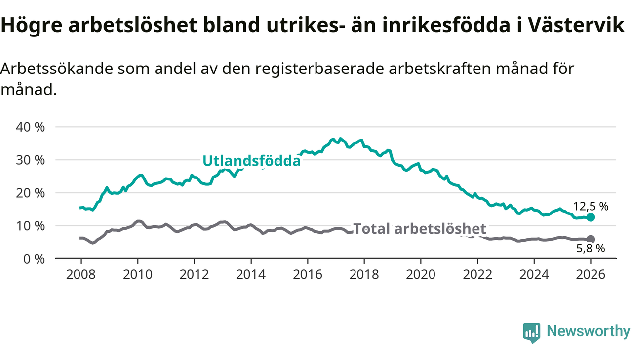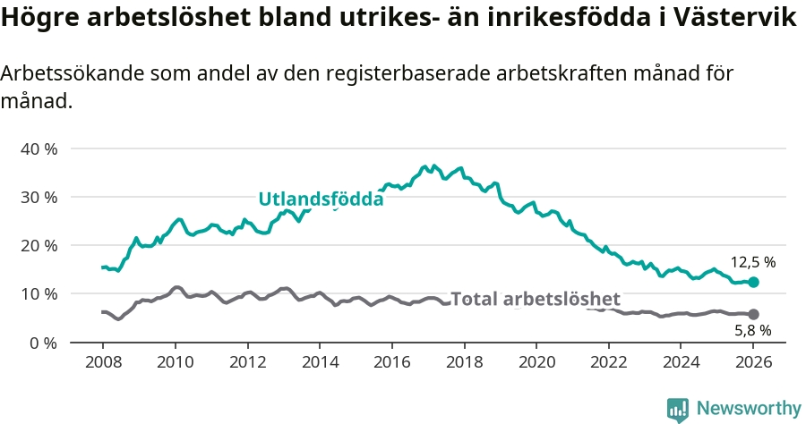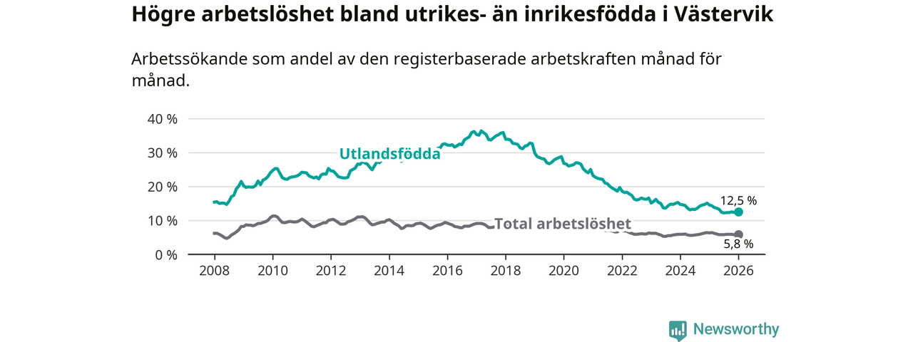 Arbetslösheten bland utlandsfödda var 12,5 procent i Västervik under januari månad, motsvarande 316 av 2 528 personer. Det är 2,0 procentenheter färre än vid samma tidpunkt i fjol (−40 om man räknar personer). Därmed är de utlandsföddas arbetslöshet lägre än vid samma tidpunkt i fjol för åttonde månaden i följd.