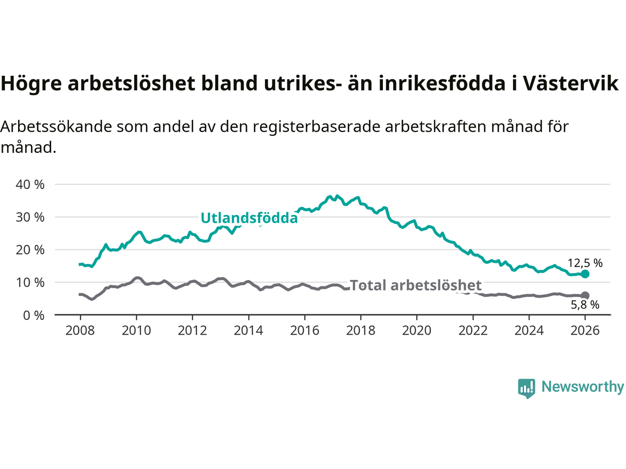 | Bland utlandsfödda | 12,5 % | −2,0 % ▼ | 15,6 % | −1,8 % ▼ | 14,3 % | −1,5 % ▼ |