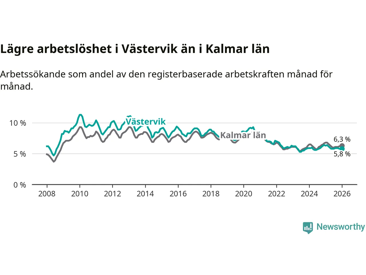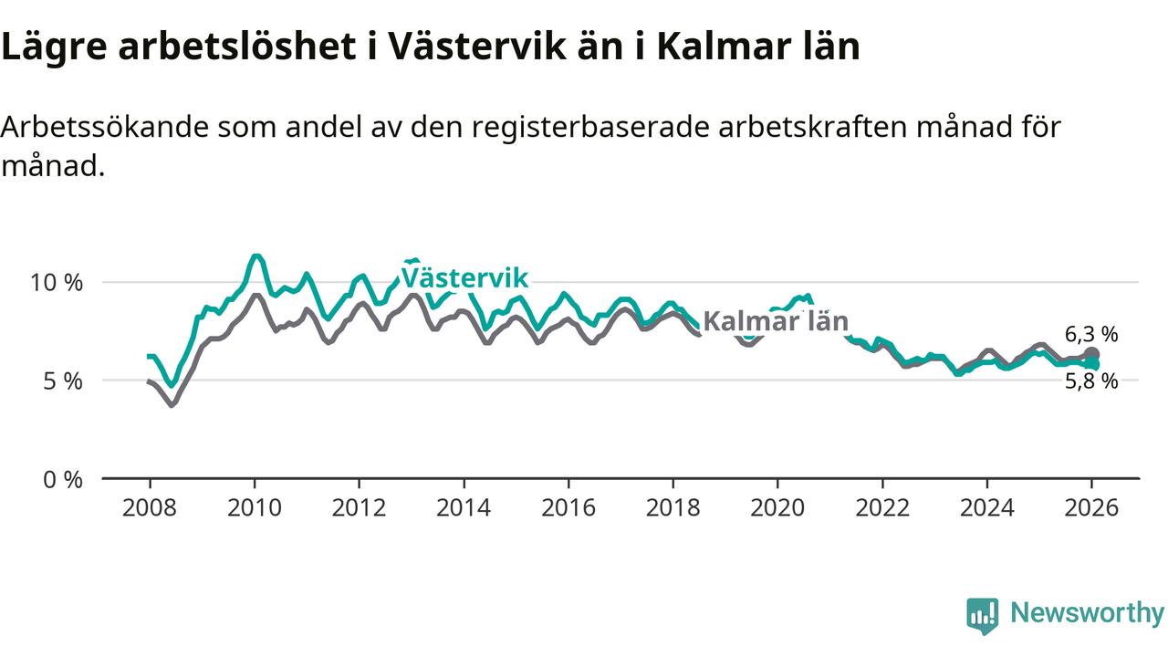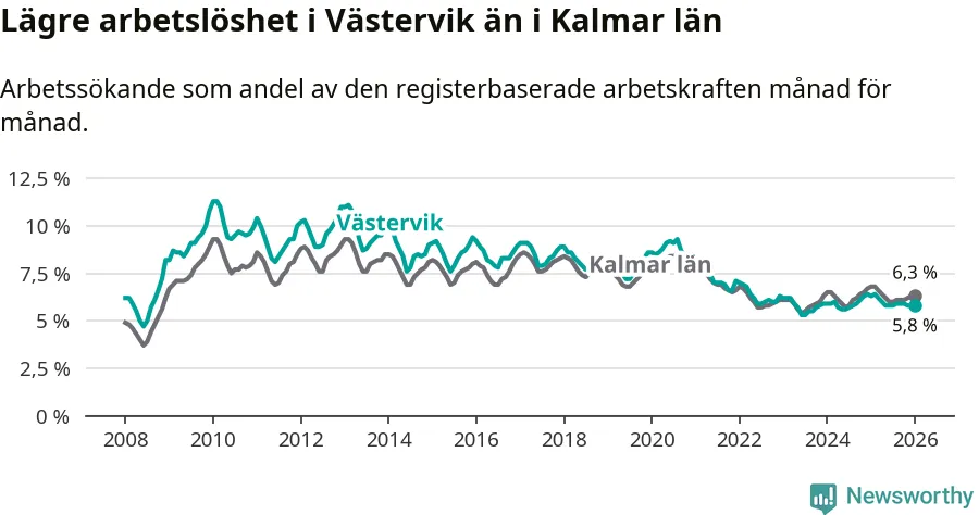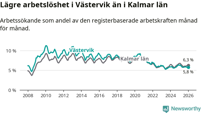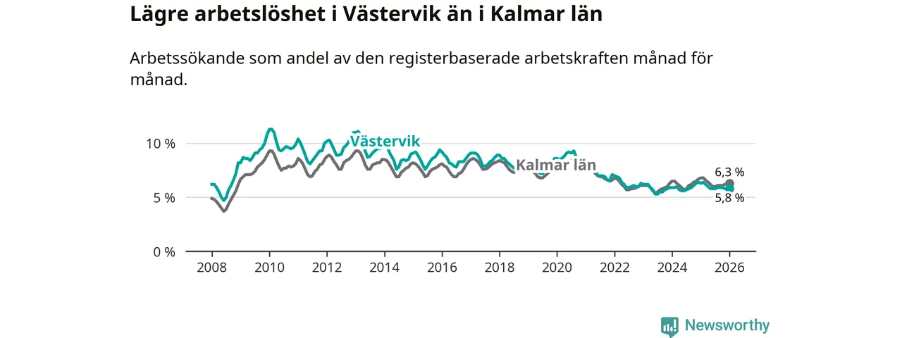 Under januari månad rapporterade Västerviks kommun en total arbetslöshet på 5,8 procent. Det är en minskning jämfört med samma tidpunkt i fjol (−0,5 procentenheter). Även i Kalmar län sjunker arbetslösheten .
