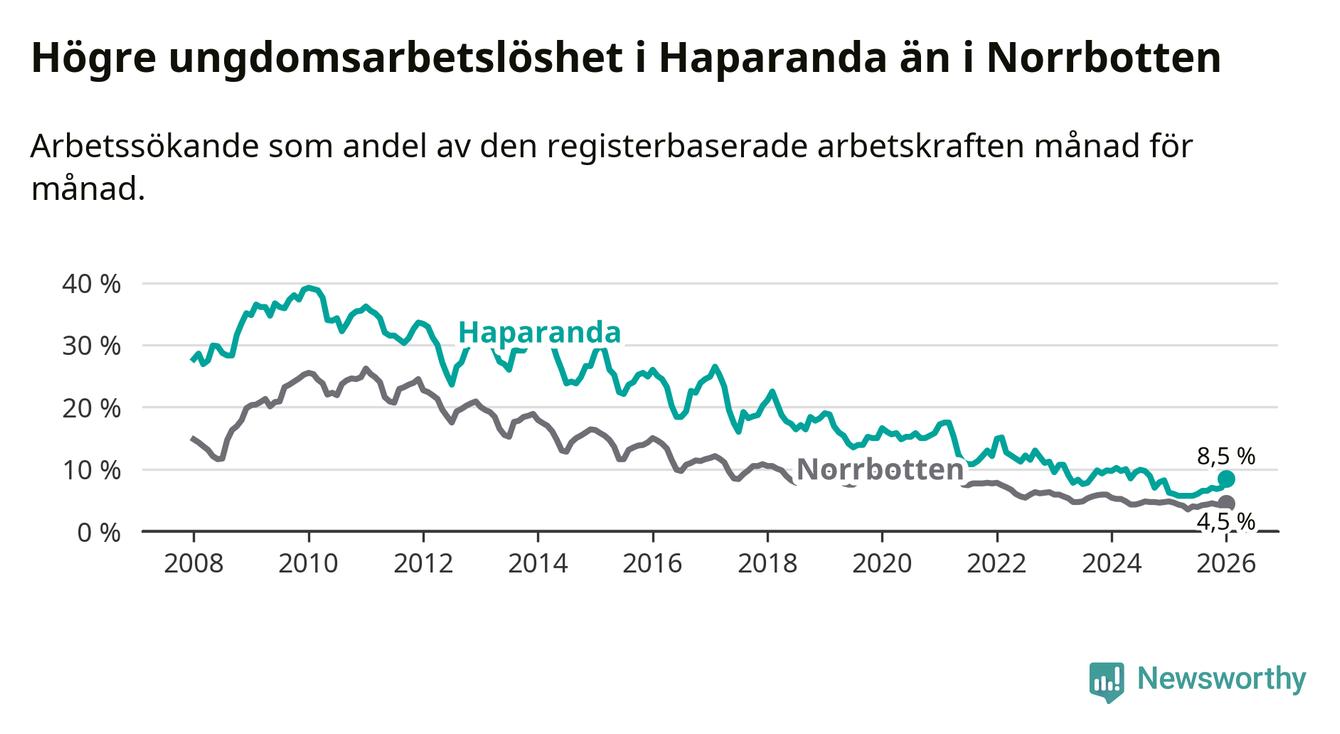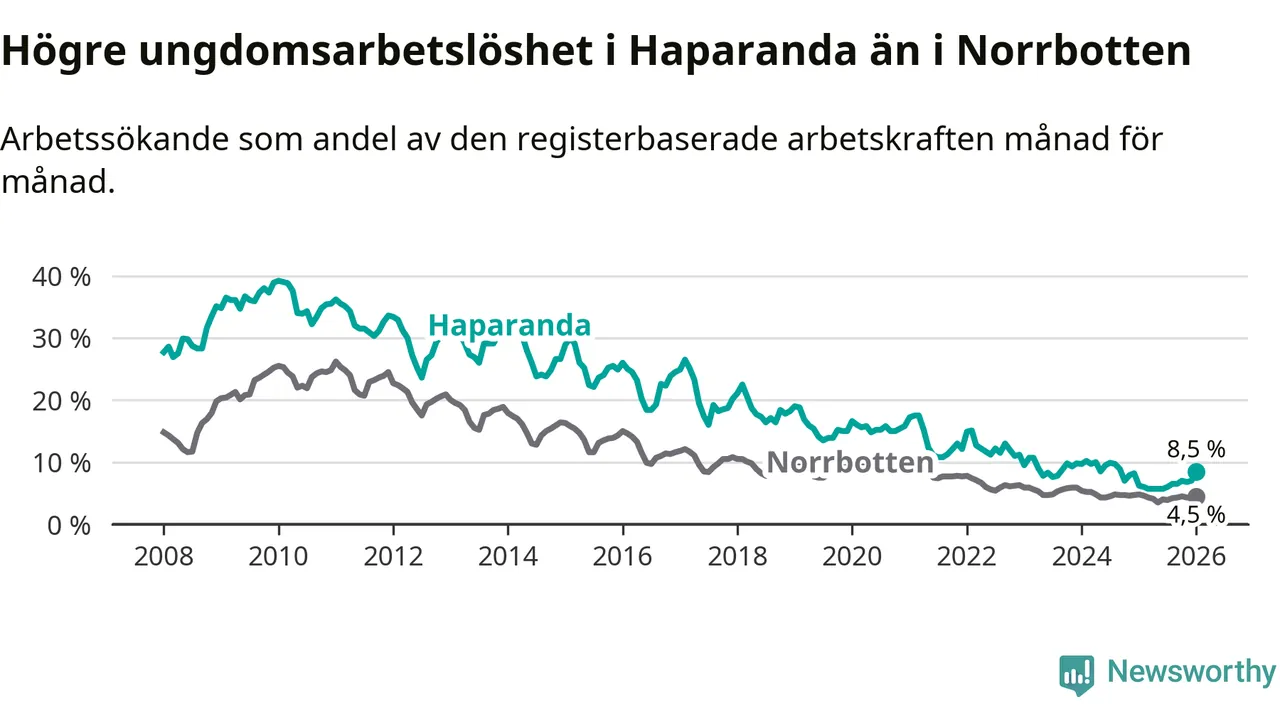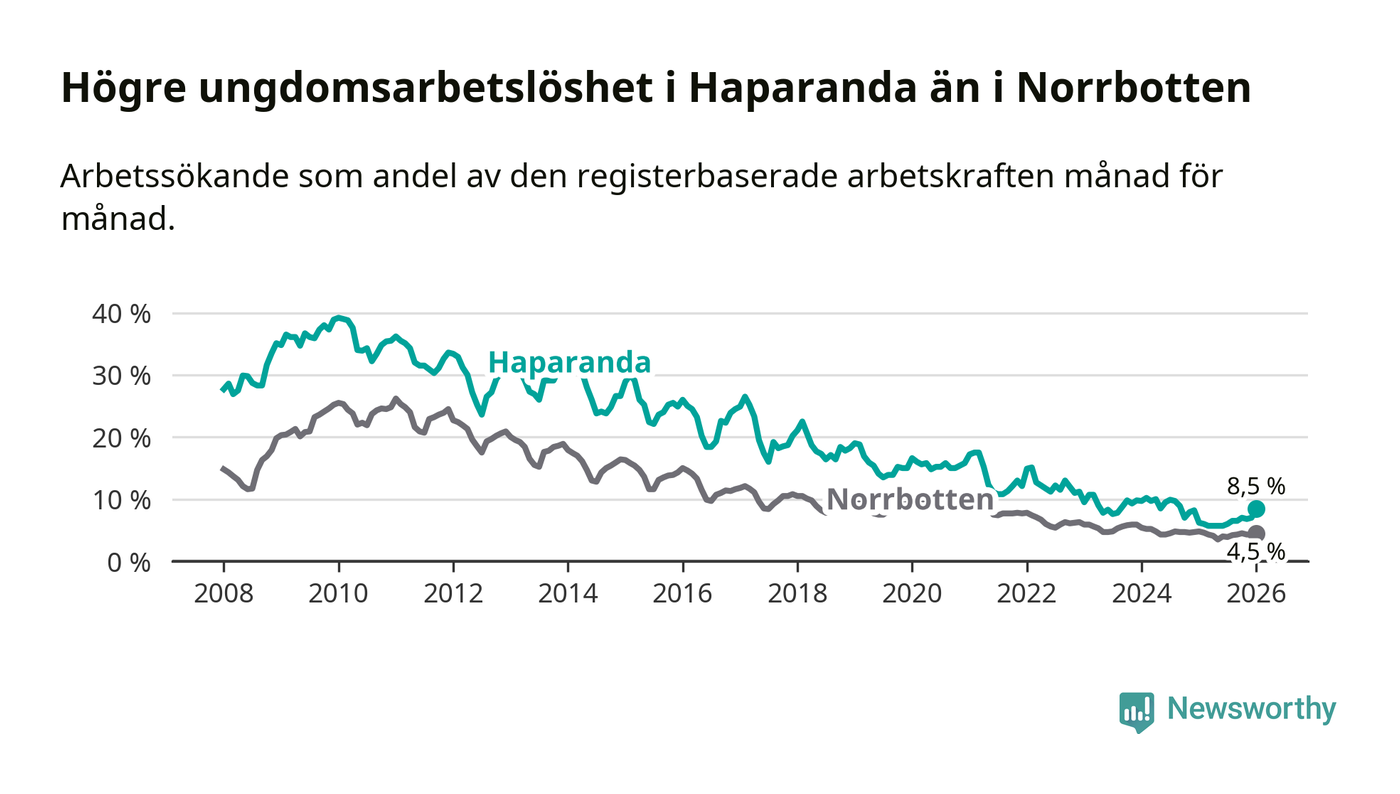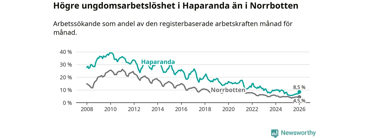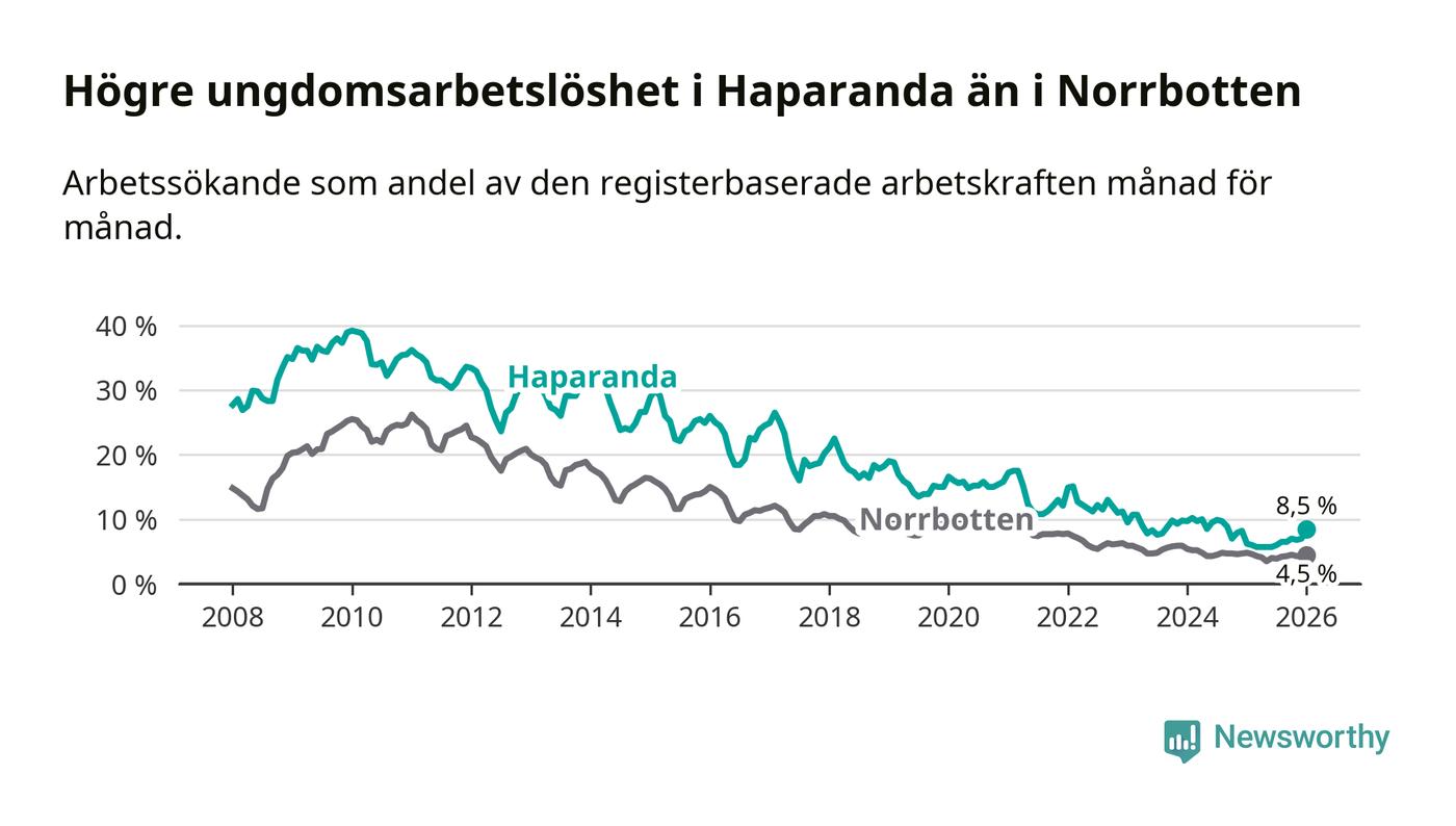 Precis som den totala arbetslösheten ligger ungdomsarbetslösheten i Haparanda högre än i Norrbotten som helhet. Skillnaden mellan kommunen och länet är 4,0 procentenheter.