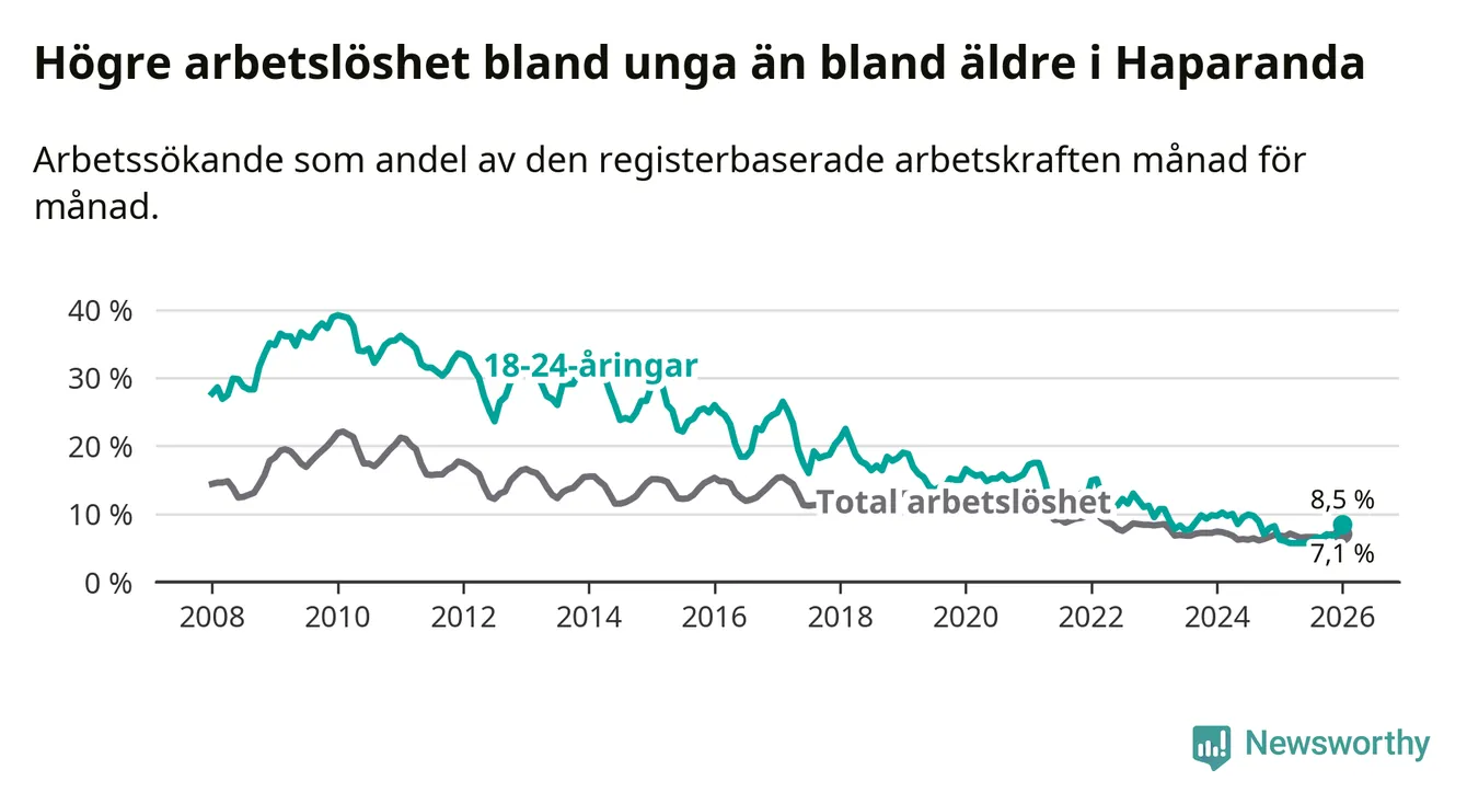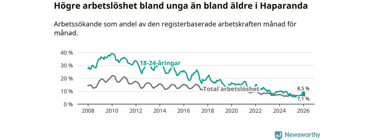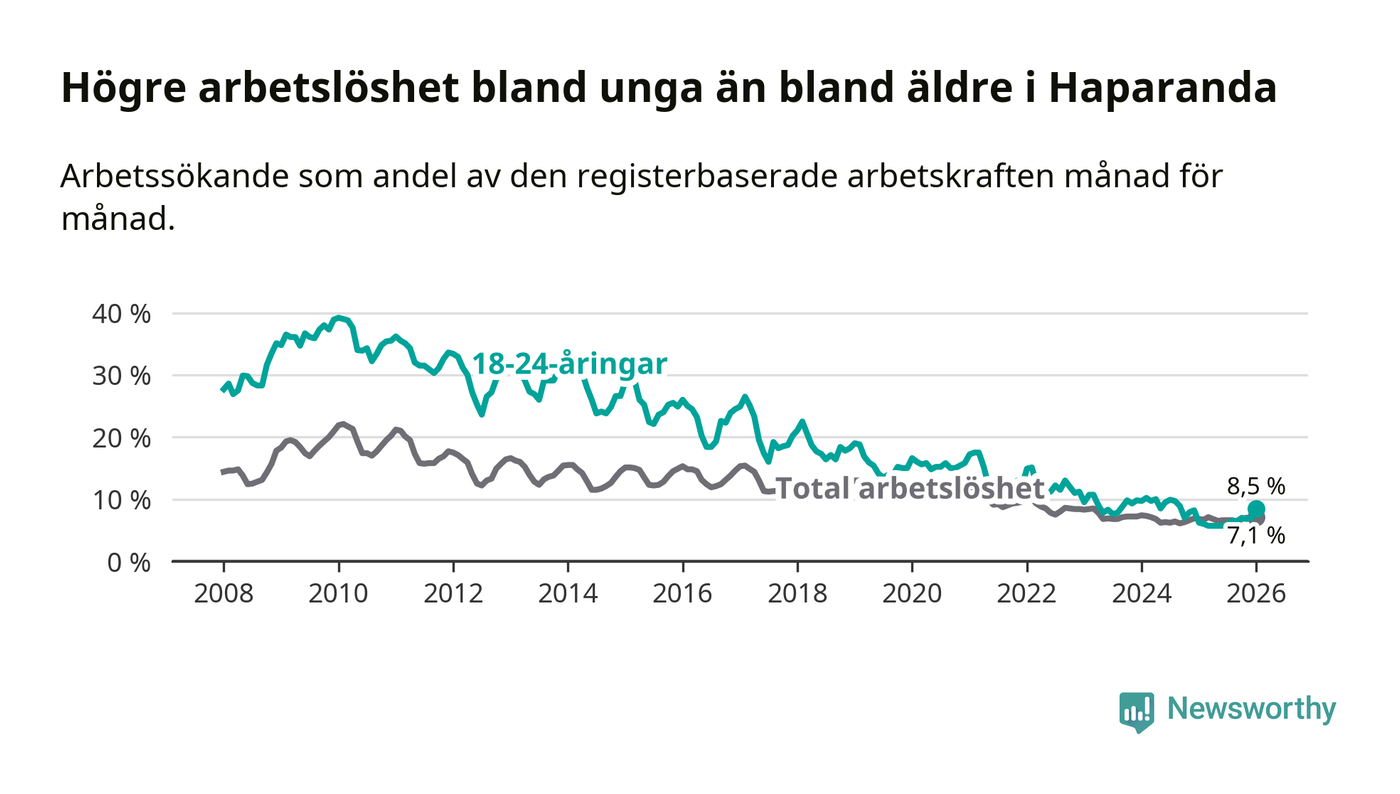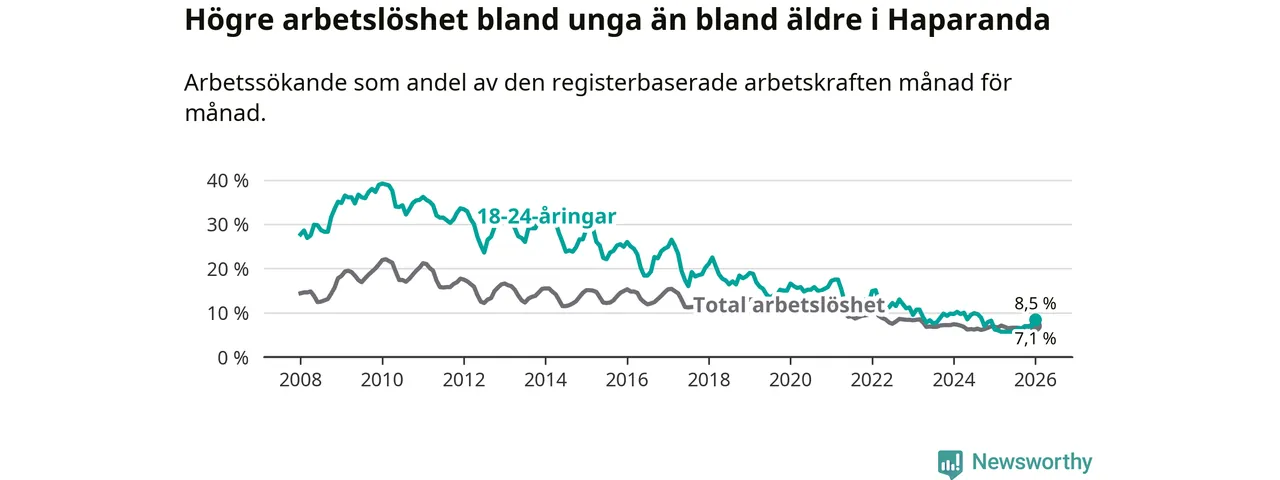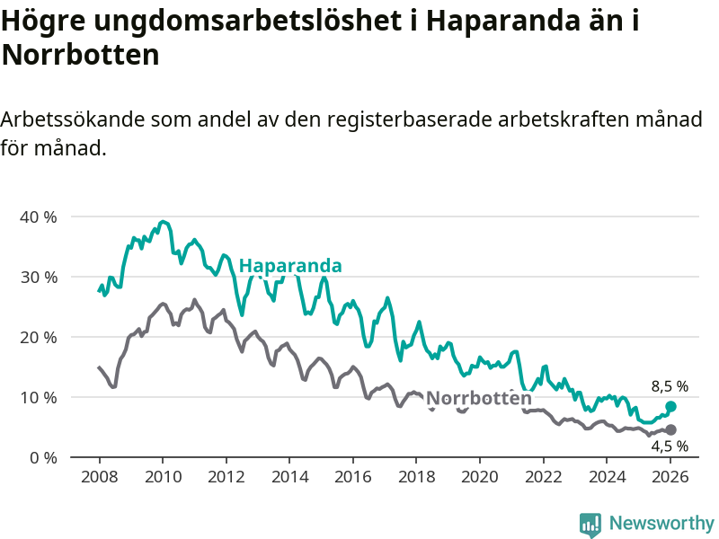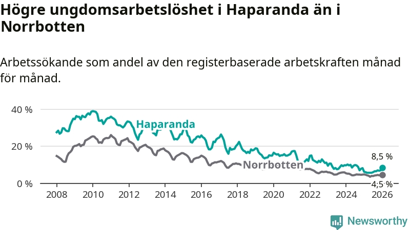 Precis som den totala arbetslösheten ligger ungdomsarbetslösheten i Haparanda högre än i Norrbotten som helhet. Skillnaden mellan kommunen och länet är 4,0 procentenheter.
