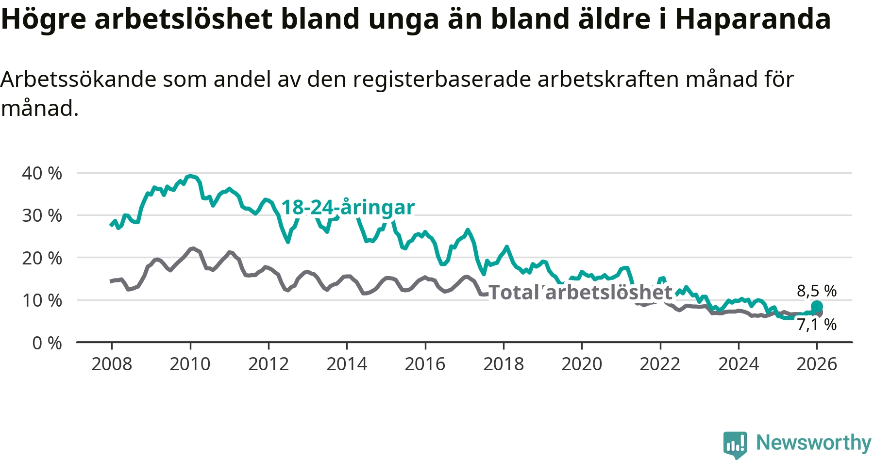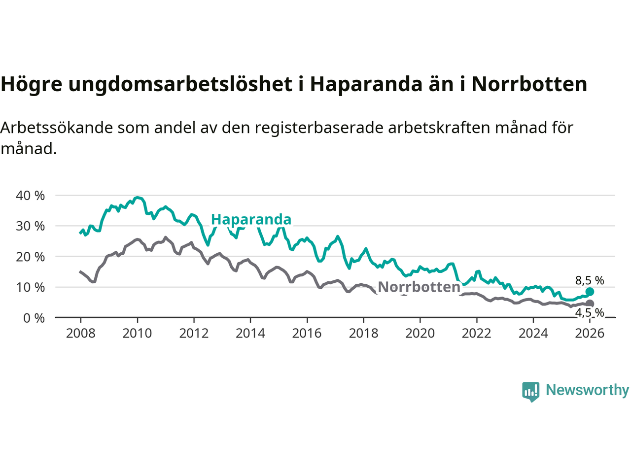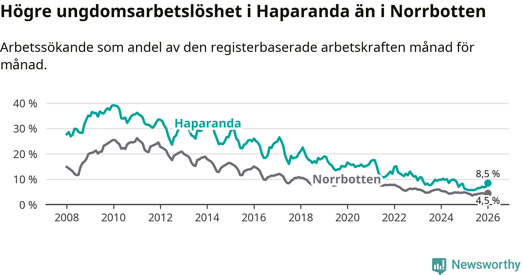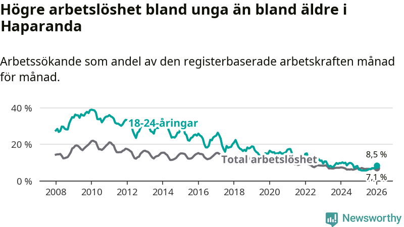 Precis som den totala arbetslösheten ligger ungdomsarbetslösheten i Haparanda högre än i Norrbotten som helhet. Skillnaden mellan kommunen och länet är 4,0 procentenheter.