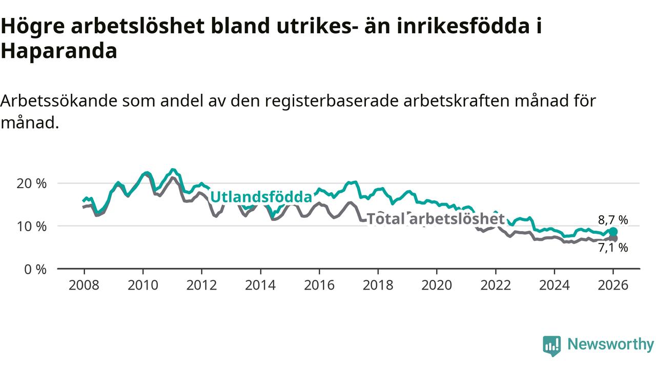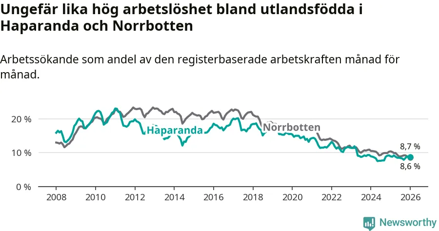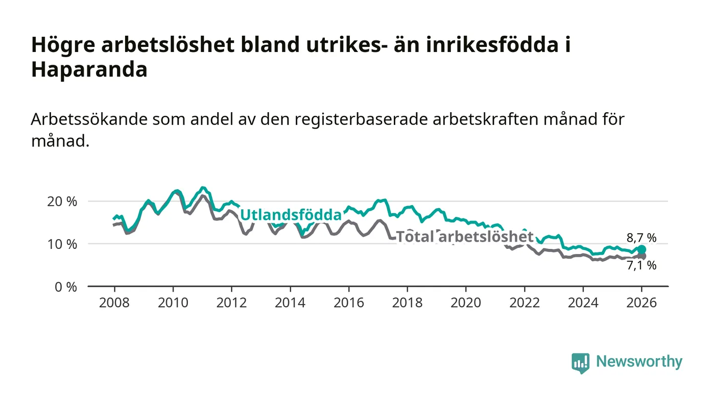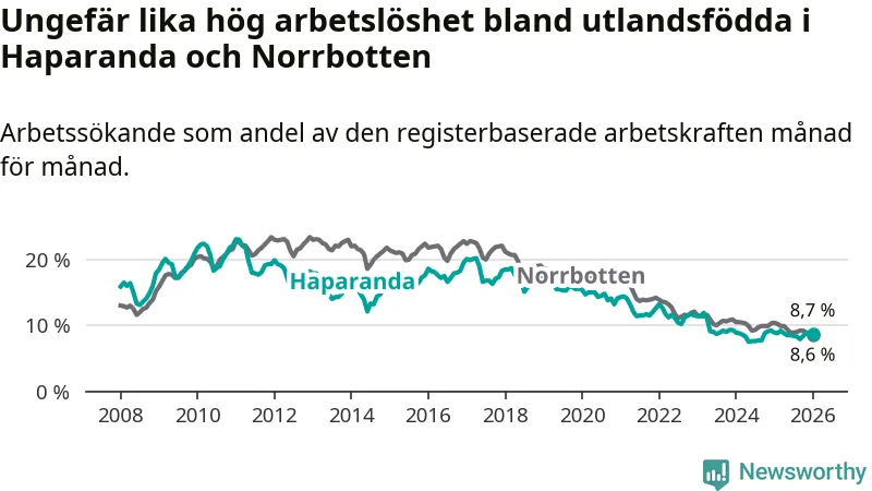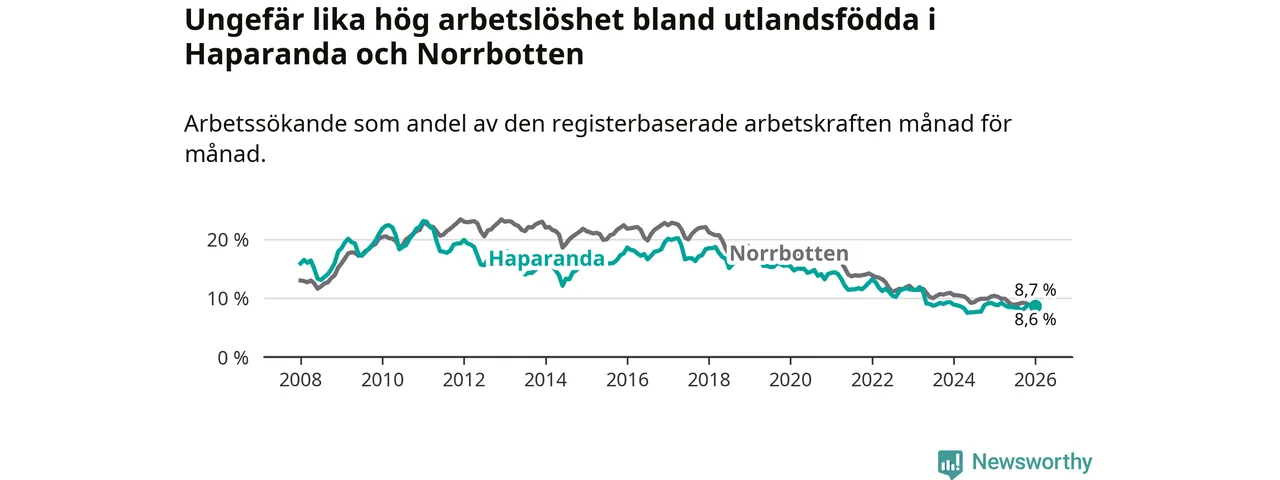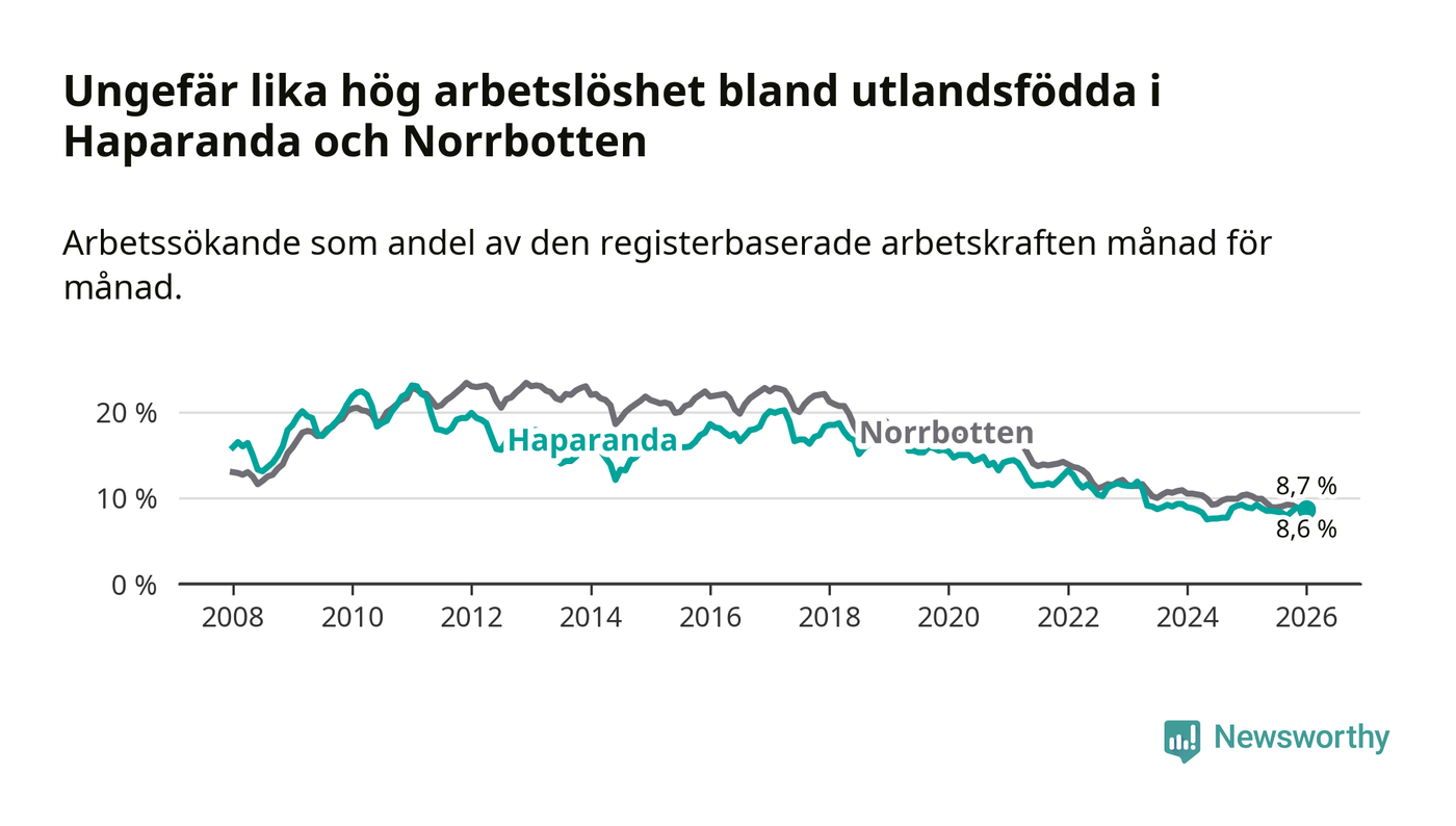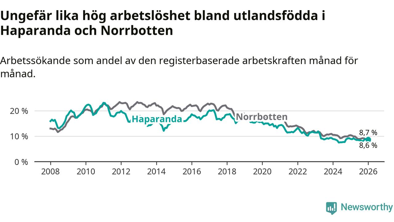 Arbetslösheten bland utlandsfödda var 8,7 procent i Haparanda under januari månad, motsvarande 115 av 1 322 personer. Det är 0,2 procentenheter färre än vid samma tidpunkt i fjol (−2 om man räknar personer).