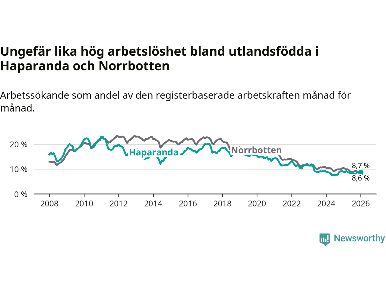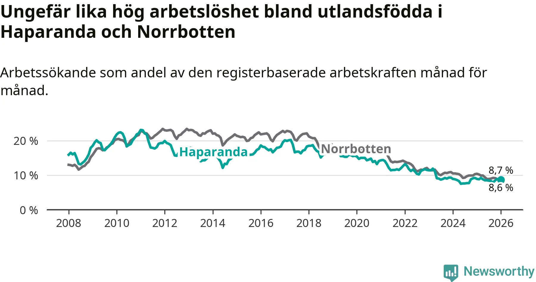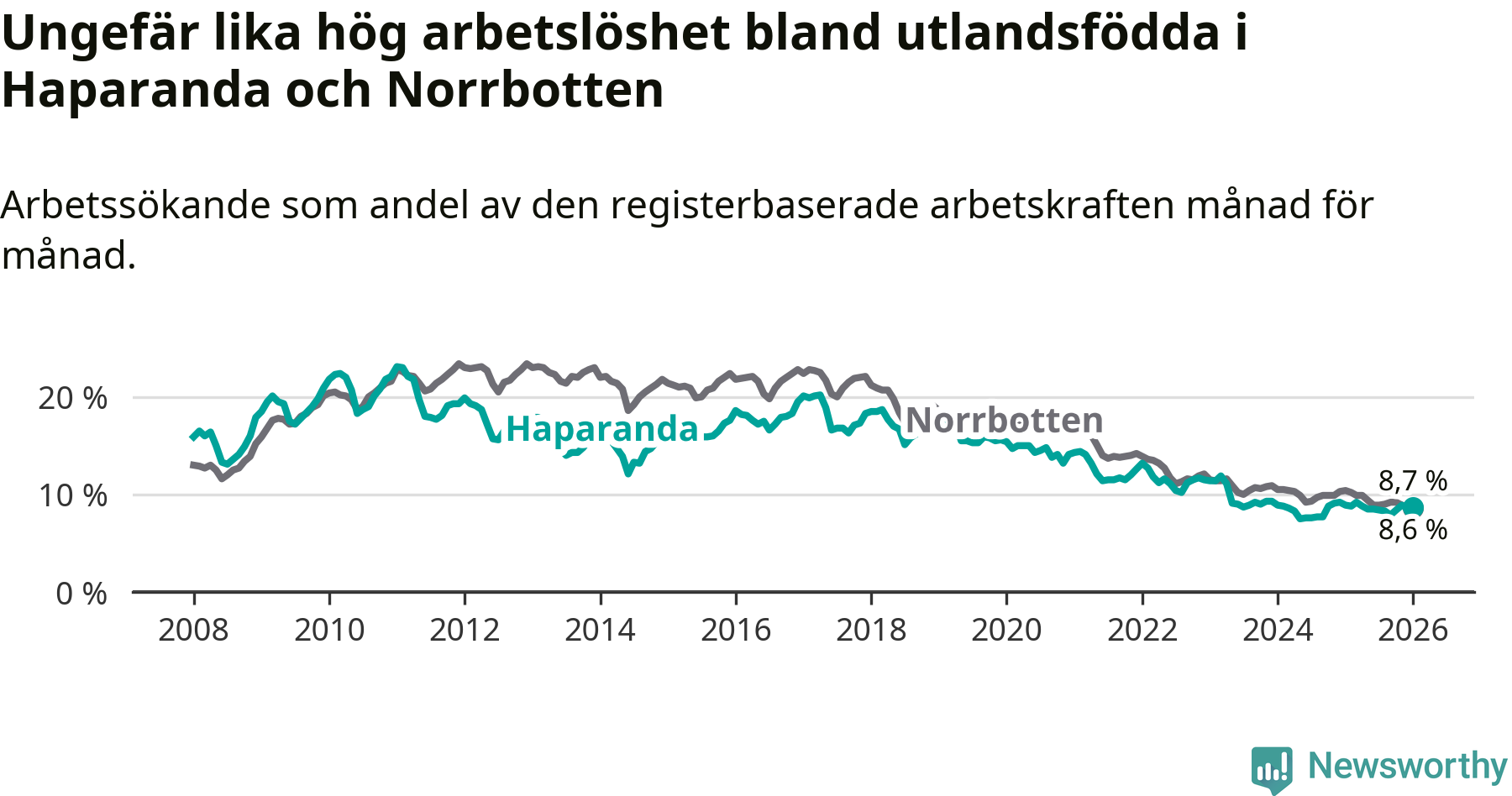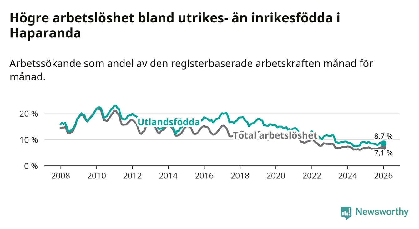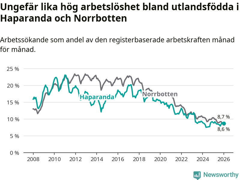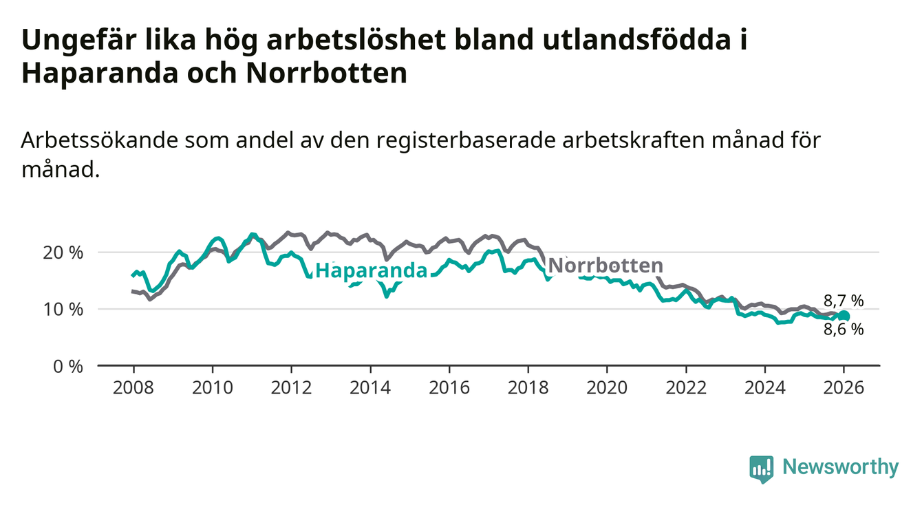 Arbetslösheten bland utlandsfödda var 8,7 procent i Haparanda under januari månad, motsvarande 115 av 1 322 personer. Det är 0,2 procentenheter färre än vid samma tidpunkt i fjol (−2 om man räknar personer).